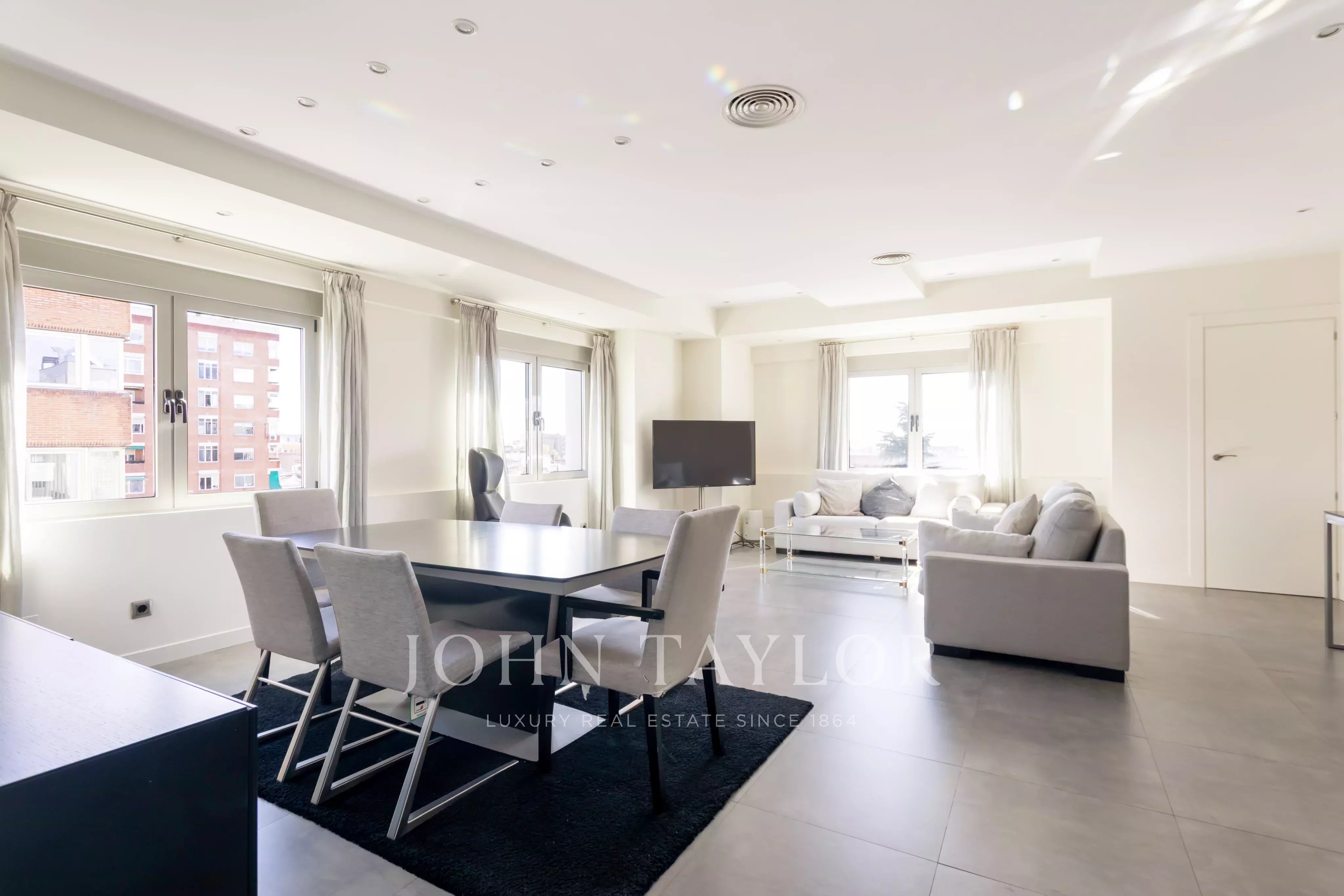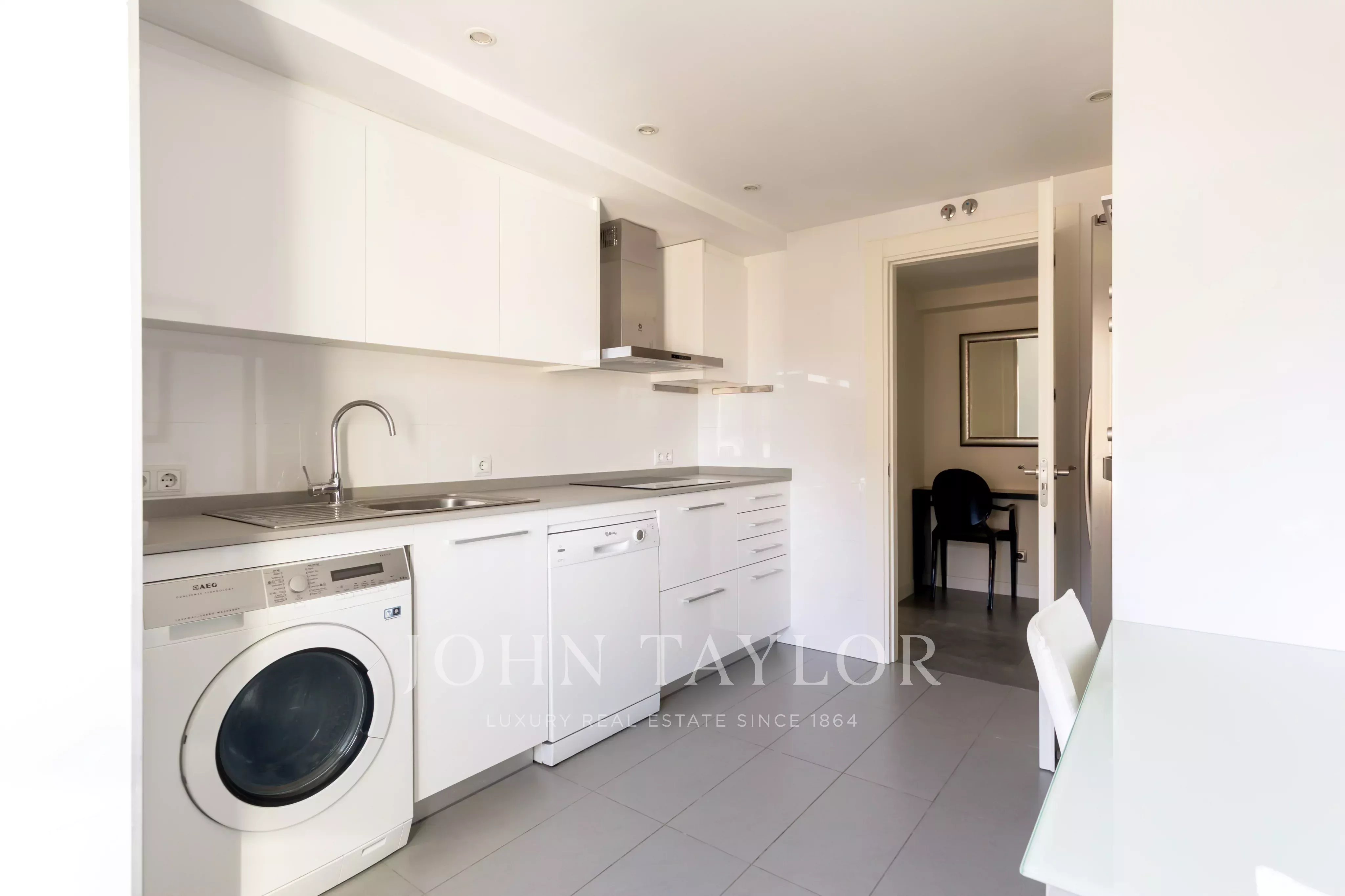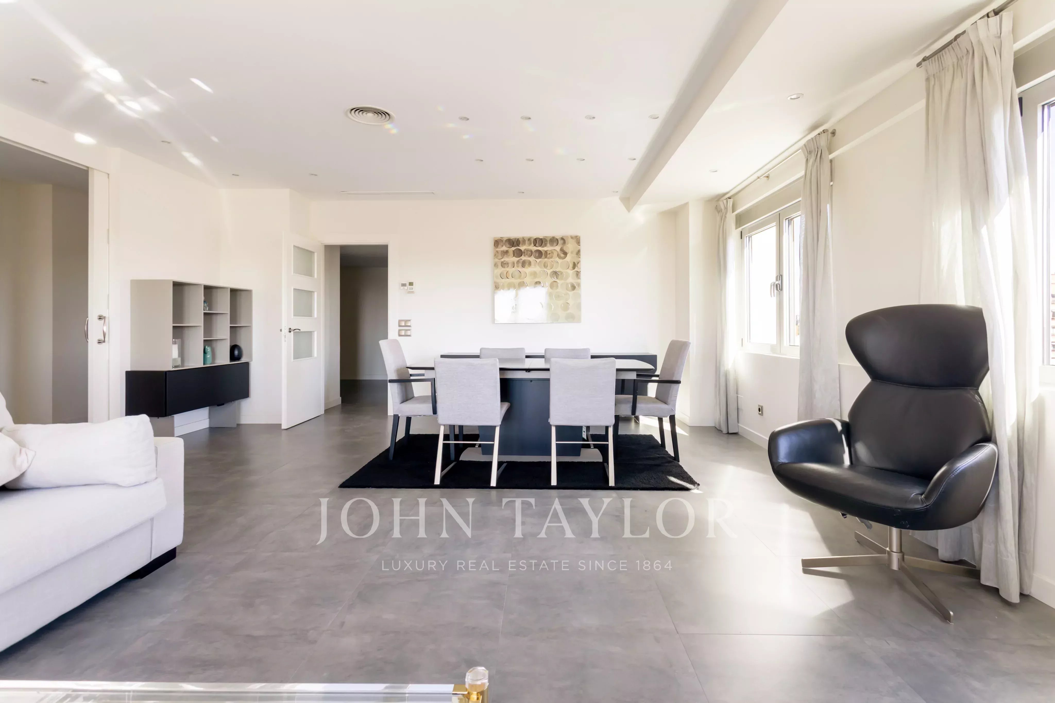 Mit einer ungefähren Wohnfläche von 120m² plus 60m² Terrasse, verteilt auf der 6. Etage in 3 Schlafzimmer und 3 Bäder, zwei davon en-suite, ein wunderbares Wohnzimmer von 42m² und unabhängige Einbauküche.
