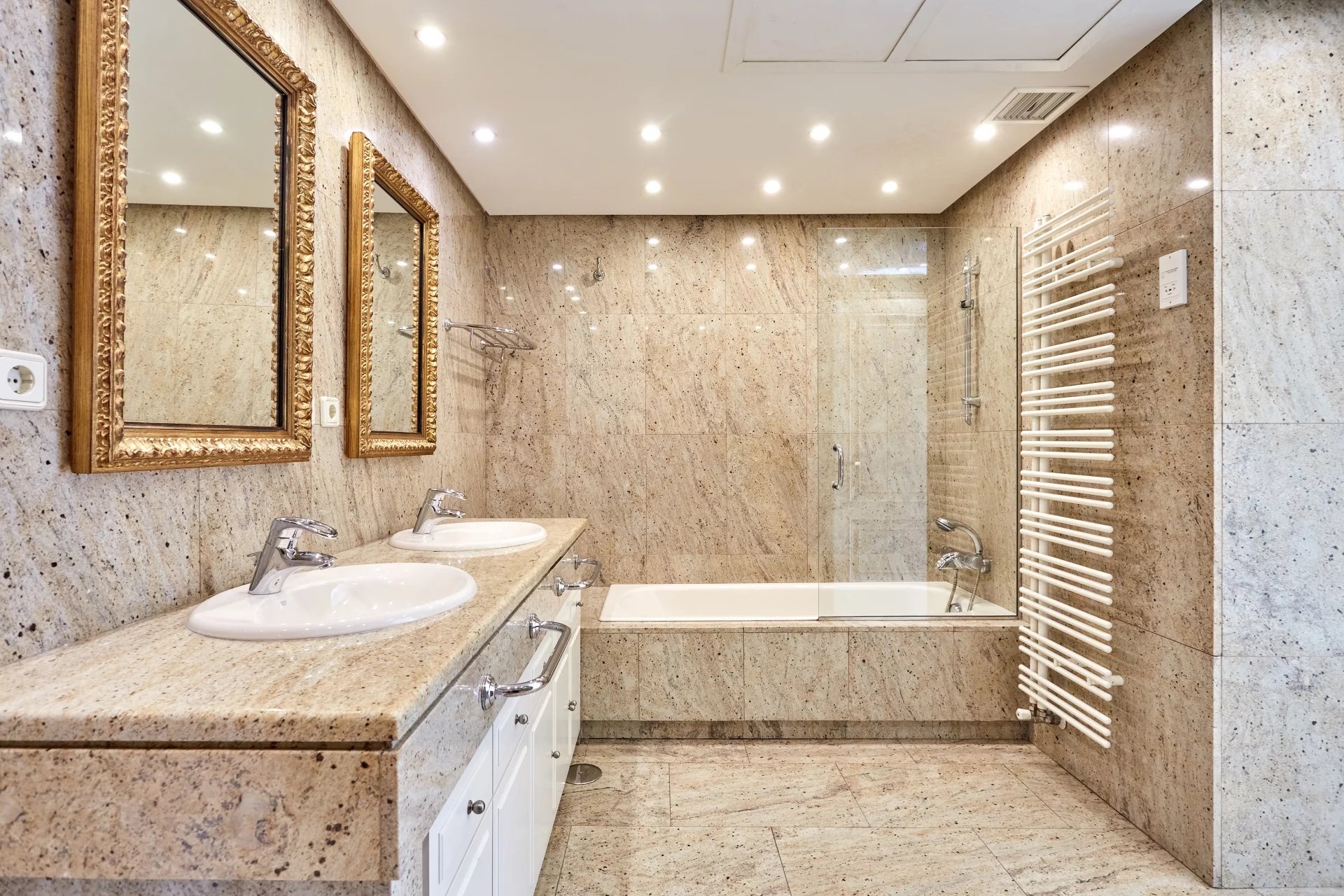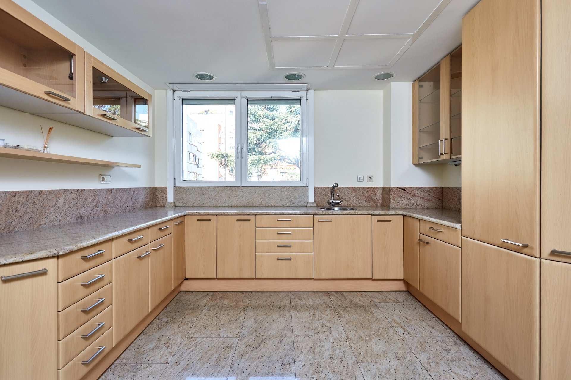 Im übrigen Bereich befinden sich drei große Schlafzimmer, alle mit eigenem Bad und großen Fenstern. Die Wohnung verfügt über zwei Tresore und zeichnet sich durch eine große Anzahl von Schränken aus, die viel Stauraum bieten.