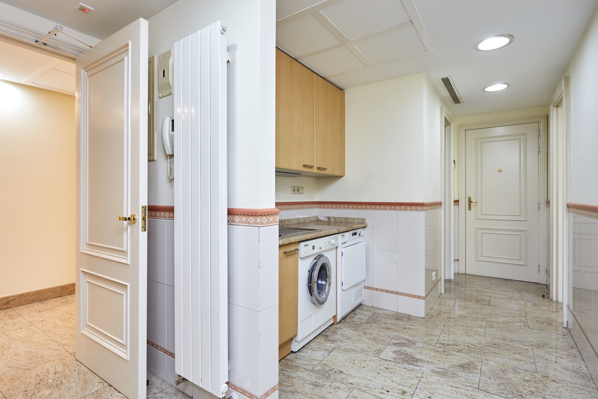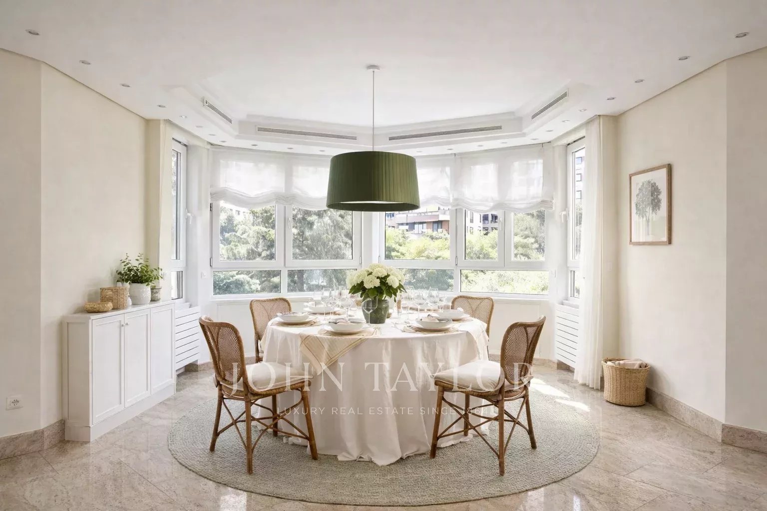 Das Anwesen, auf der vierten Etage, wird durch eine geräumige Halle, die zum Wohnzimmer und Esszimmer, beide sehr geräumig mit großen Fenstern mit Blick auf den Garten, den Pool und eine große Grünfläche zugegriffen. Neben dem Flur befindet sich ein Gäste-WC. Die Wohnung hat eine große Küche (mit separatem Bürobereich) und einen Hauswirtschaftsraum.