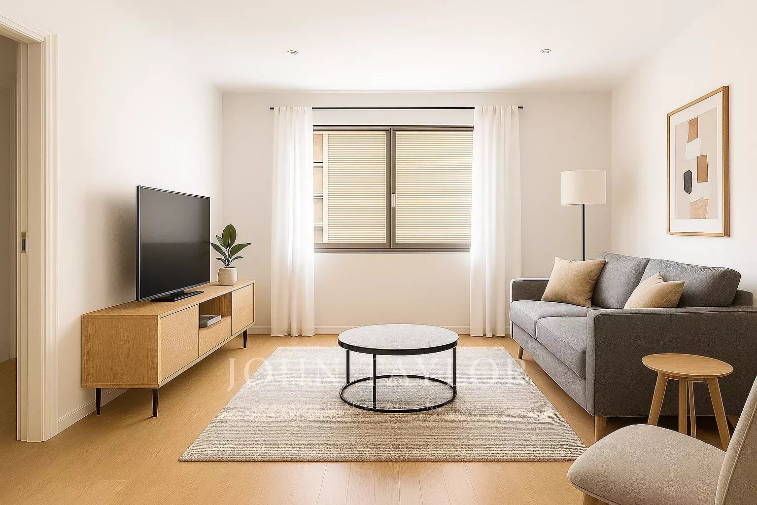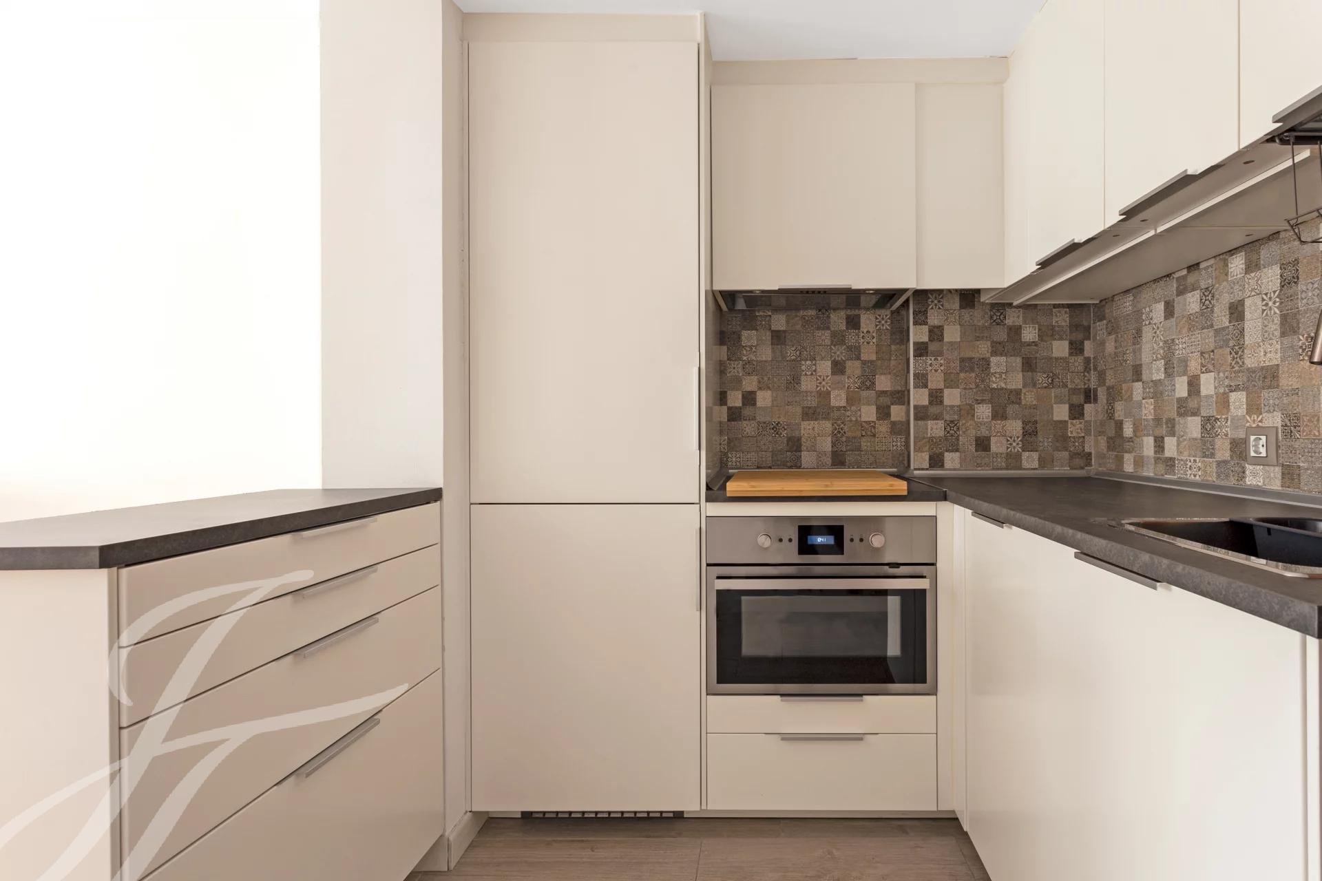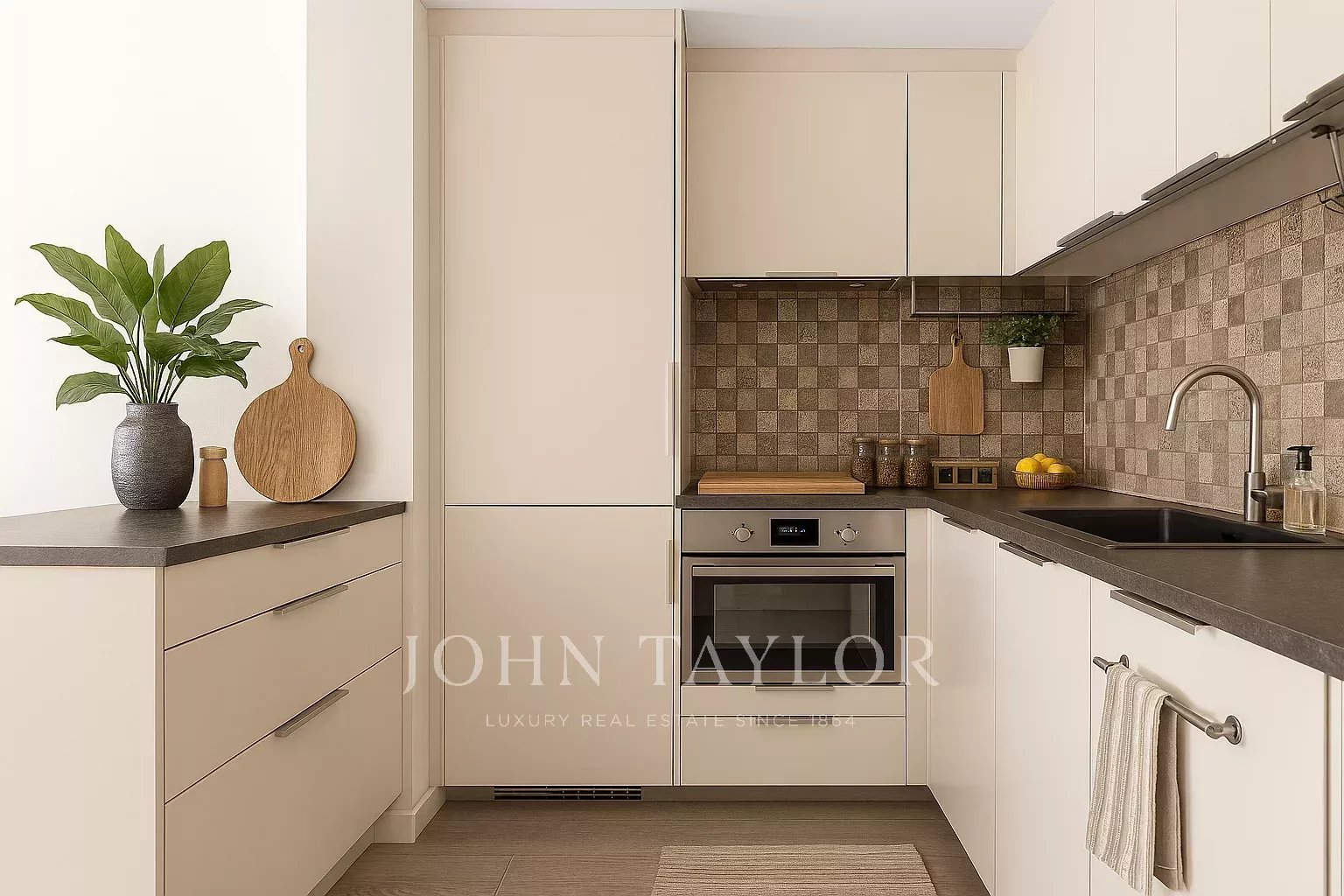Sie verfügt über ein geräumiges und helles Schlafzimmer mit separatem Ankleidebereich und eigenem Bad. Das Wohn-/Esszimmer verfügt über eine voll ausgestattete Küche, die in das Wohnzimmer integriert ist. Die Wohnung wird unmöbliert vermietet.
