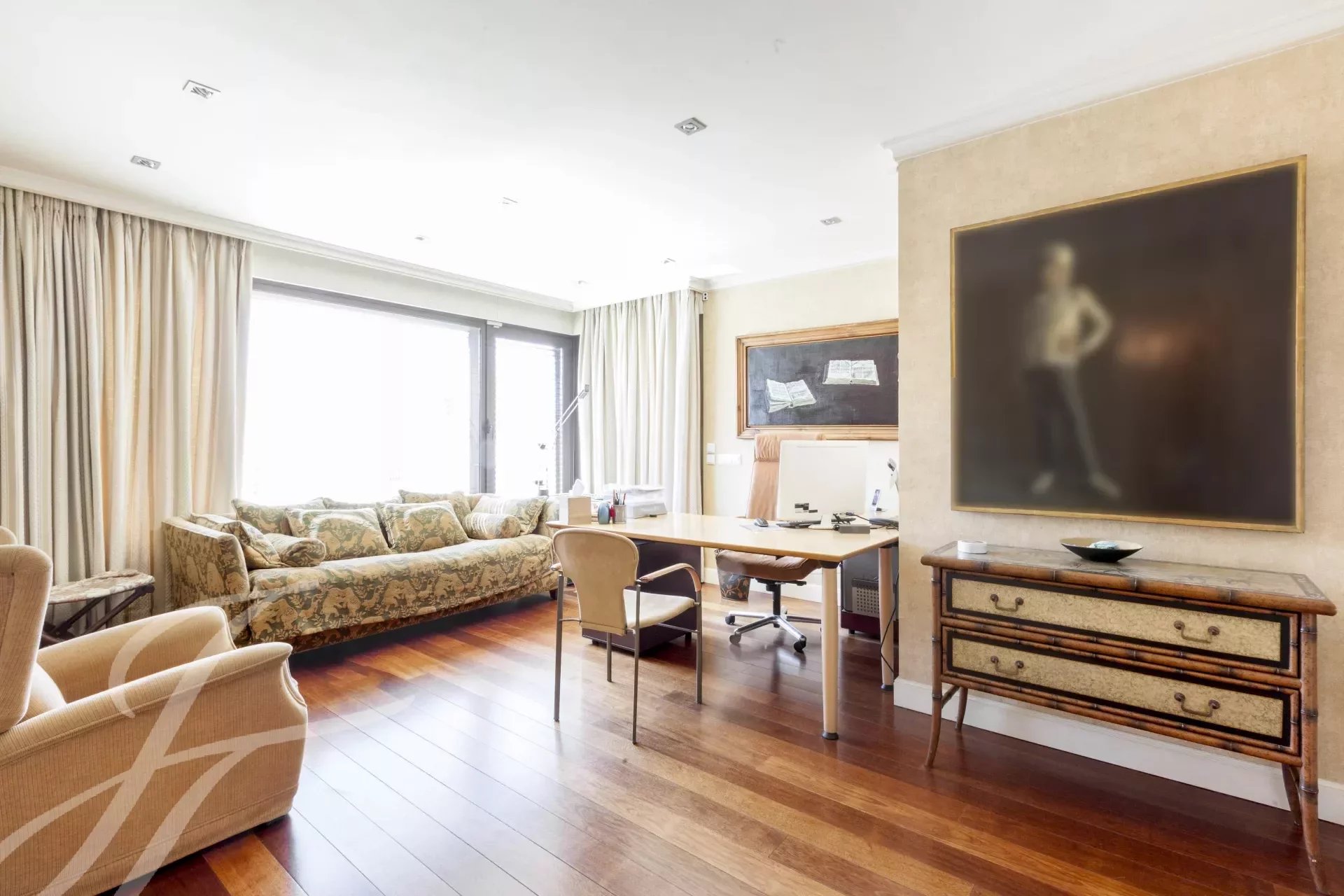 Dieses prächtige Duplex zur Miete beeindruckt schon von seinem Eingang aus, mit einer großen Eingangshalle, sowohl für seine Größe und seine Höhe von fast 6 Metern, gekrönt von einem Oberlicht, das ihm eine große Helligkeit verleiht.