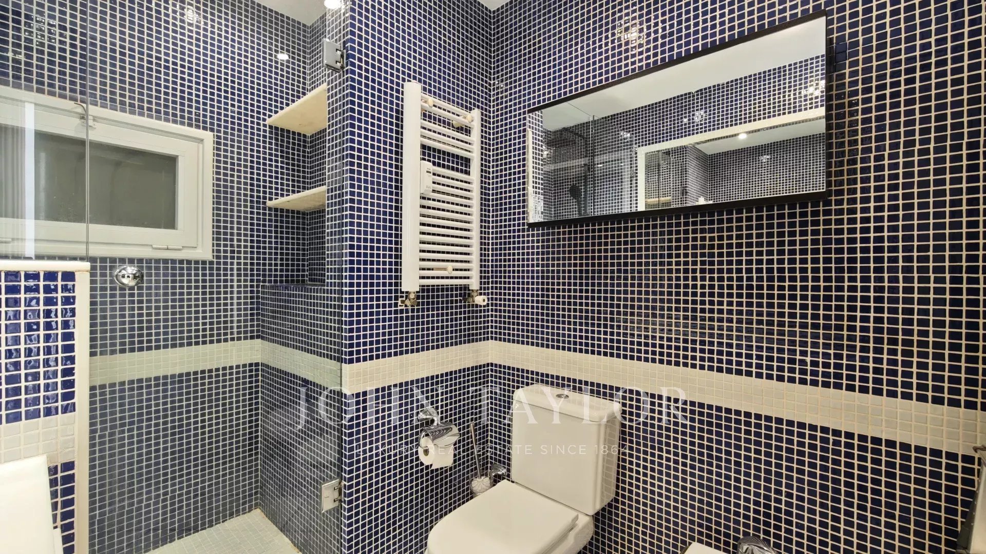 Die Küche ist ein Beispiel für Funktionalität und modernes Design, ausgestattet mit hochwertigen Geräten, darunter ein Cerankochfeld, eine Waschmaschine, ein Geschirrspüler, eine Mikrowelle und ein Kühlschrank. Darüber hinaus verfügt die Wohnung über elektrische Markisen, Glasfaserkabel und eine Video-Gegensprechanlage, die für erstklassige Sicherheit und Konnektivität sorgen. Der Zugang zum Gebäude wird durch einen Aufzug erleichtert und der Concierge-Service steht für alle Bedürfnisse zur Verfügung.
