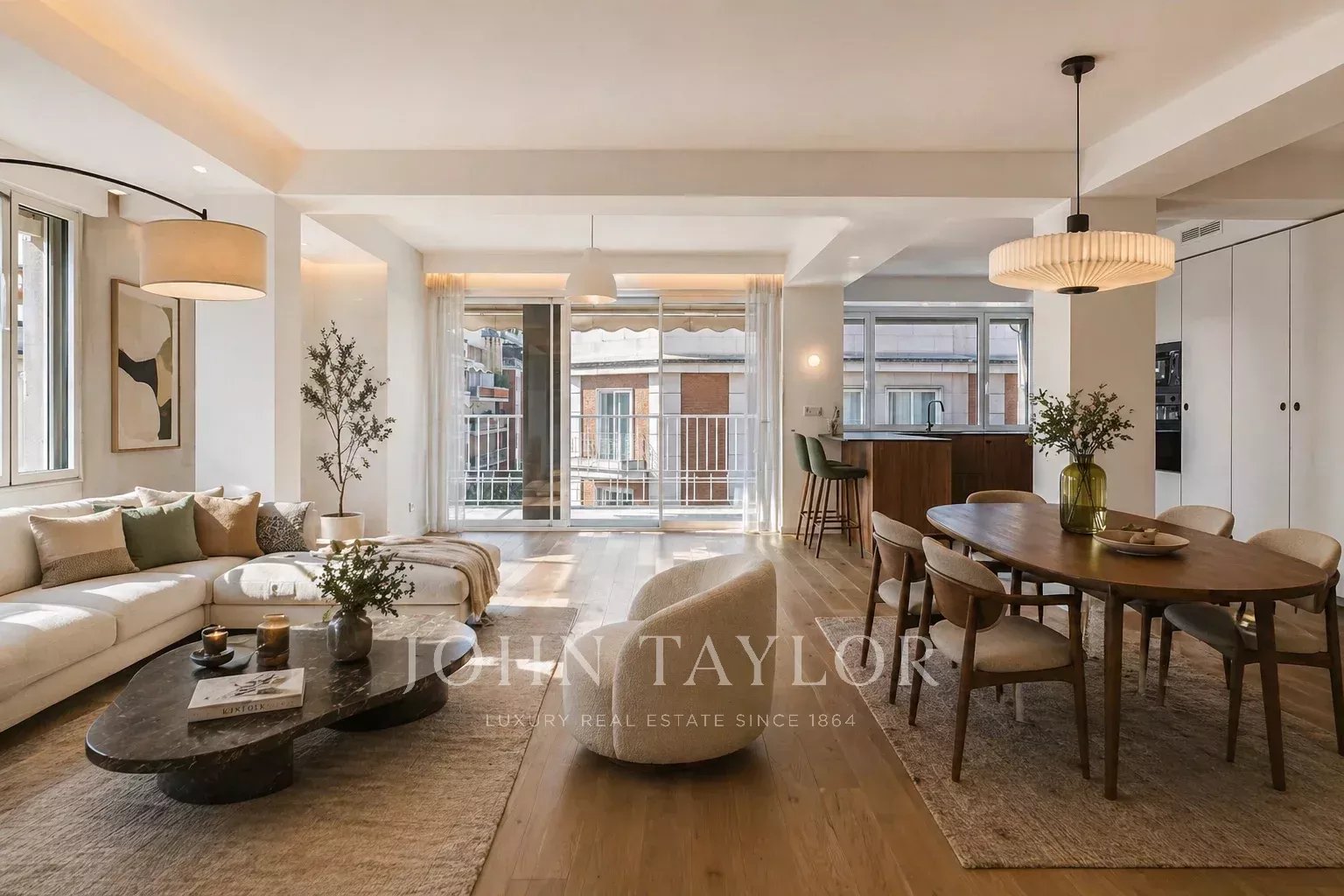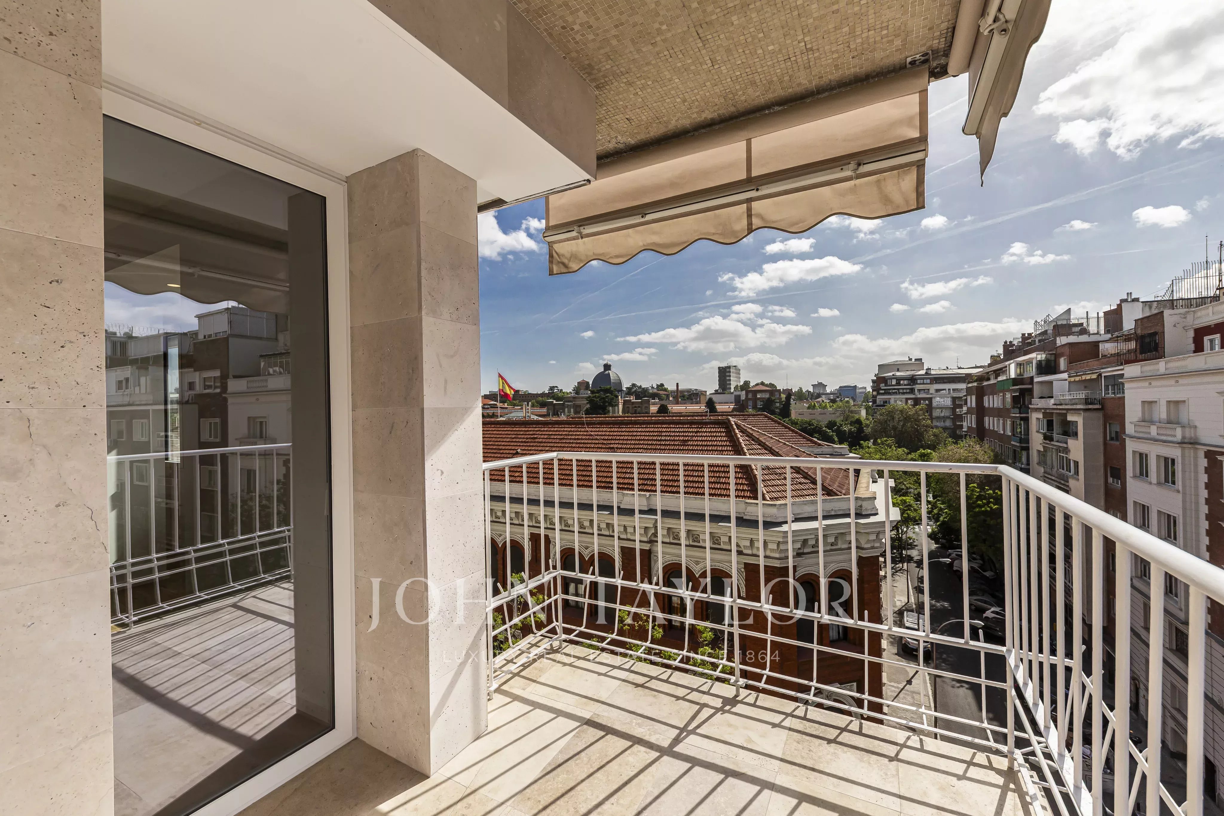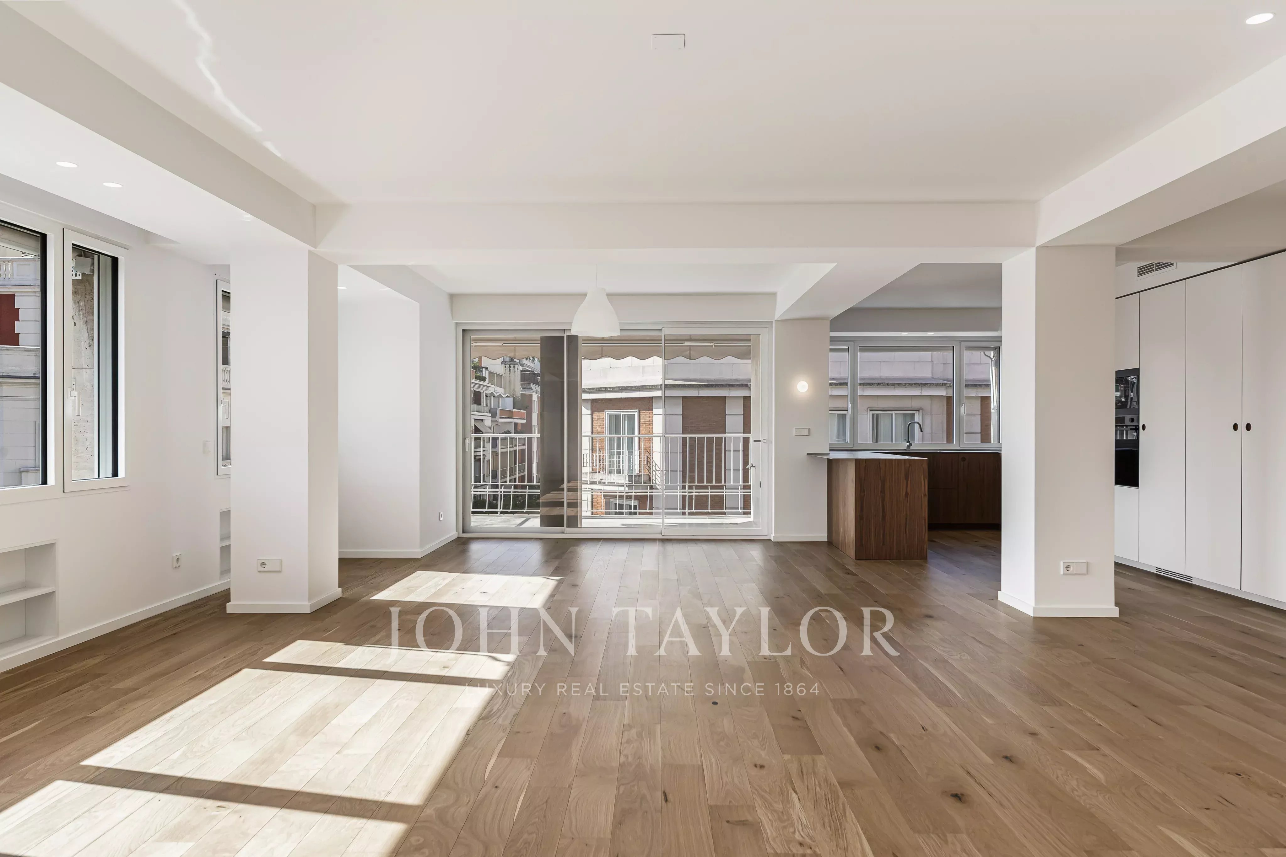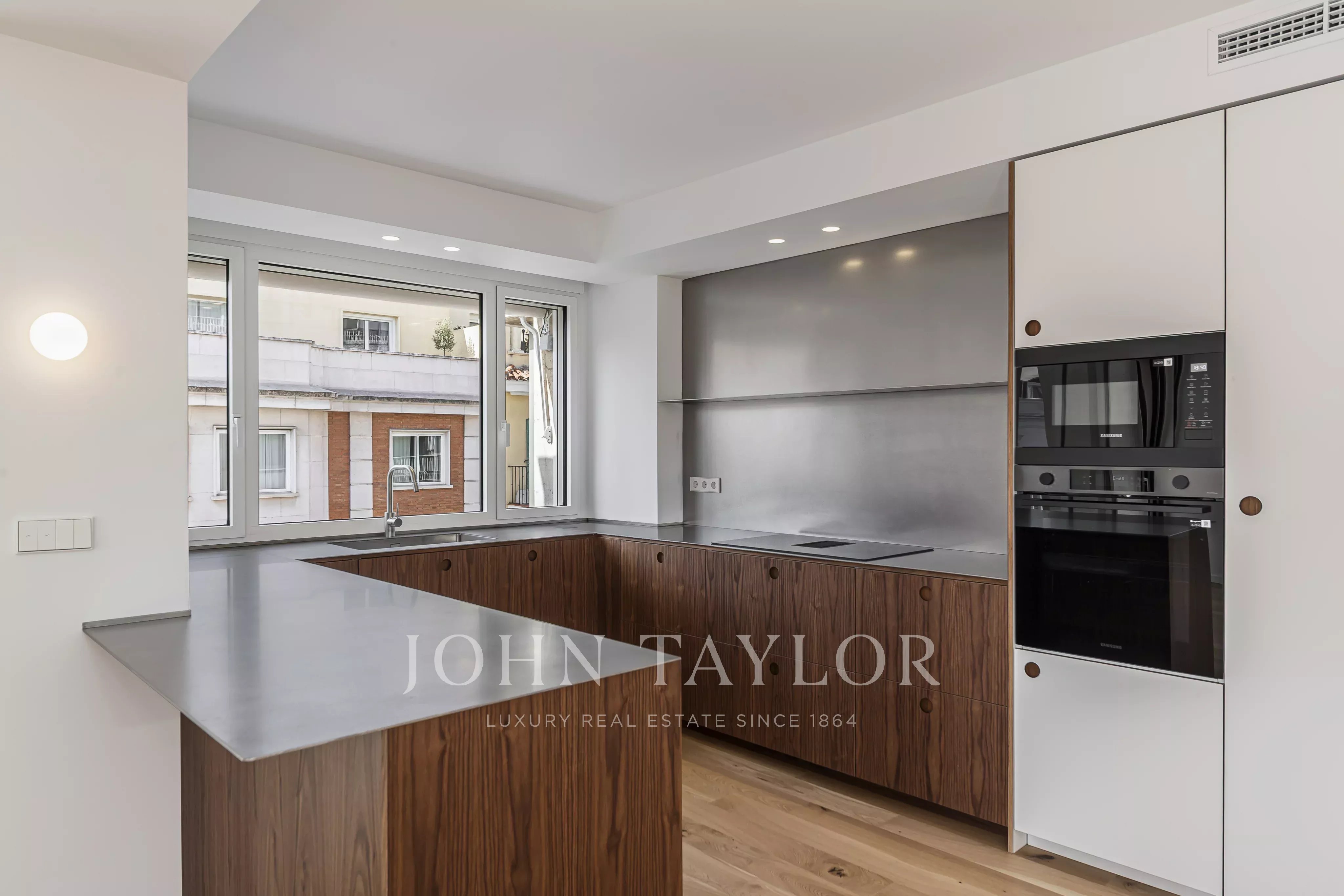 Elegante Neubauwohnung nach umfangreicher Komplettsanierung, gelegen im sechsten Stock eines eleganten klassischen Gebäudes in Chamberí, einer der begehrtesten Gegenden Madrids.
