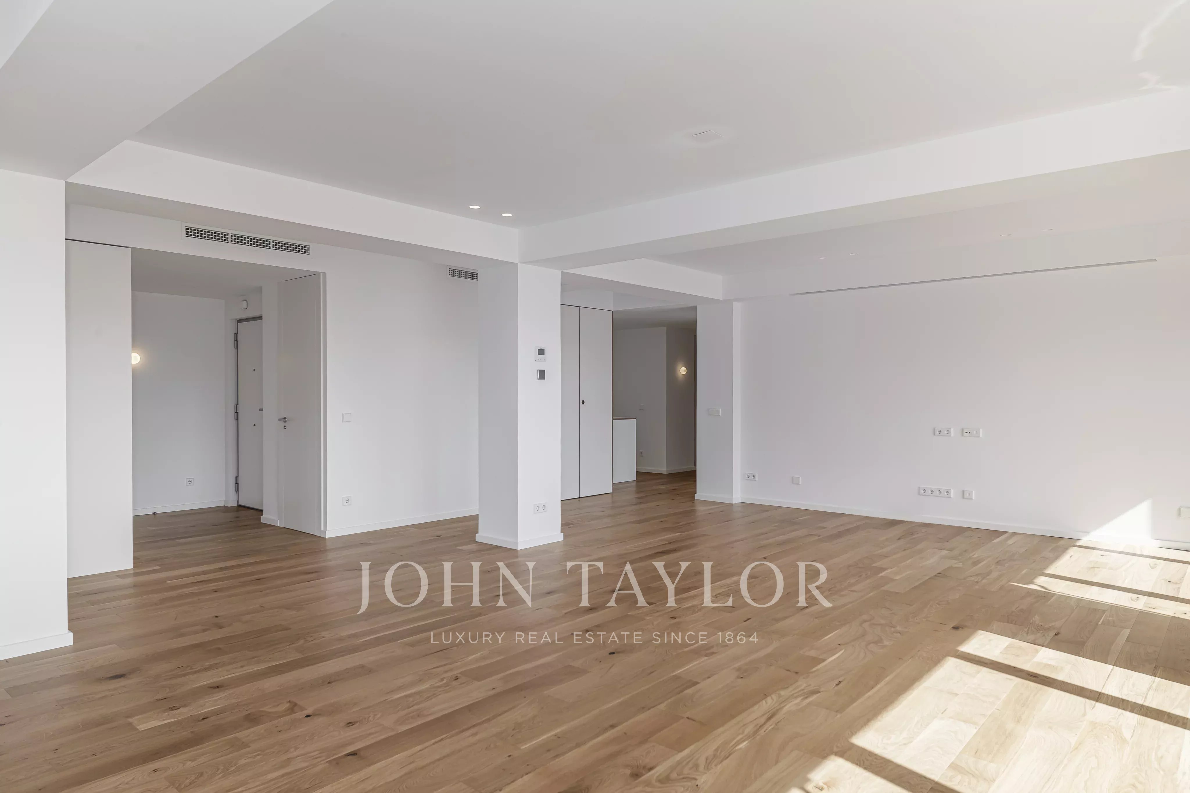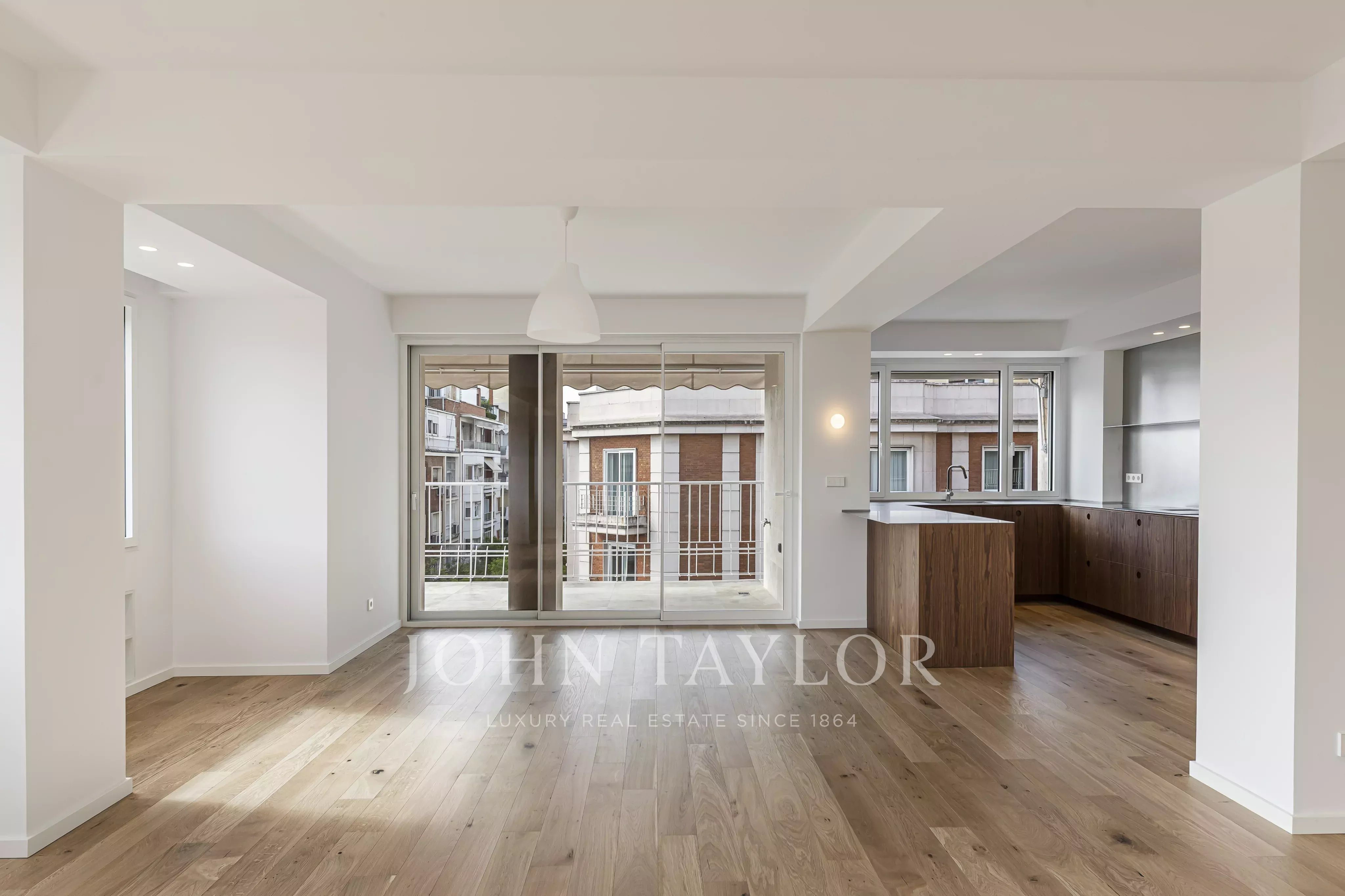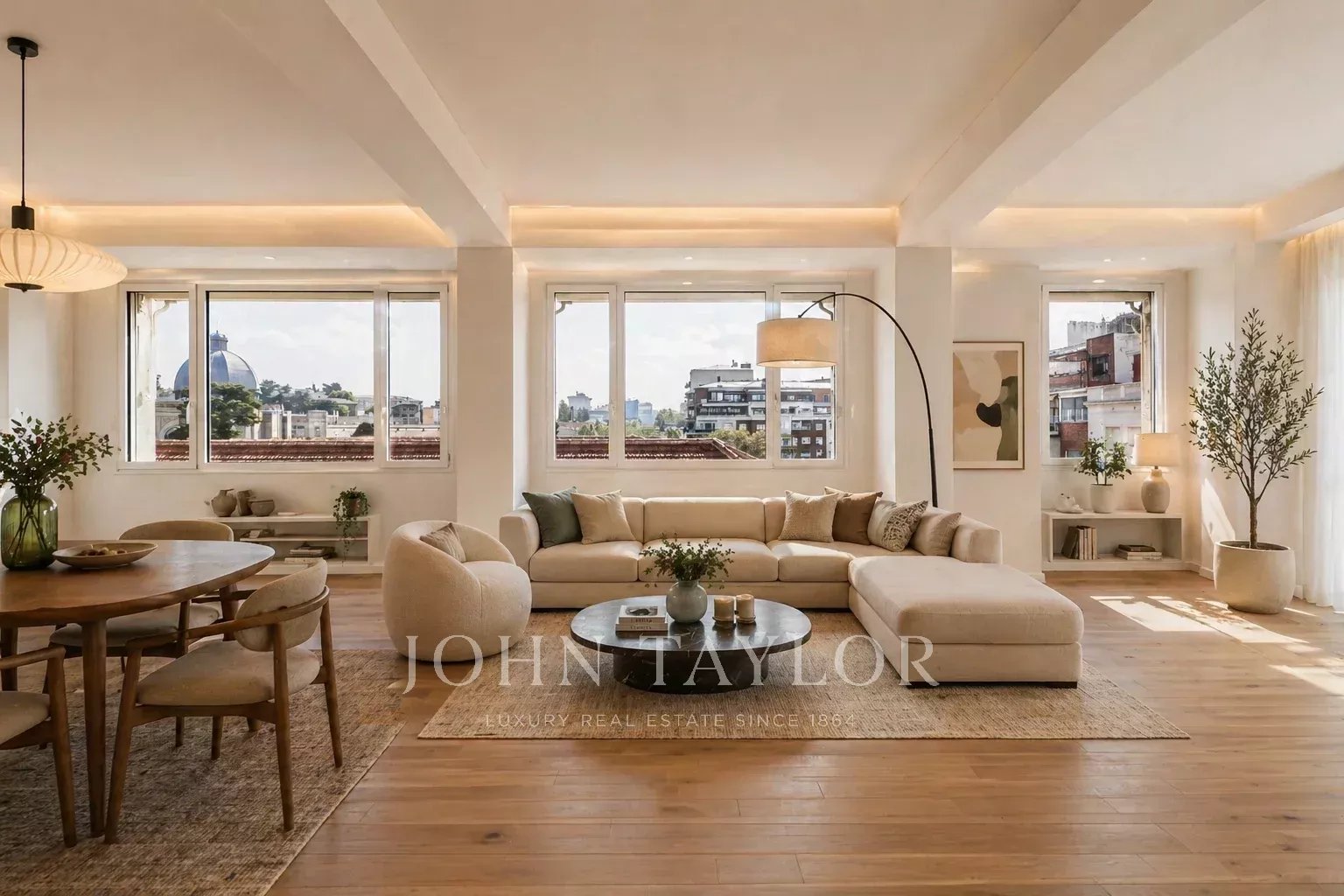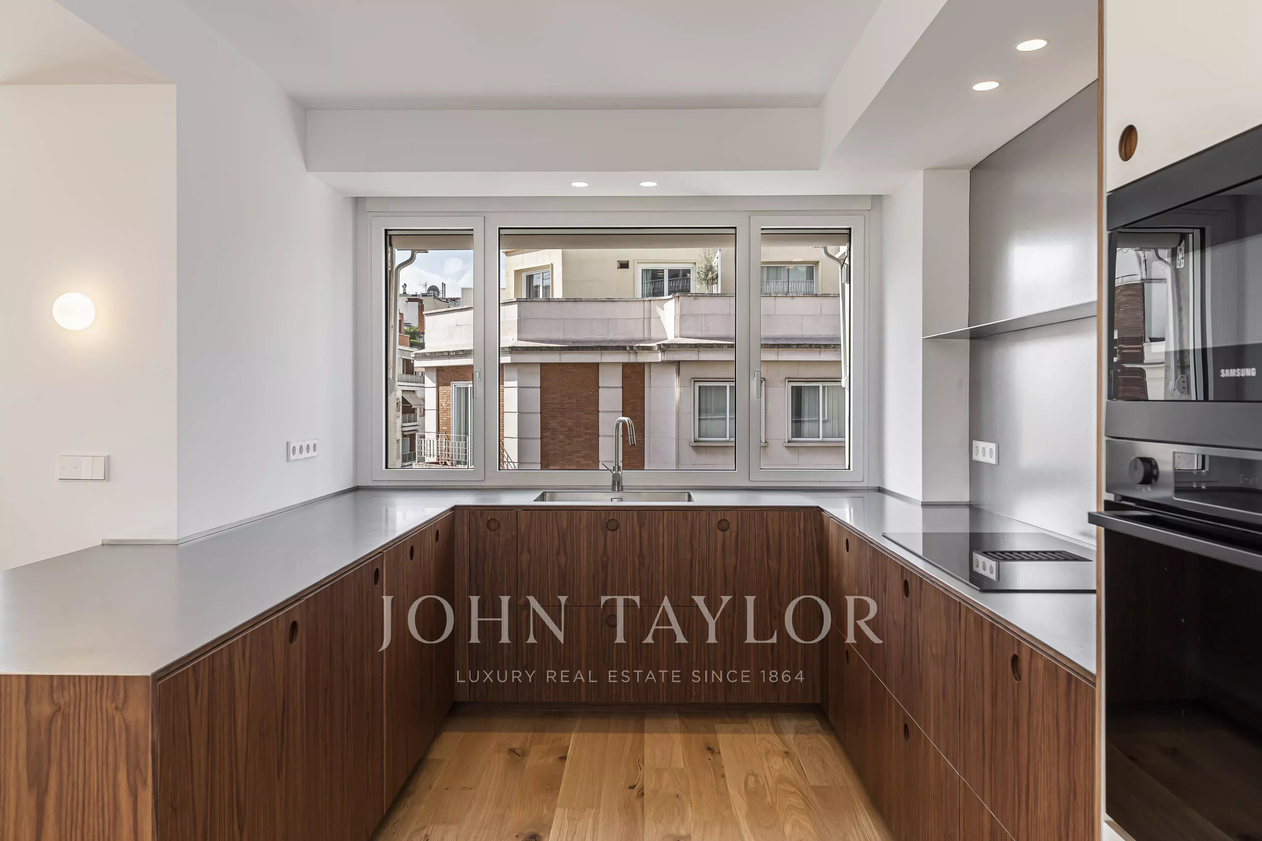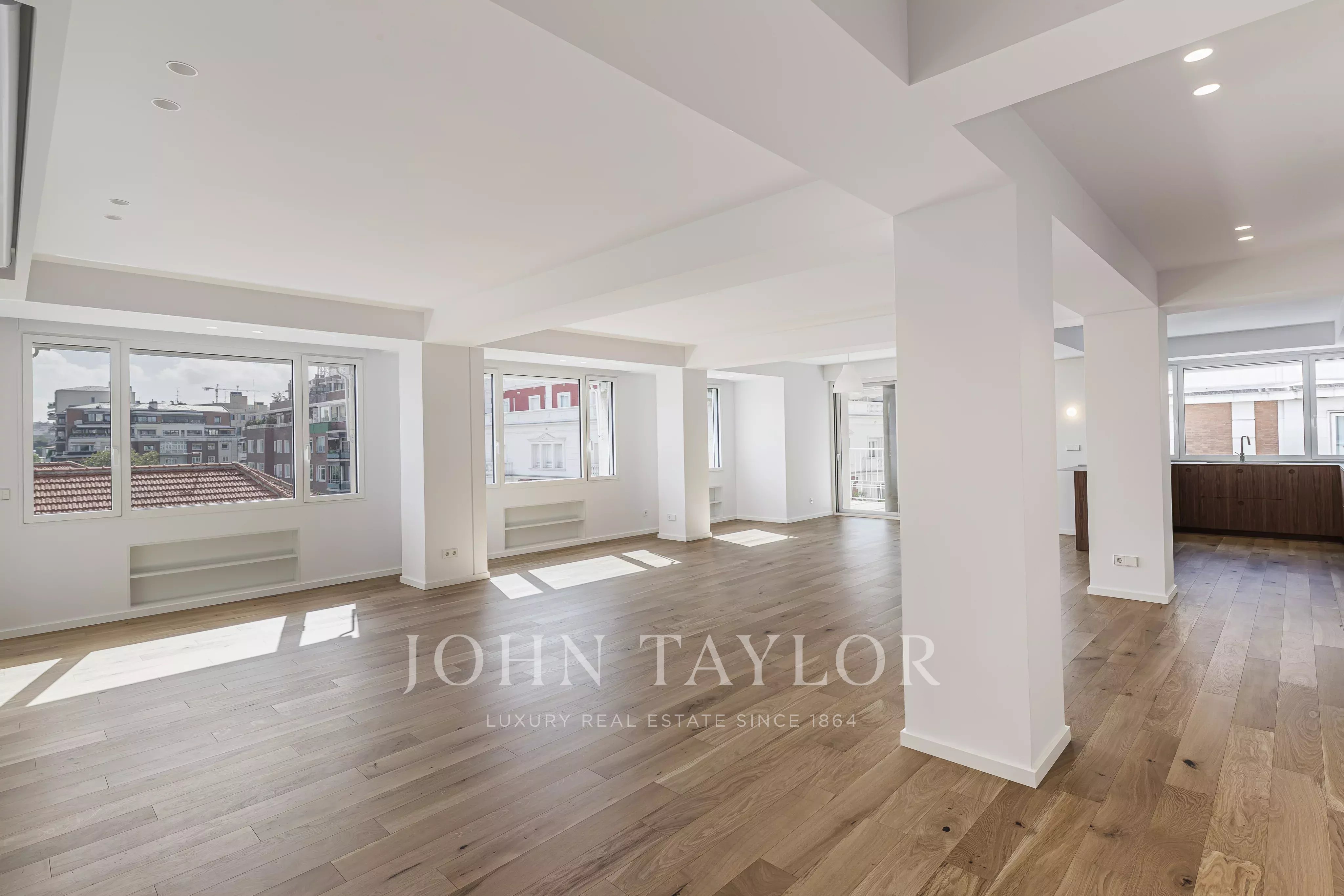 Elegante Neubauwohnung nach umfangreicher Komplettsanierung, gelegen im sechsten Stock eines eleganten klassischen Gebäudes in Chamberí, einer der begehrtesten Gegenden Madrids.