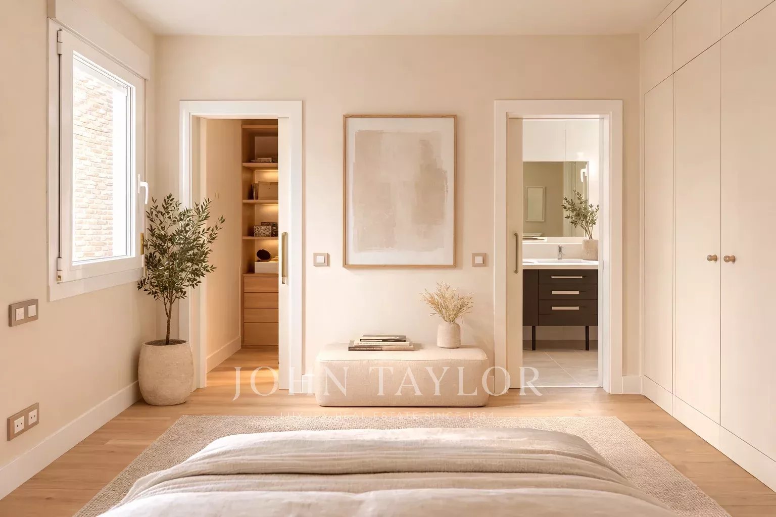 Der Ruhebereich bietet ein Hauptschlafzimmer mit Bad en suite, zwei Einbauschränke und einen zusätzlichen Ankleideraum. Das Hauptbadezimmer, durch natürliches Licht erhellt, verfügt über eine Marmordusche und Doppelwaschbecken. Ein zweites, vielseitiges und gemütliches Schlafzimmer ist ideal als Gästezimmer oder Arbeitszimmer.