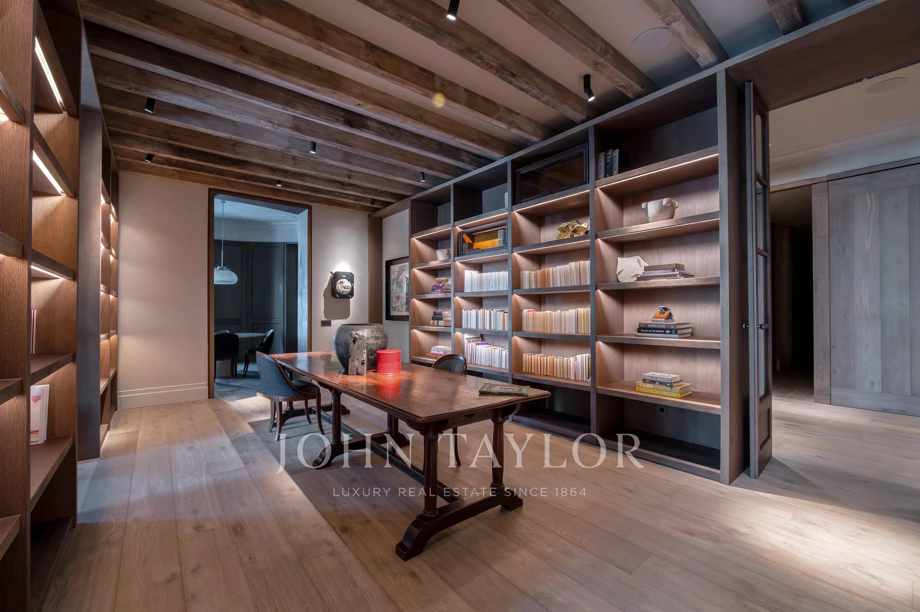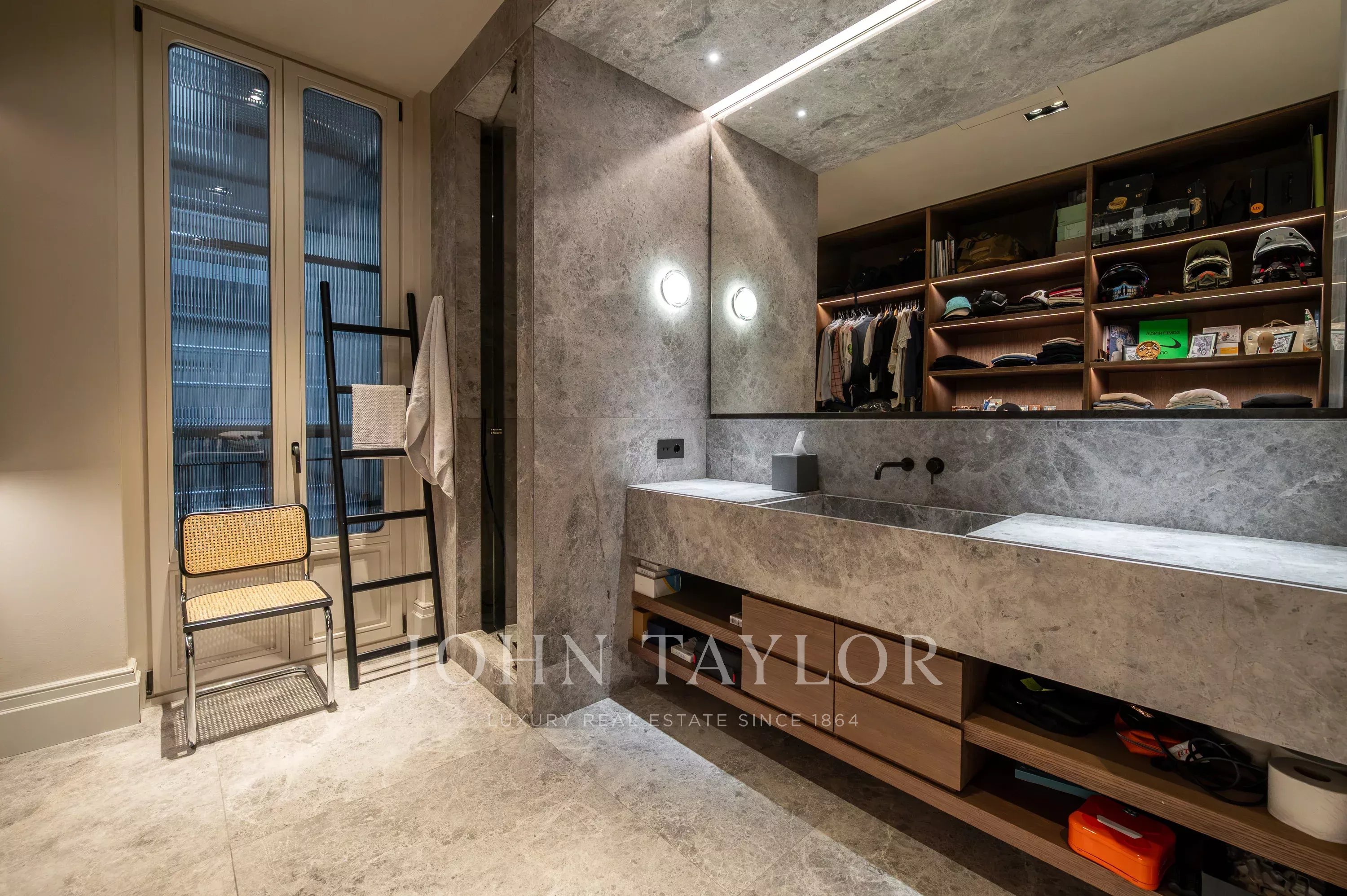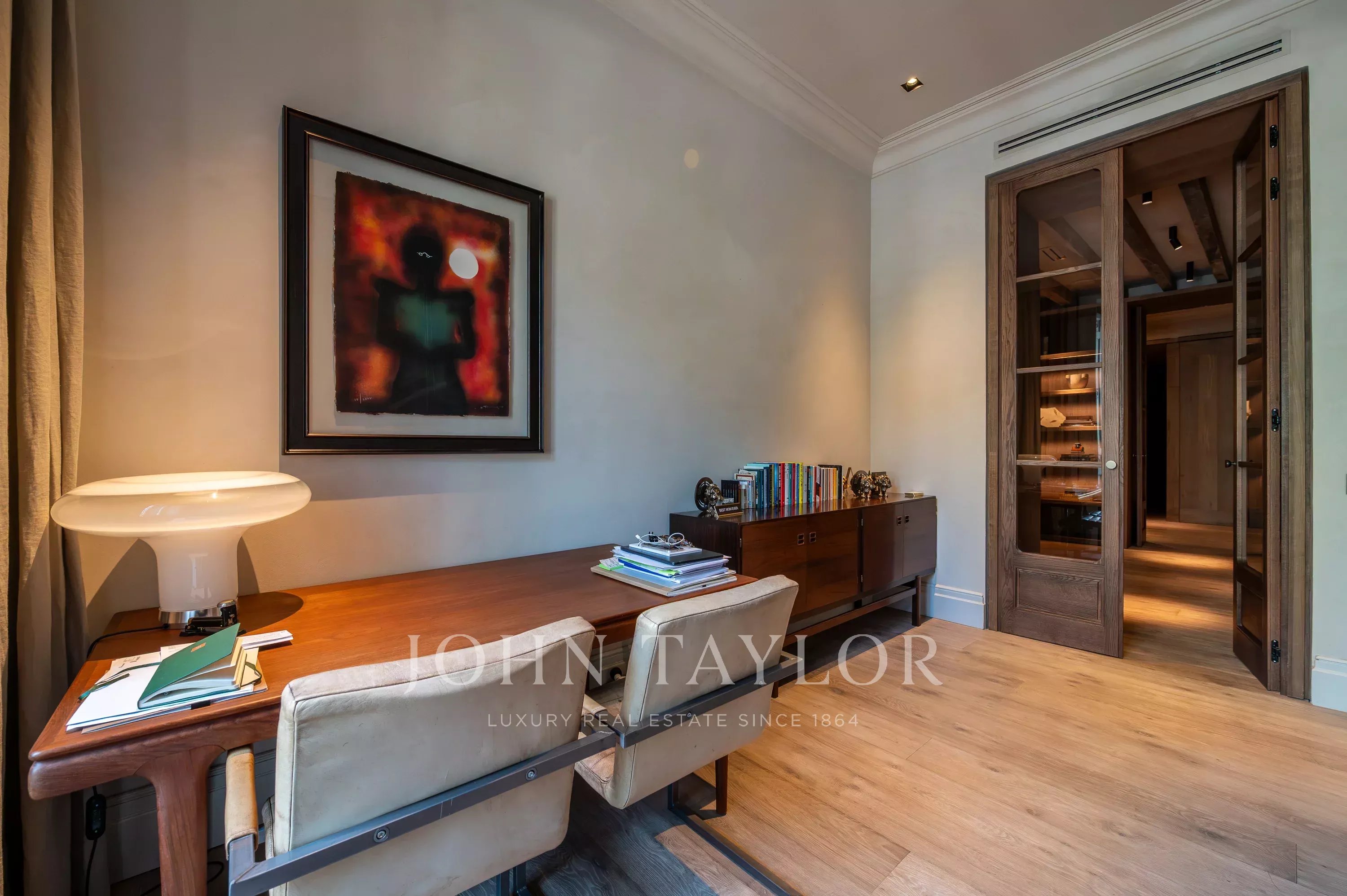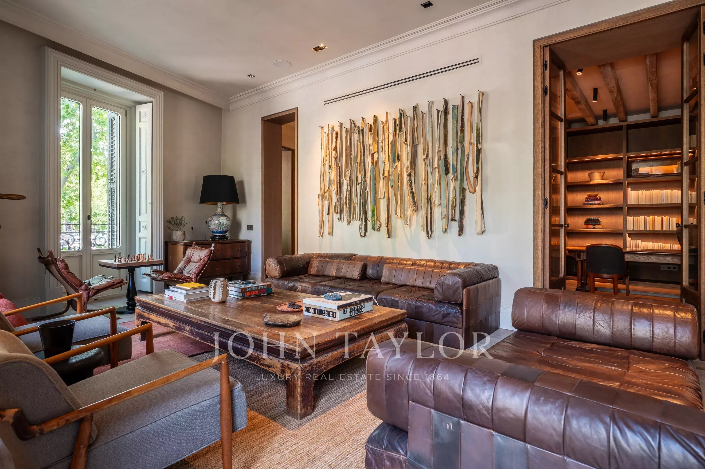Die Hauptsuite präsentiert sich als eine echte unabhängige Oase, mit einem eleganten Arbeitsbereich, einem Schlafzimmer mit privilegiertem Blick auf die Calle Alcalá, einem geräumigen Ankleideraum für Modefans und einem spektakulären Badezimmer mit Marmorfertigungen.