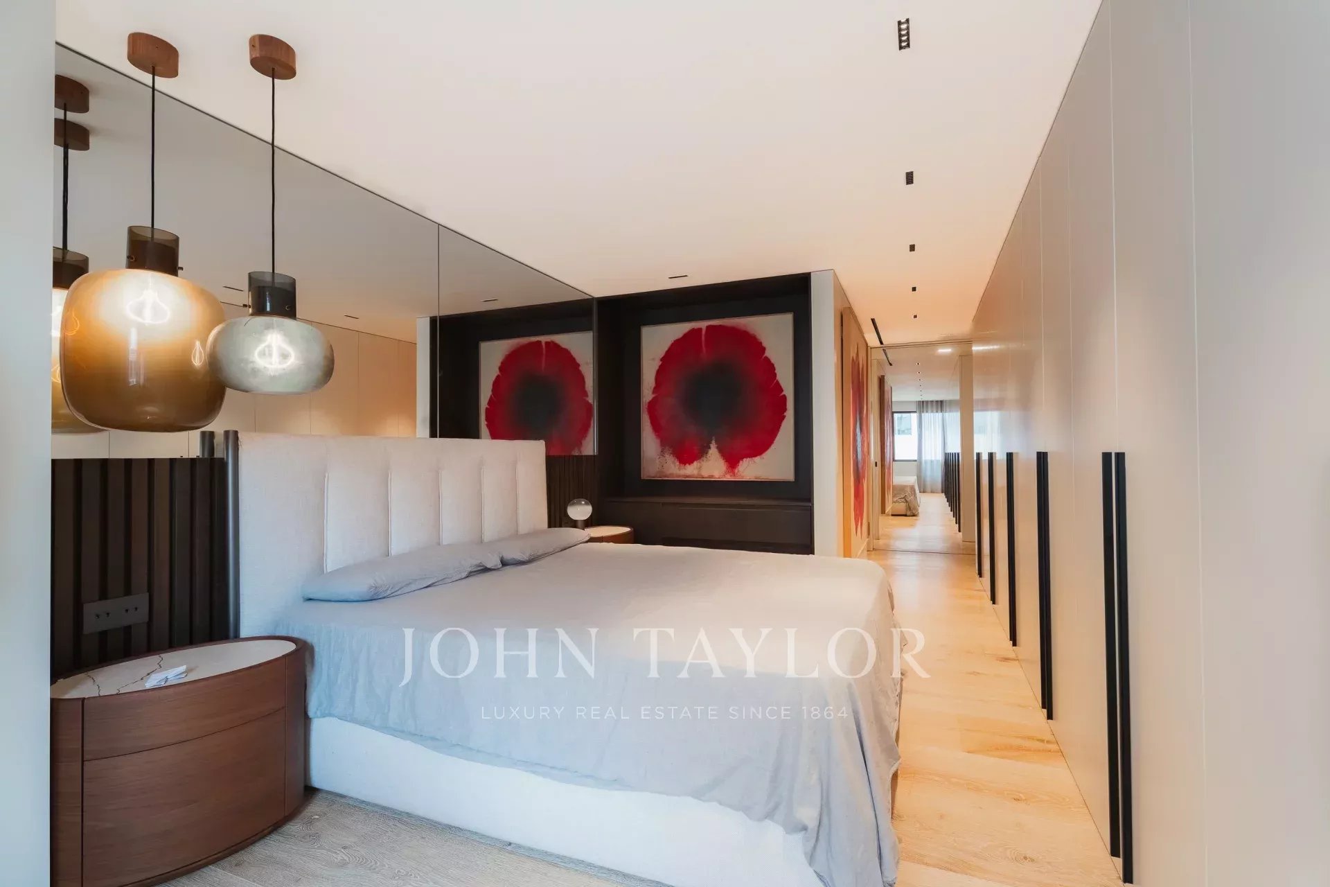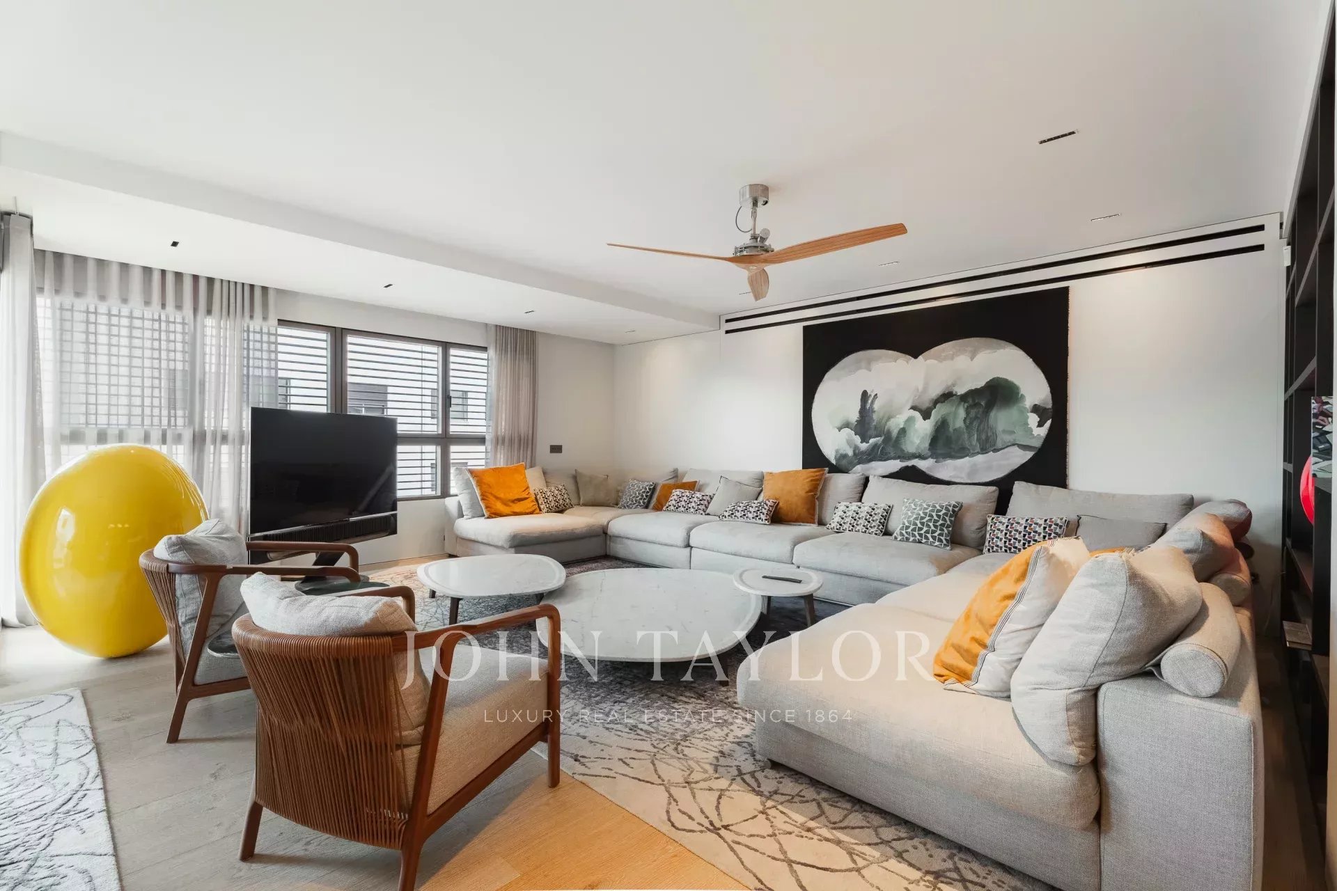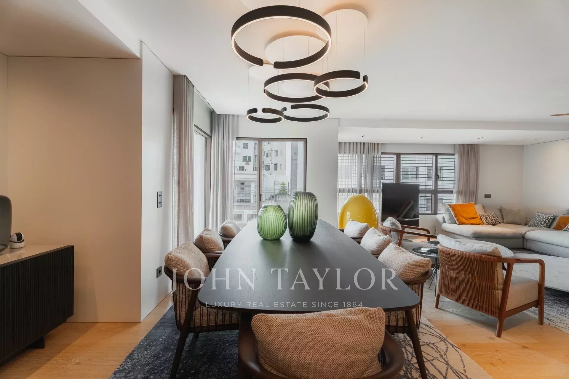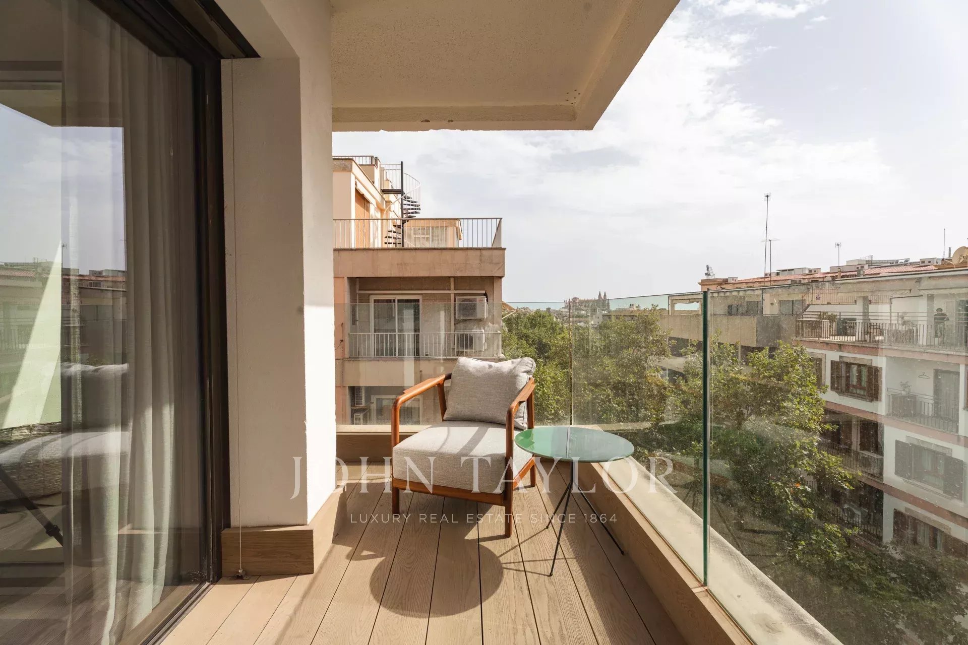 Das moderne, vollständig möblierte Apartment verfügt über einen großzügigen, offenen Grundriss mit einer Designerküche, einem eleganten Essbereich und einem hellen Wohnzimmer, das direkten Zugang zu einer überdachten Terrasse mit unverbautem Blick auf die ikonische Kathedrale von Palma bietet.