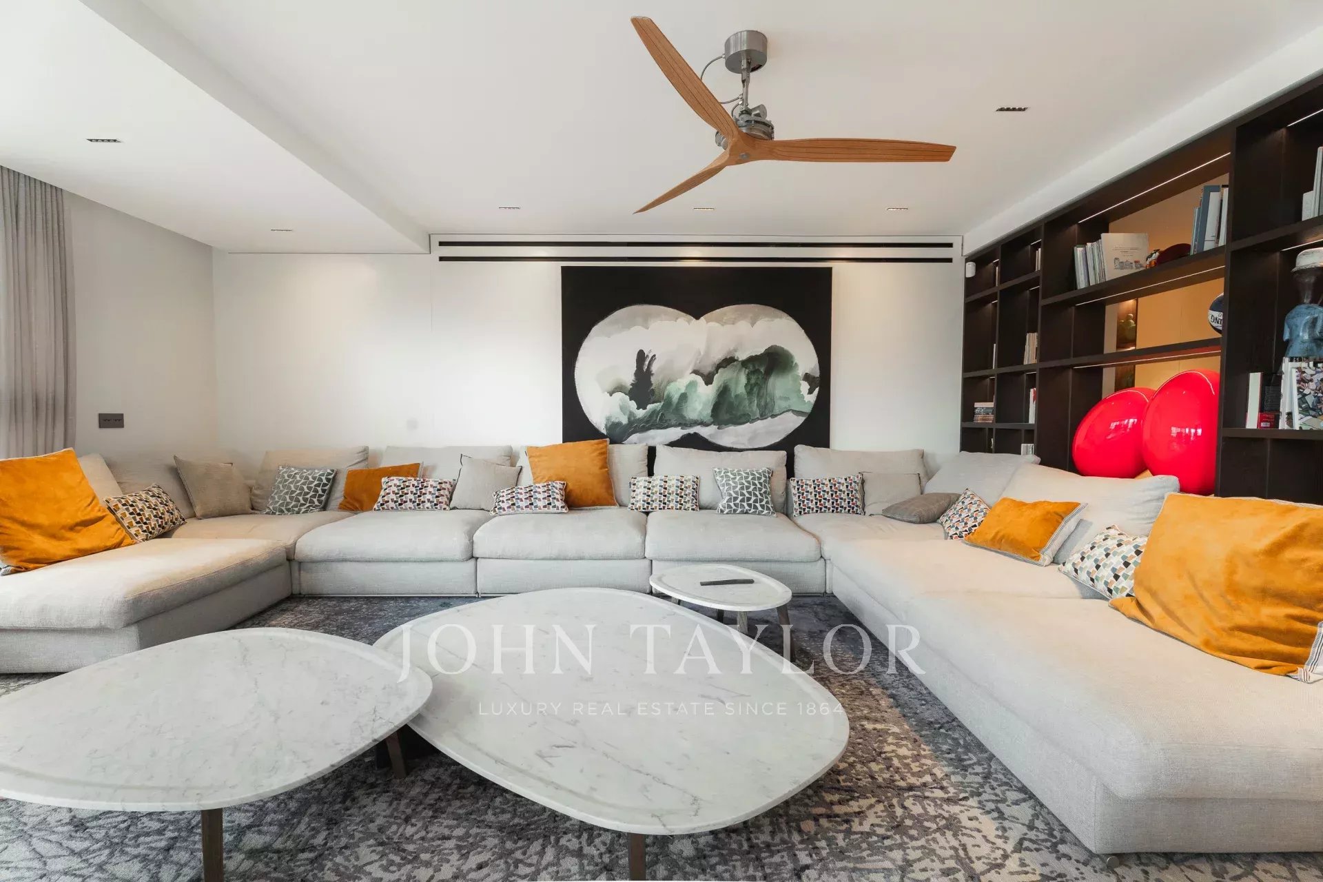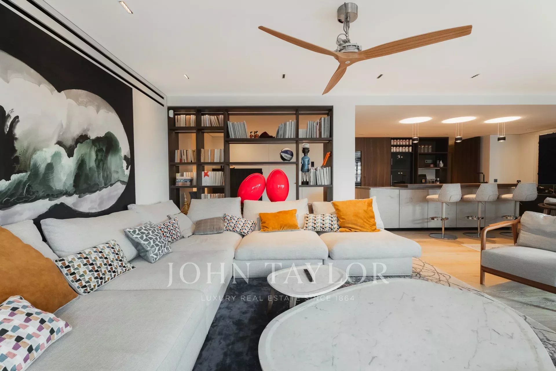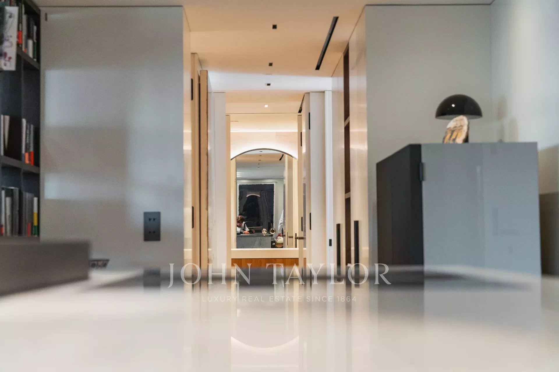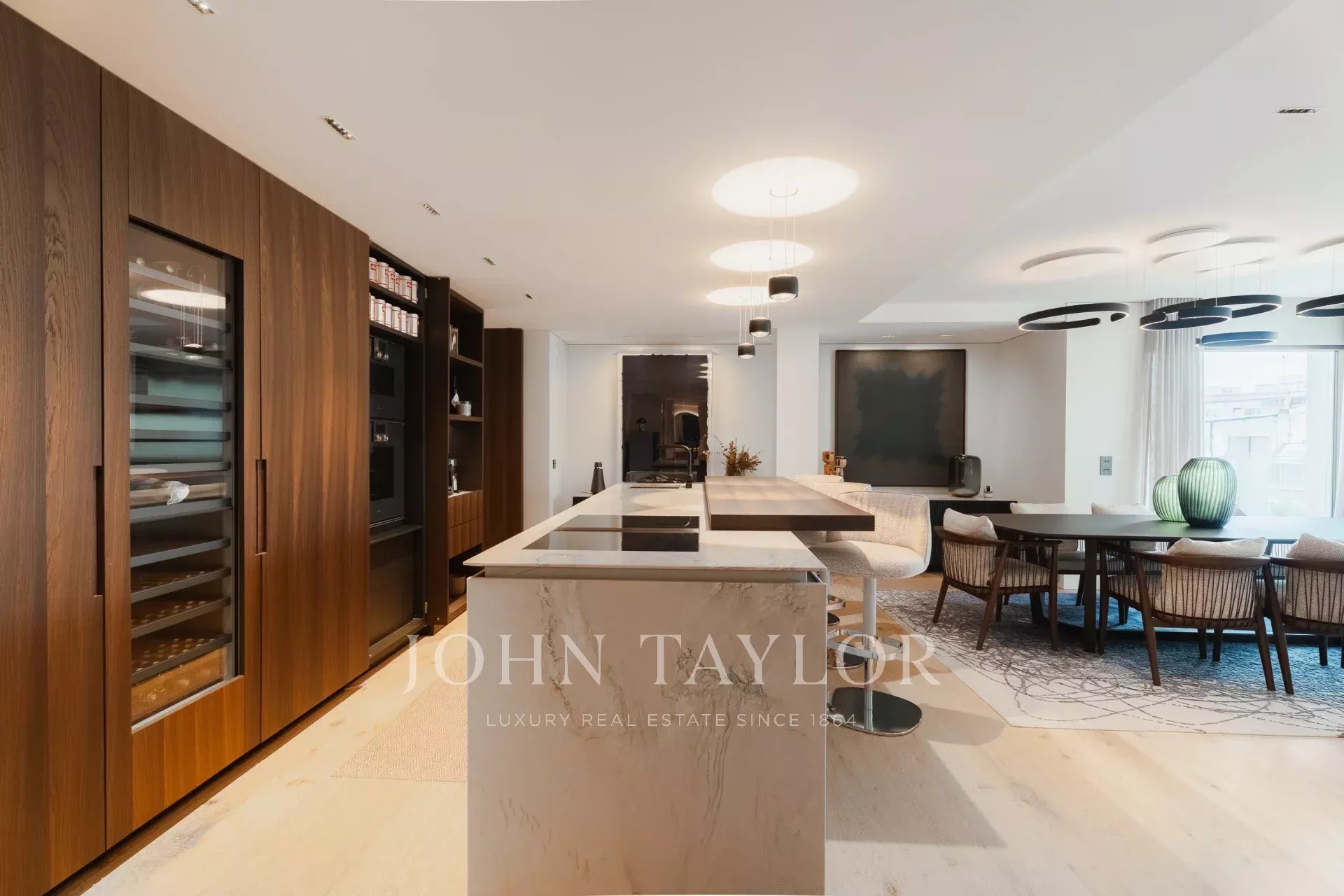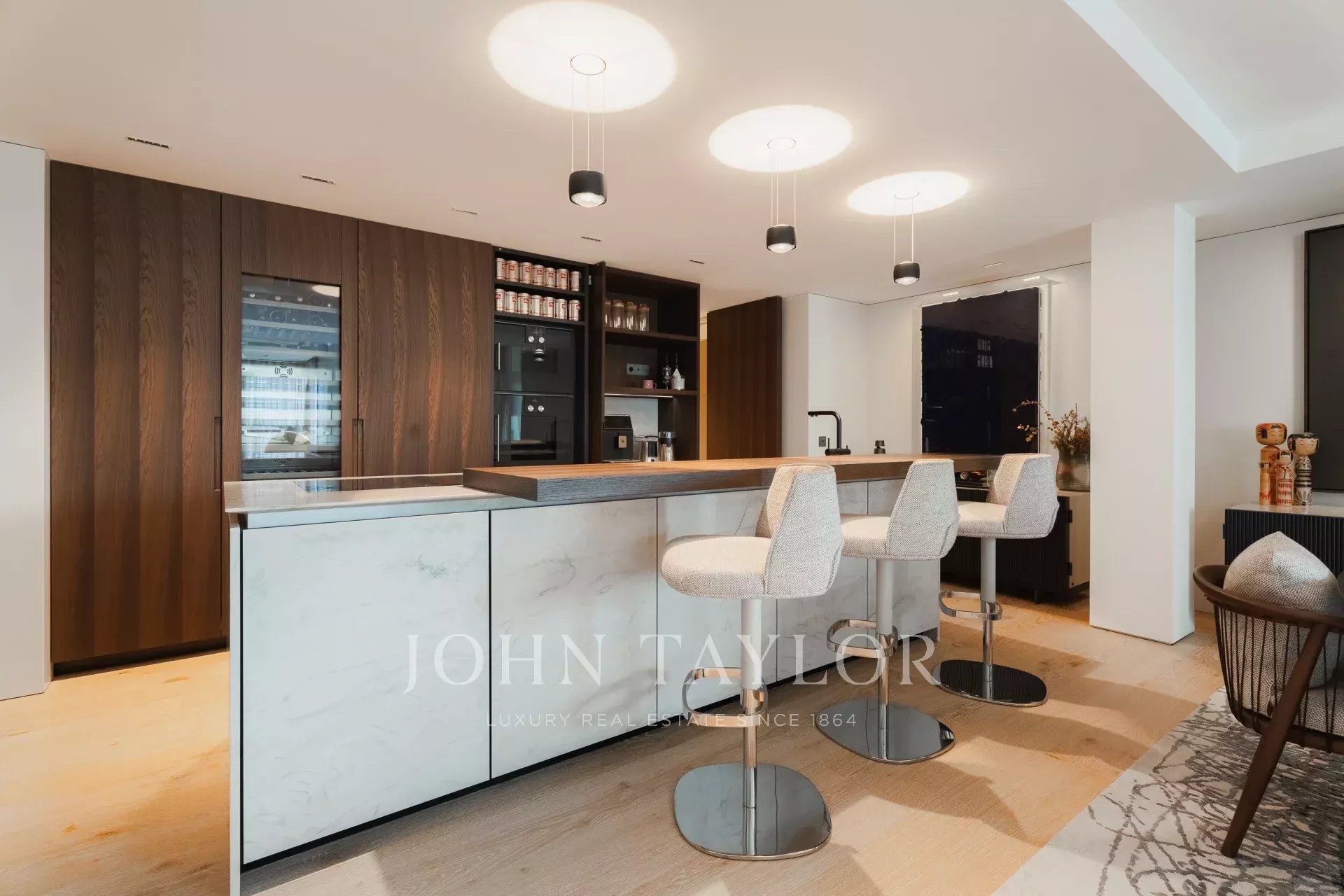 Das moderne, vollständig möblierte Apartment verfügt über einen großzügigen, offenen Grundriss mit einer Designerküche, einem eleganten Essbereich und einem hellen Wohnzimmer, das direkten Zugang zu einer überdachten Terrasse mit unverbautem Blick auf die ikonische Kathedrale von Palma bietet.
