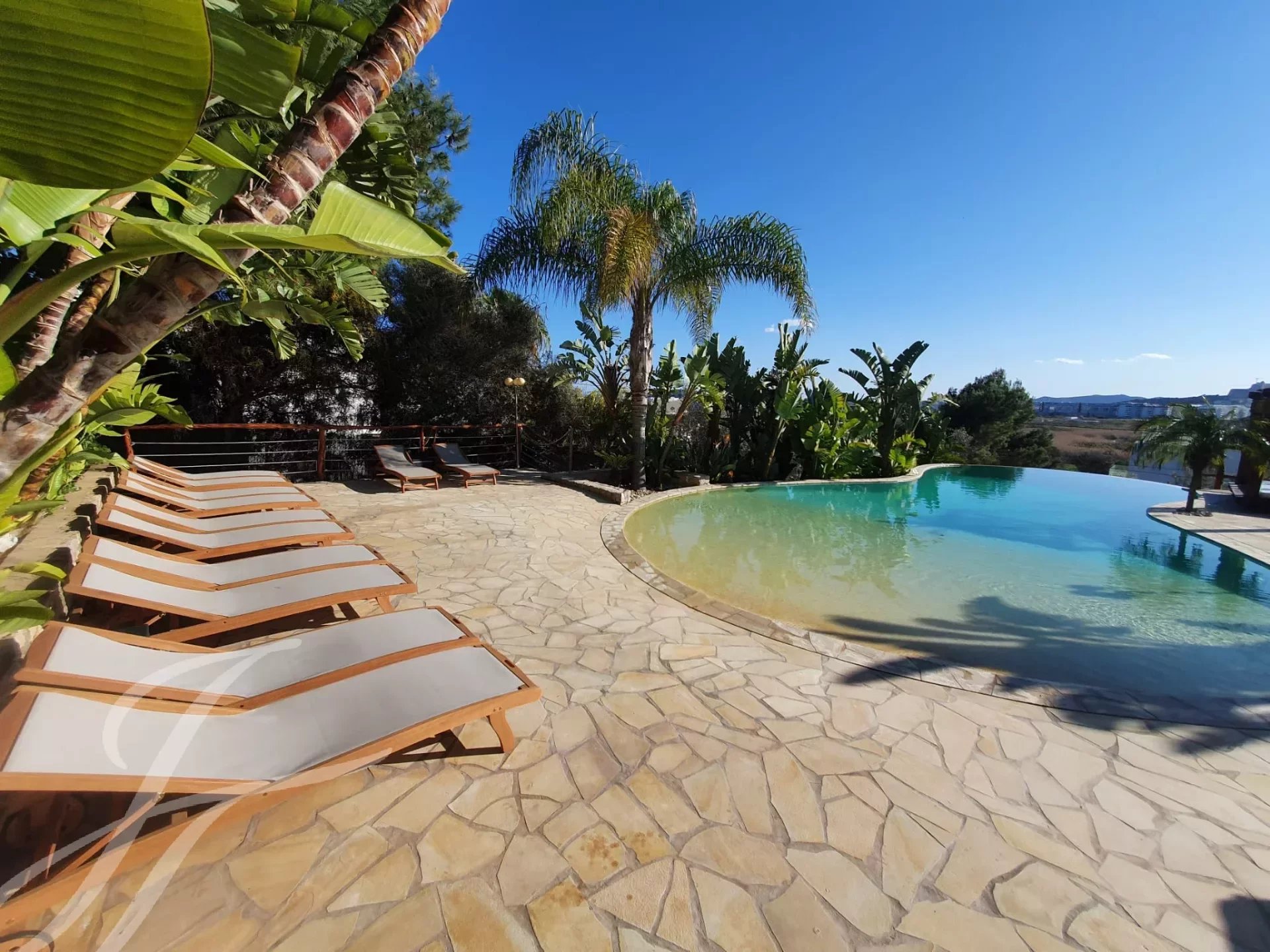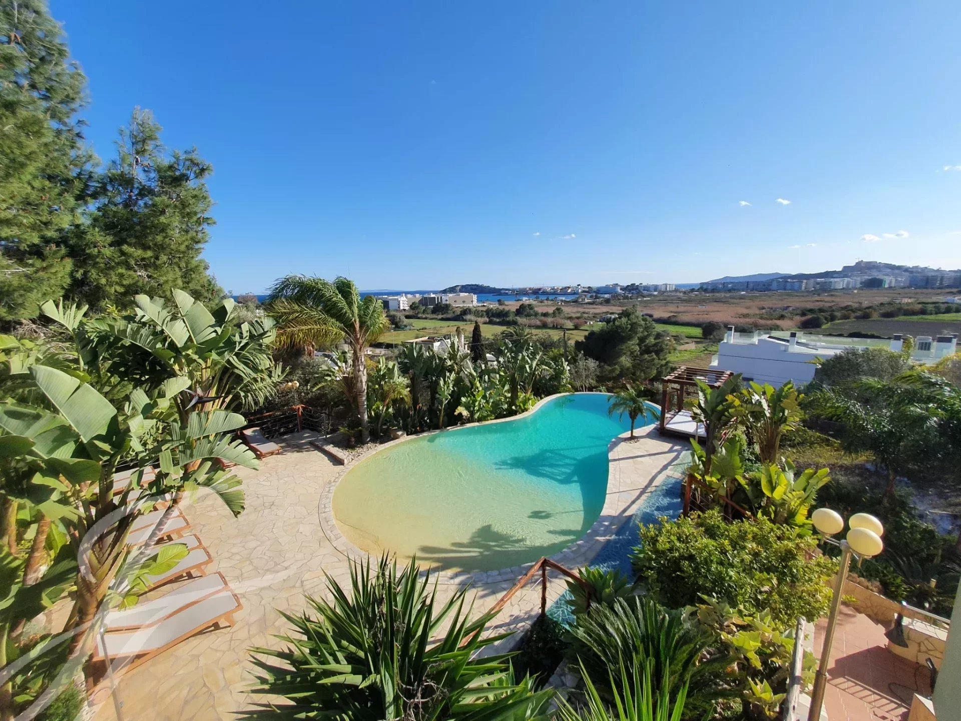 Prächtige Villa mit atemberaubendem Blick auf das Meer, Formentera und die Burg von Ibiza, gelegen in der Wohngegend Puig de Ses Torres in Jesús, neben dem Strand von Talamanca und nur einen Steinwurf vom Strand von s'Estañol entfernt. Eine kurze Fahrt vom Hafen, dem Zentrum von Ibiza und den besten Clubs wie Pacha, El Lío und Destino.
