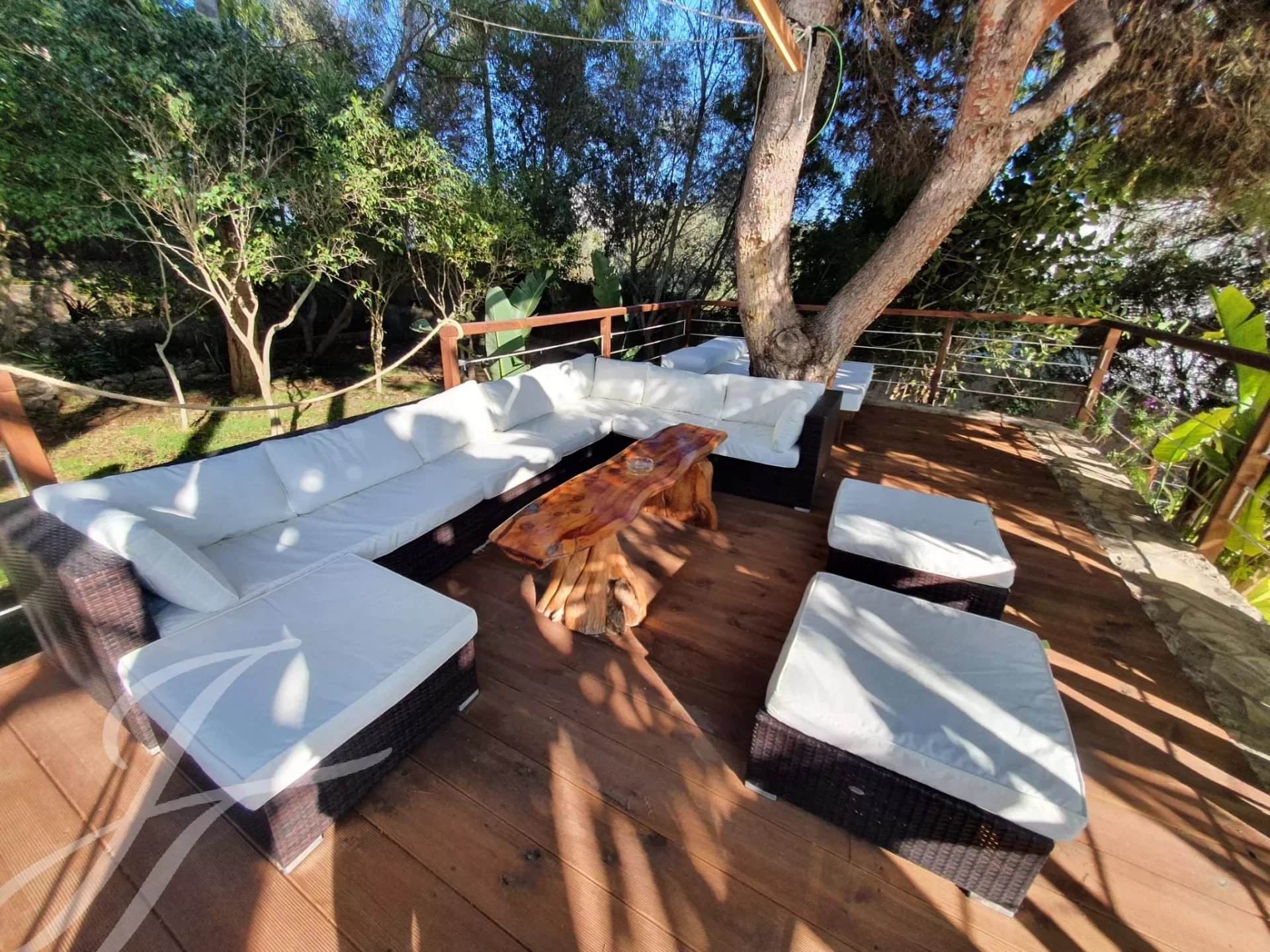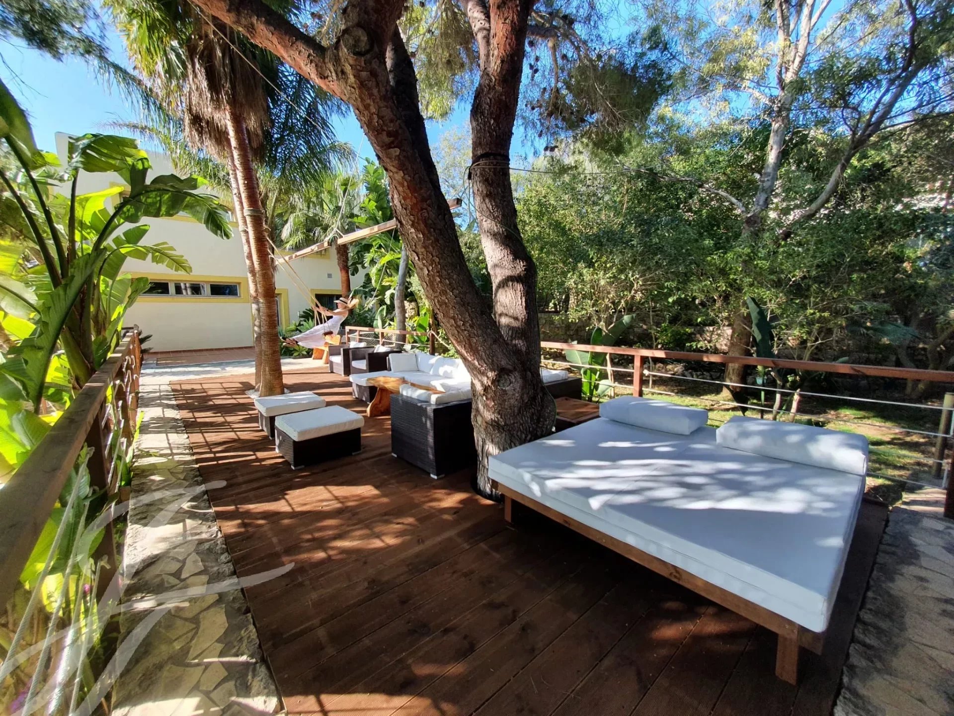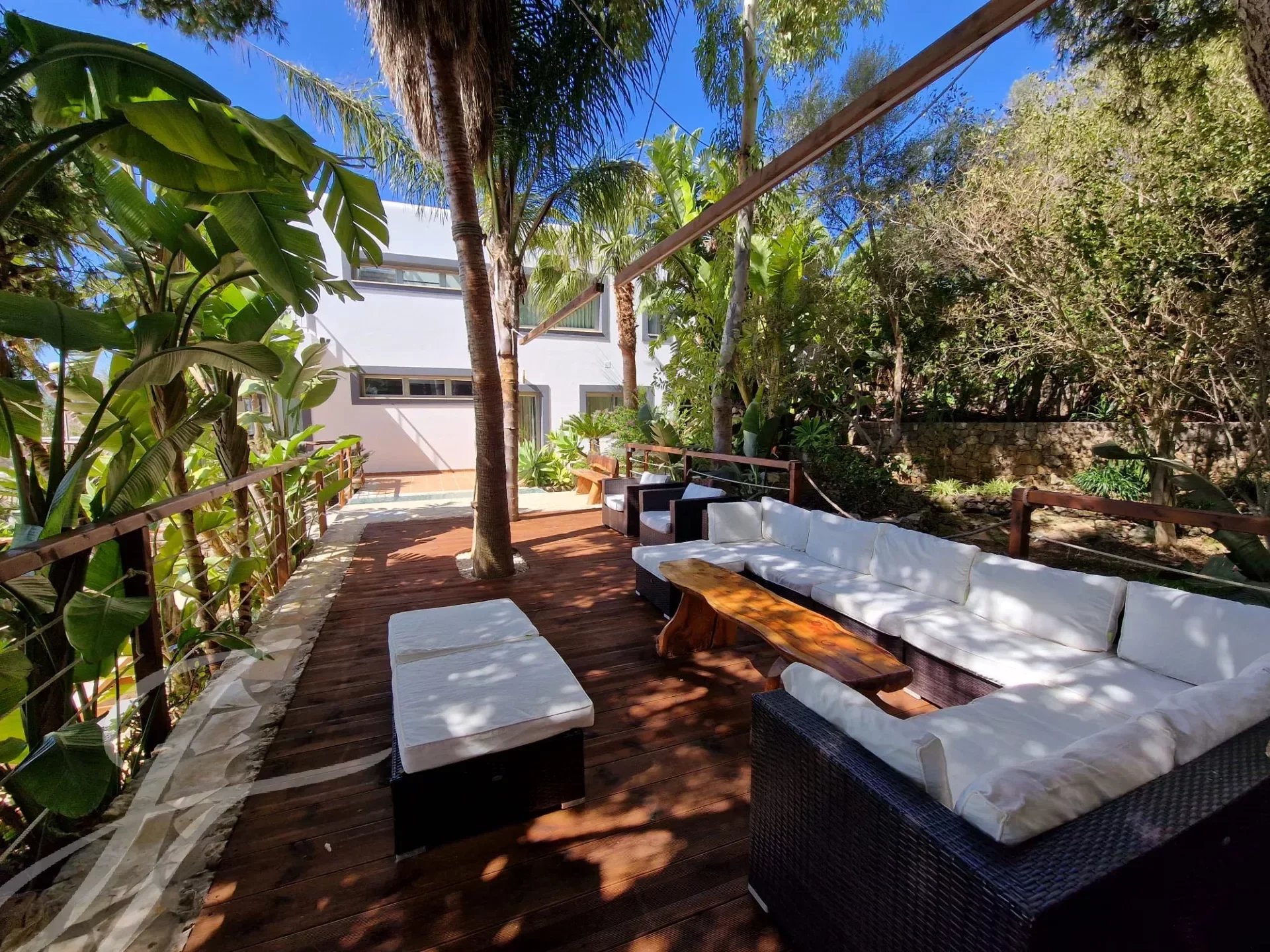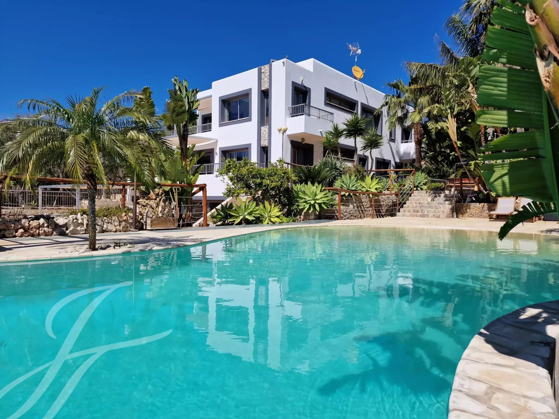 Das Anwesen verfügt über einen spektakulären Infinity-Pool mit Zugang zum Strand, der von üppigen Gärten und Terrassen umgeben ist, und einen Bach, der in einen großen Teich voller bunter Fische mündet.