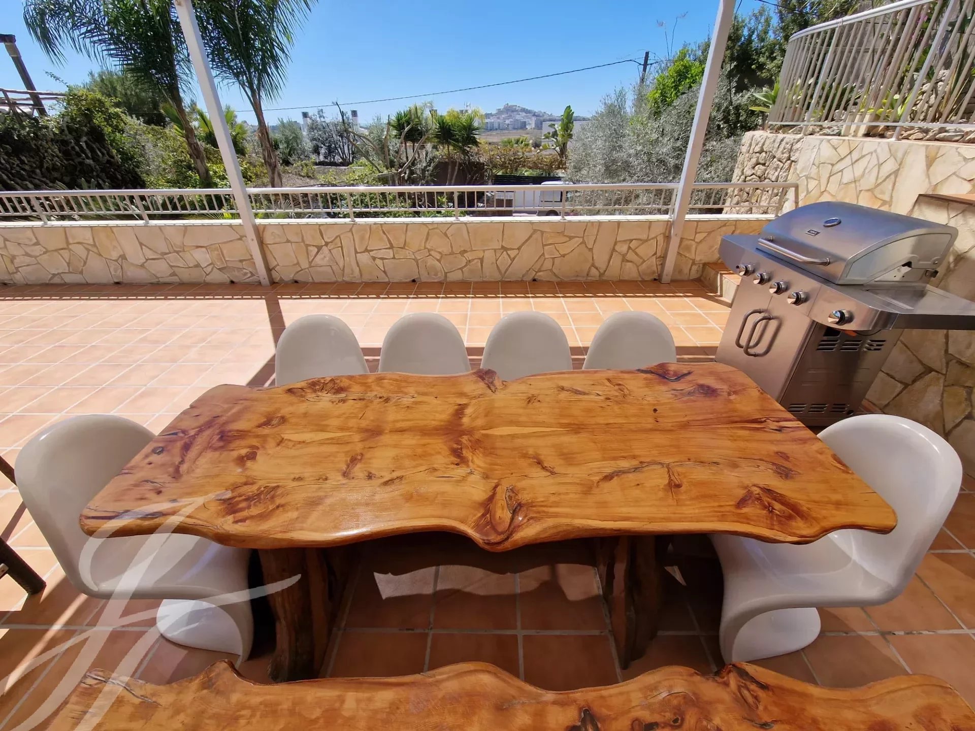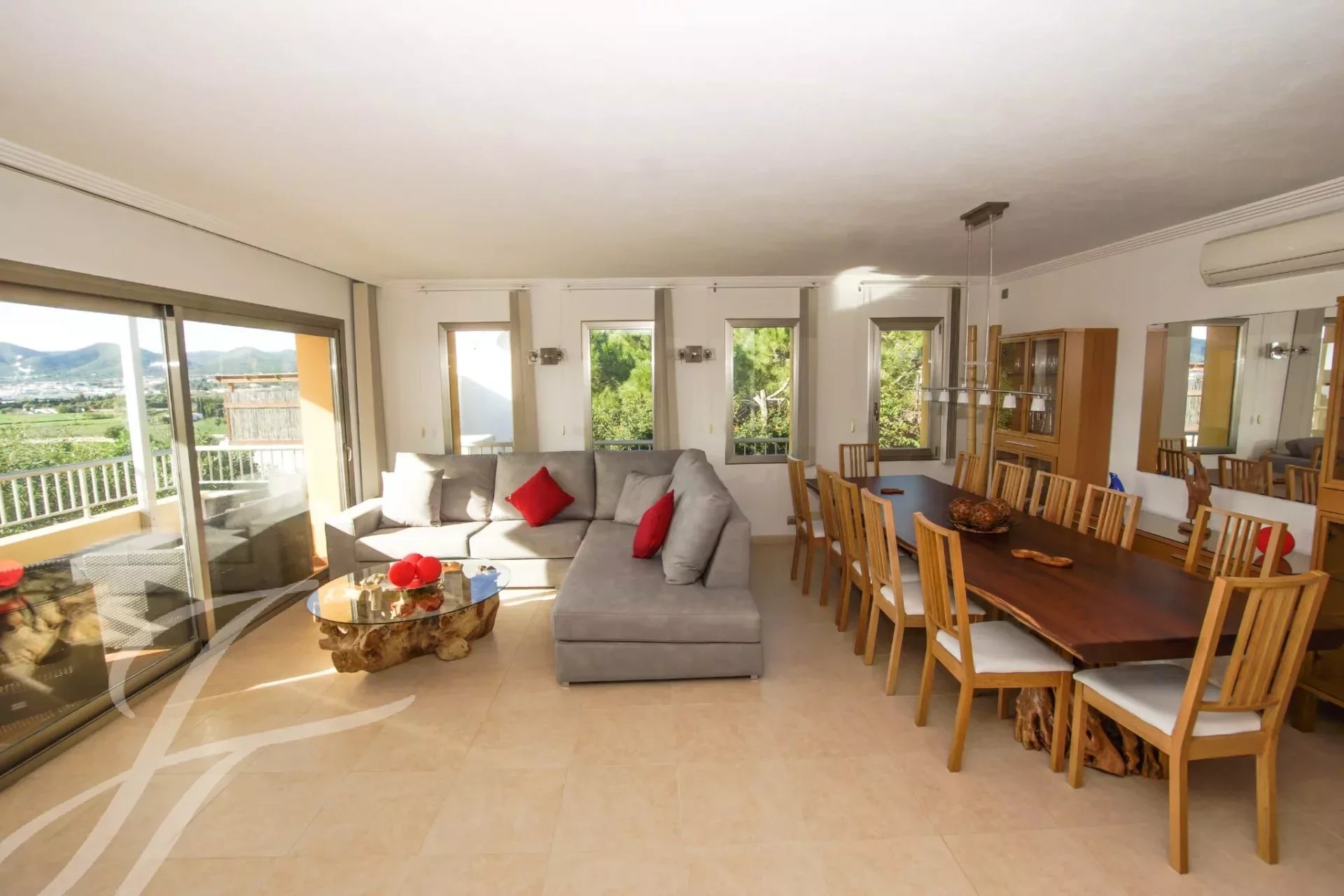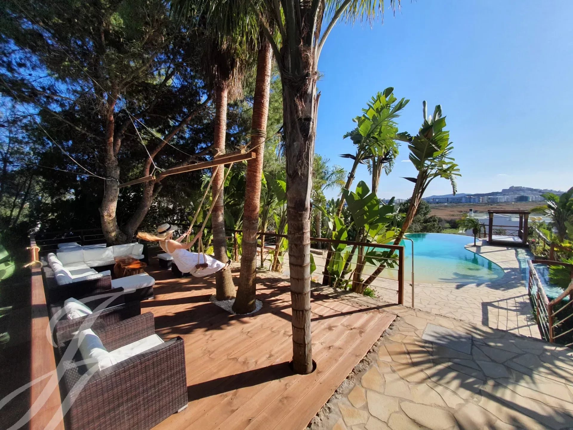 Die Villa erstreckt sich über drei Etagen und besteht aus sechs Schlafzimmern, acht Bädern, drei geräumigen Wohnzimmern, einer voll ausgestatteten Küche, einem Büro, einer Barbecue-Bar, einem Fitnessraum und einer Waschküche. Es hat auch mehrere Balkone und Terrassen mit bequemen Sesseln und Hängematten, um die atemberaubende Aussicht auf das Mittelmeer, Formentera und Dalt Vila zu genießen.