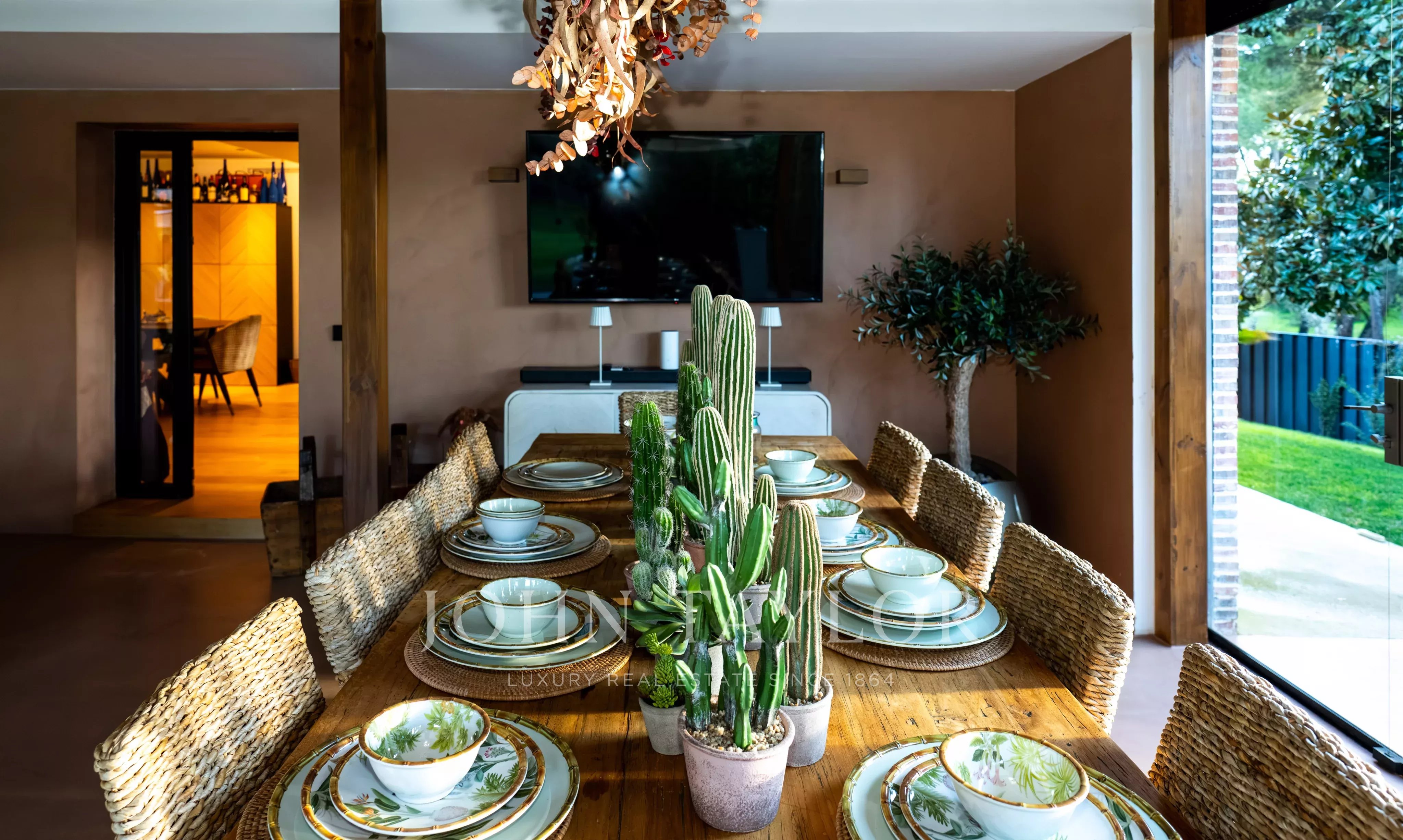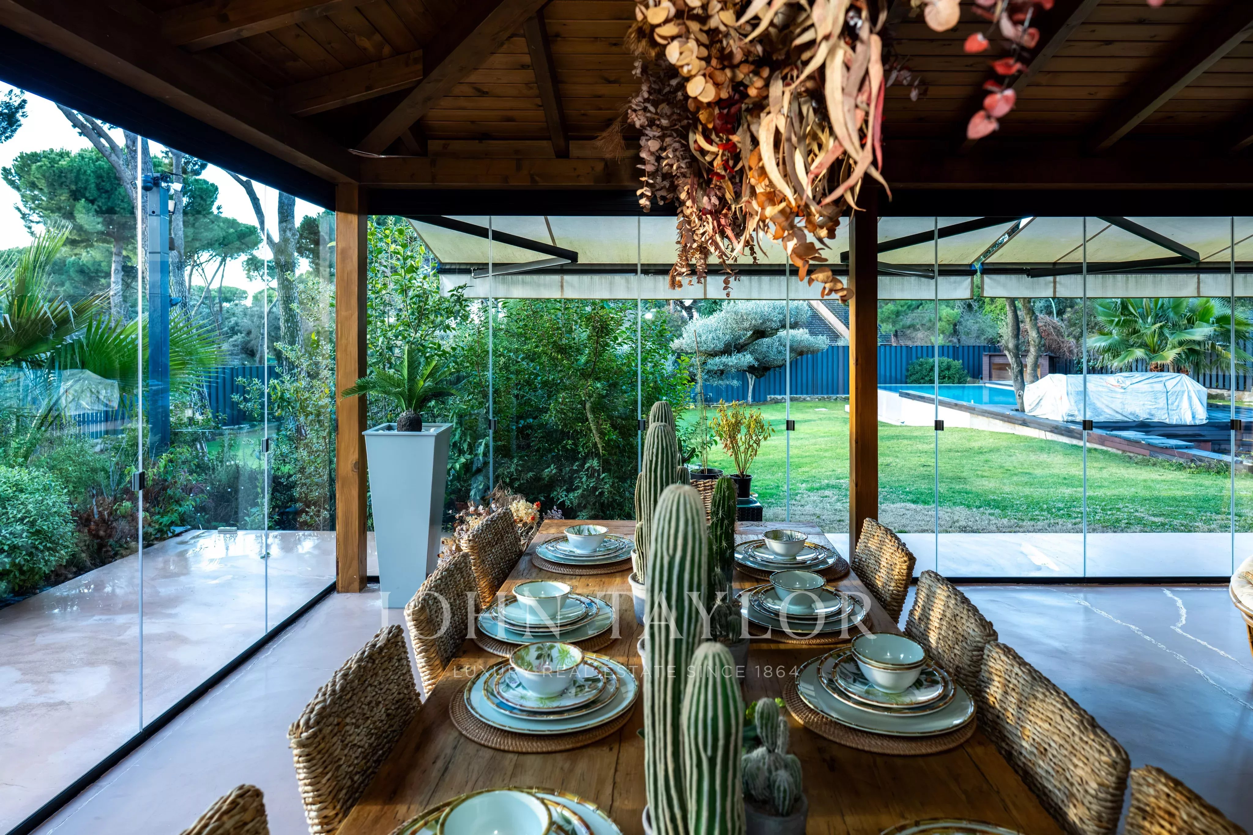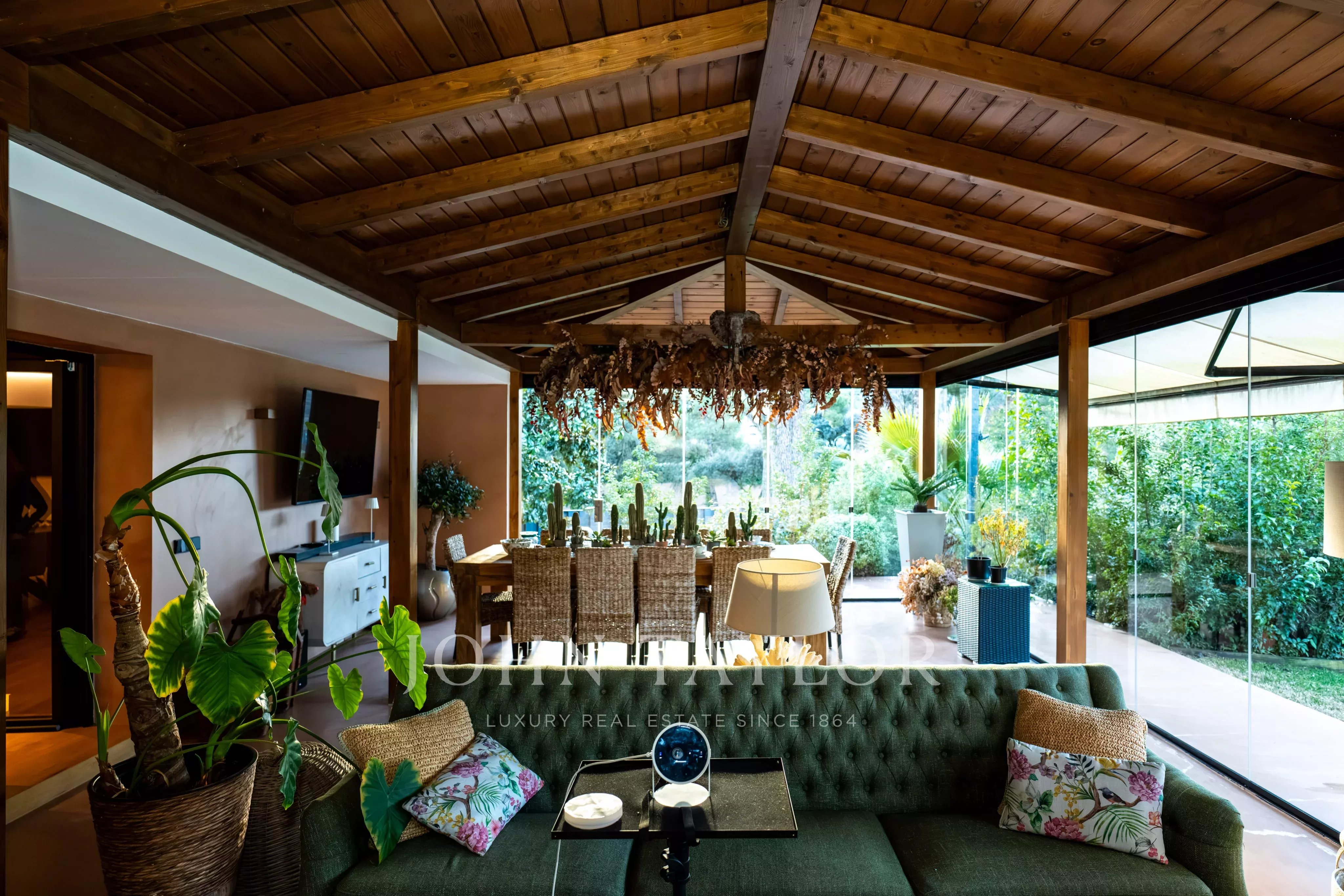 Die Villa erstreckt sich über zwei Etagen und überzeugt durch ihre großzügige Wohnfläche, hohe Decken, viel Tageslicht und eine funktionale Raumaufteilung. Der repräsentative Wohnbereich verfügt über ein großes Wohnzimmer mit Kamin und direktem Zugang zum Garten. Die voll ausgestattete Küche ist geräumig und eignet sich sowohl für den Alltag als auch für gesellige Anlässe. Ergänzt wird sie durch einen großen, geschlossenen und klimatisierten Bereich, der ganzjährig für Zusammenkünfte und Veranstaltungen genutzt werden kann.
