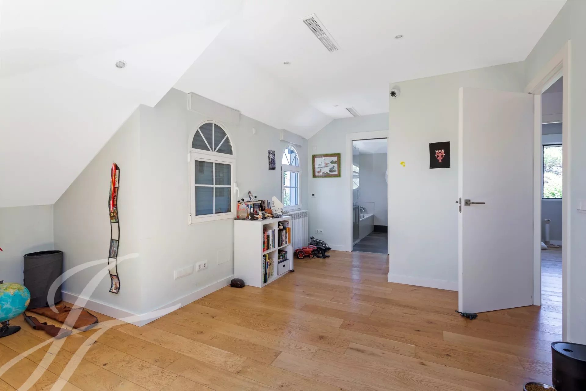 Auf der ersten Etage ist ein großes Schlafzimmer mit eigenem Bad und Terrasse mit Blick auf den Garten und den Pool, und ein großes Fenster mit Blick auf die Skyline von Madrid.