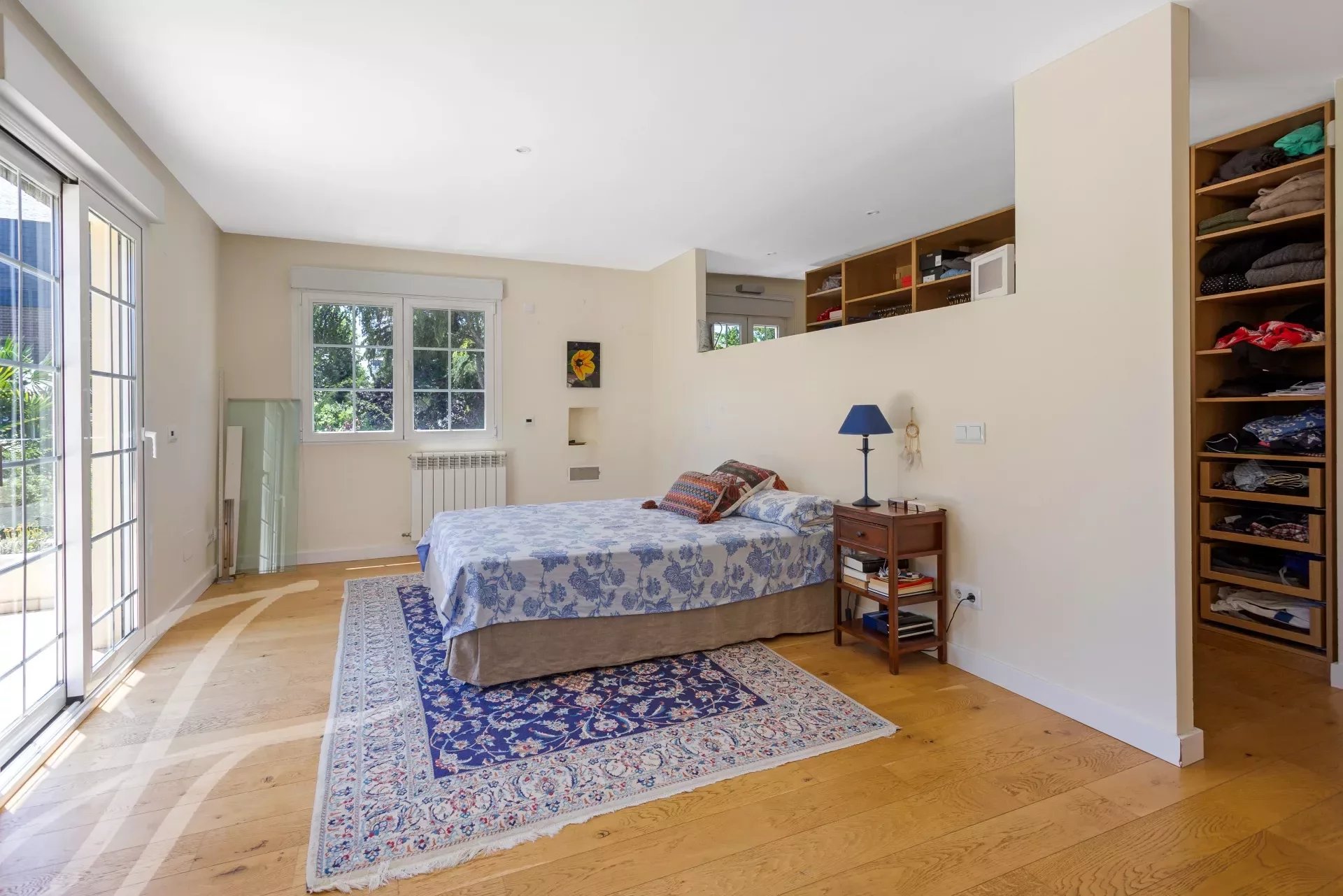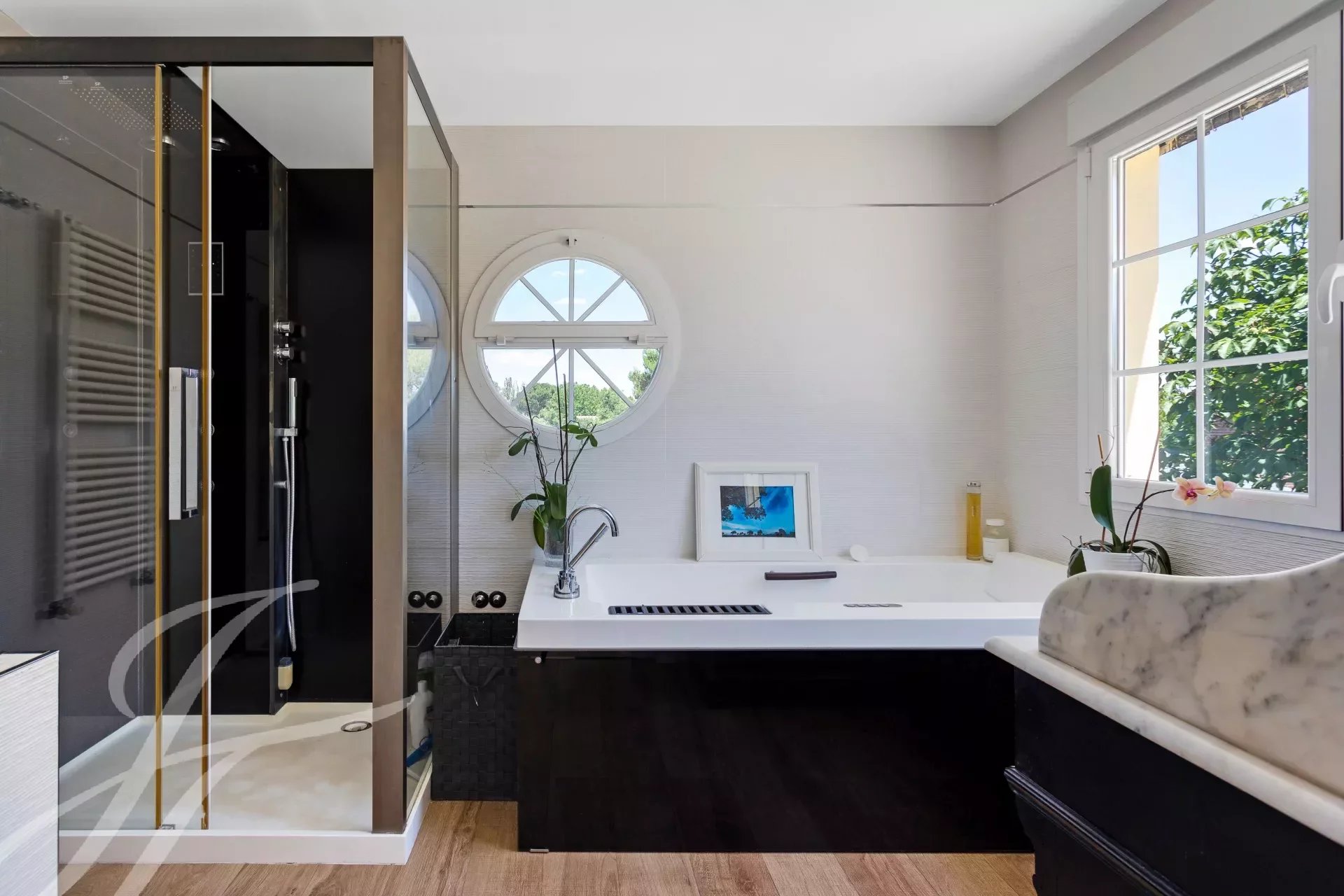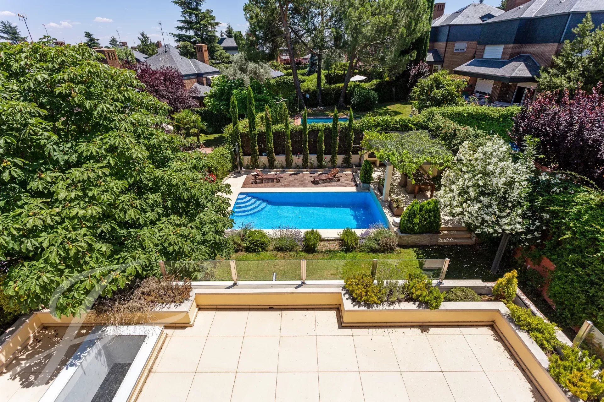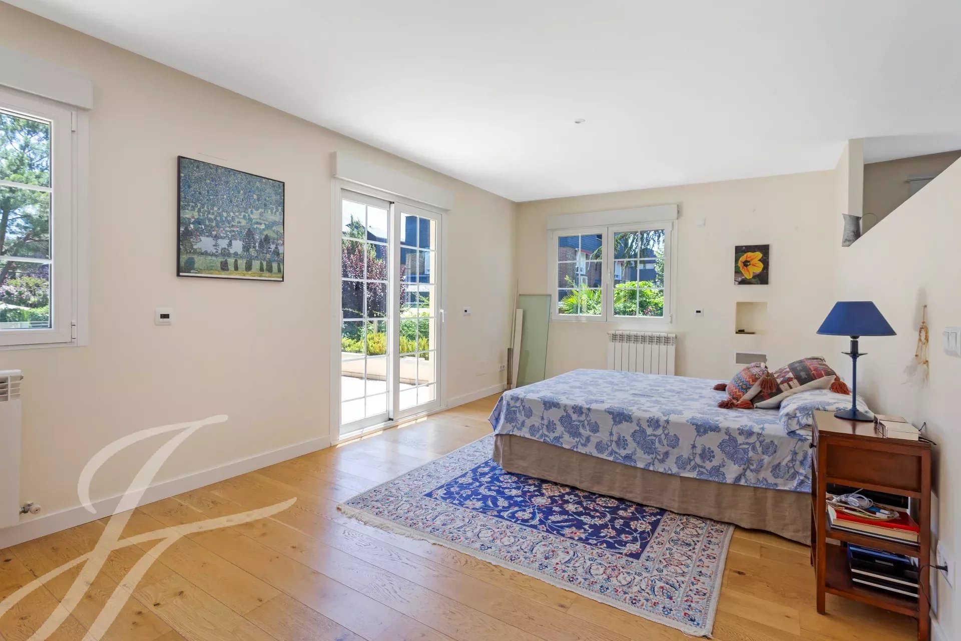 Im ersten Stock befindet sich das Hauptschlafzimmer mit eigenem Bad, Ankleidezimmer und großer Terrasse mit Blick auf den Garten und den Pool. Im Badezimmer gibt es eine Jacuzzi-Badewanne und eine Dampfkabine. Zwei weitere Schlafzimmer mit gemeinsamen Bad.