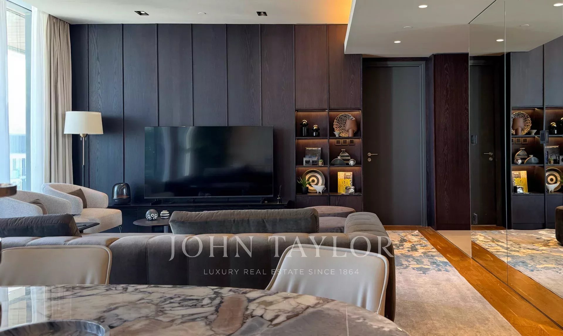 * Modernes Interieur: Elegante Wohn-, Ess- und Küchenbereiche mit hochwertigen Oberflächen.