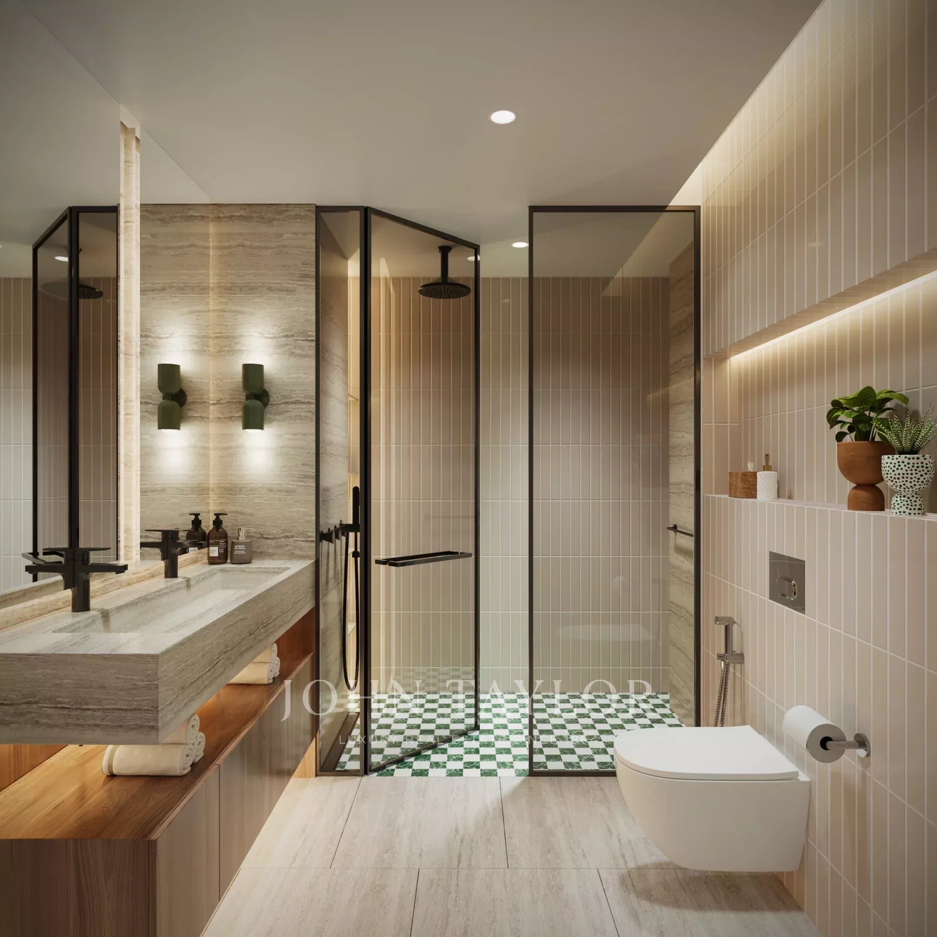 Elegantes Badezimmer: Luxuriöses Design mit hochwertigen Armaturen und Oberflächen, die ein anspruchsvolles Spa-ähnliches Erlebnis bieten.