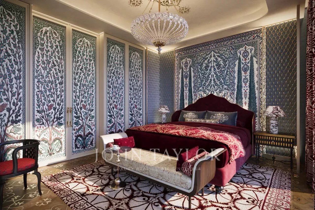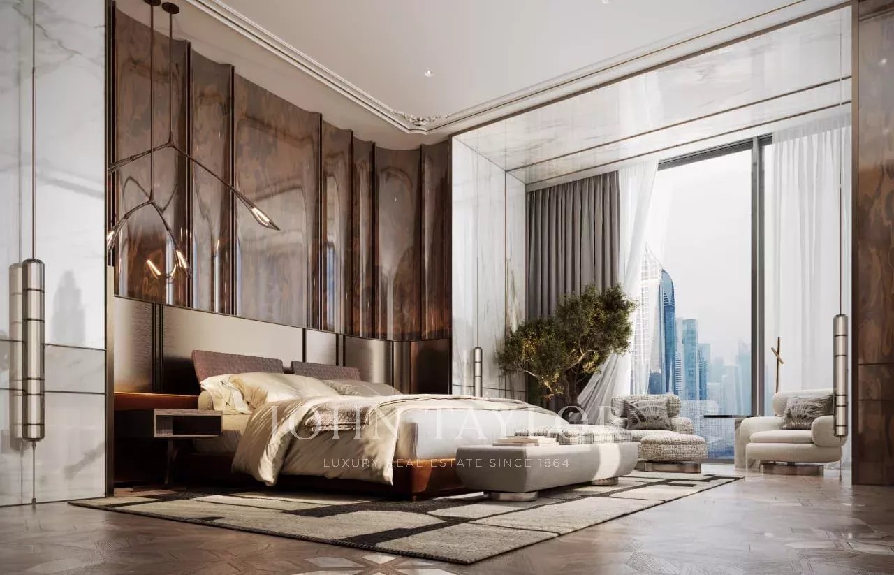 Hauptschlafzimmer: Ein luxuriöses Hauptschlafzimmer mit eigenem Bad, begehbarem Kleiderschrank und Panoramablick auf die Skyline von Dubai.