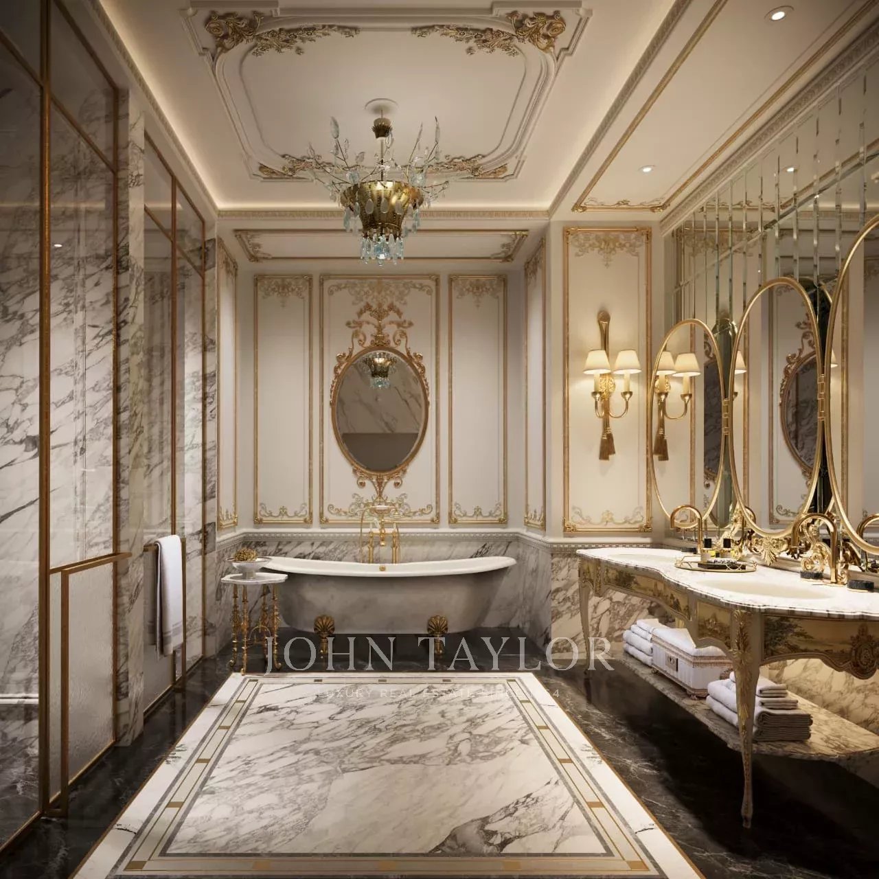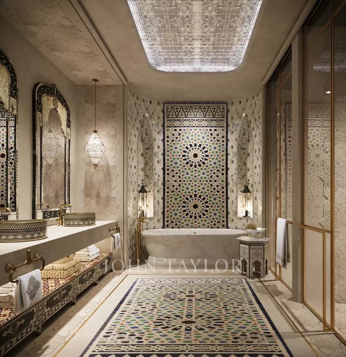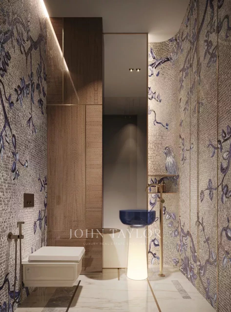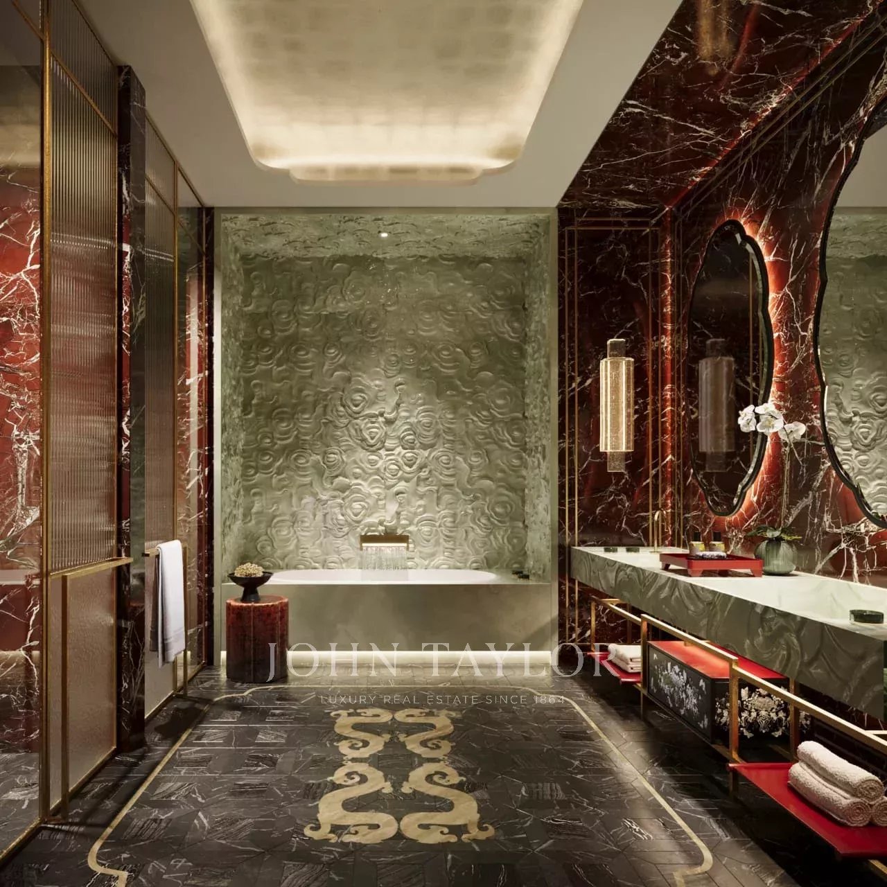 Erstklassige Ausstattung: Hochwertige Marmorböden, Designer-Armaturen und raumhohe Fenster, die den Raum mit natürlichem Licht durchfluten.
