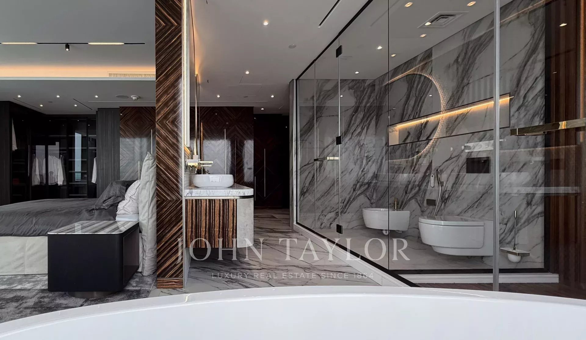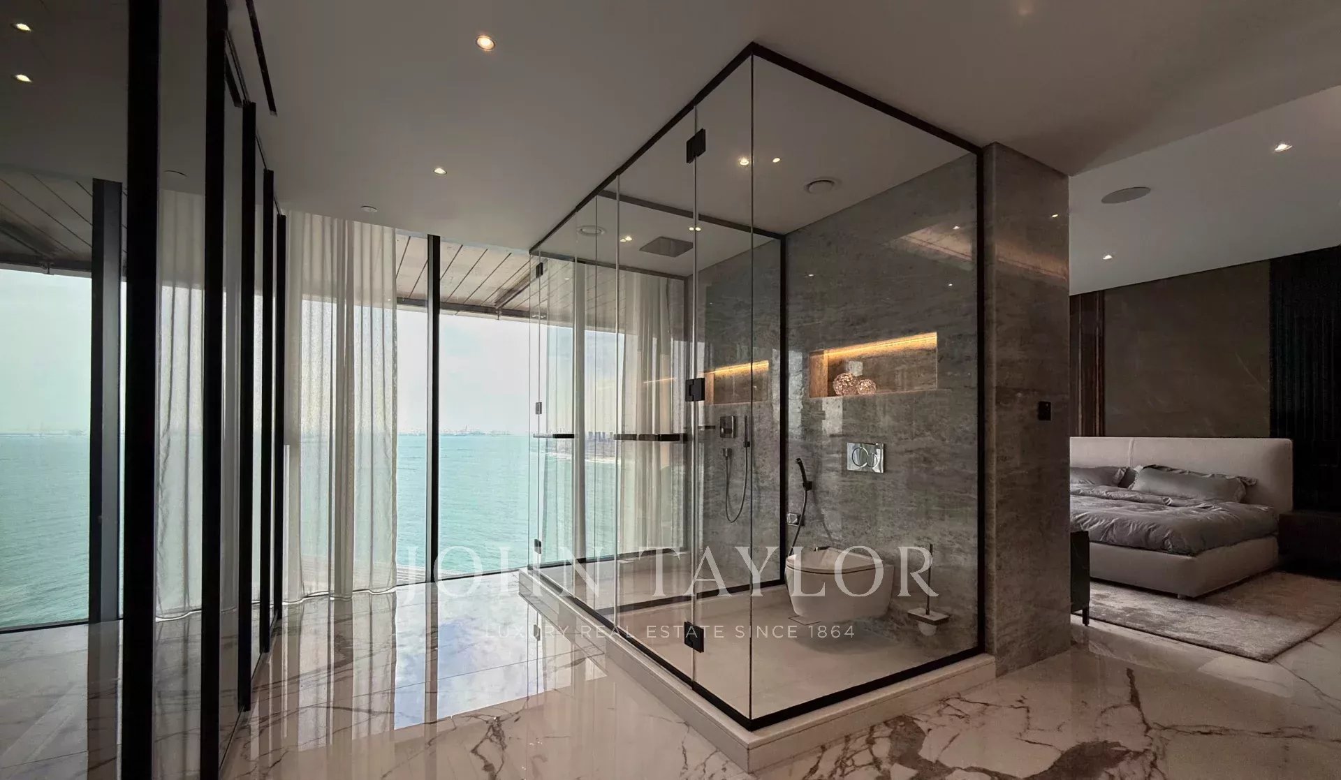 Master-Suite mit großem Kleiderschrank und Badezimmer mit Meerblick