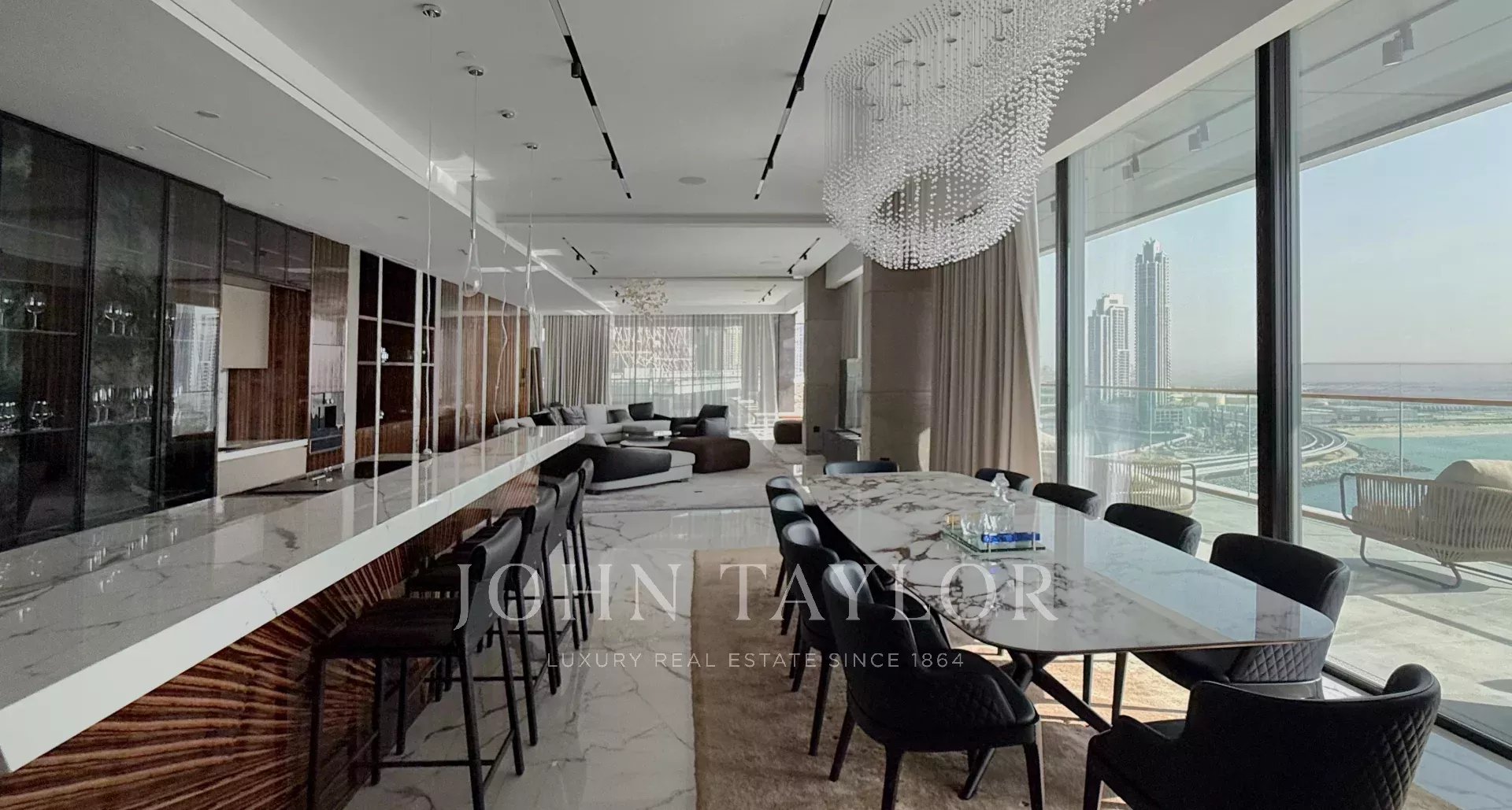 John Taylor Luxury Real Estate präsentiert dieses außergewöhnliche, voll möblierte 5-Schlafzimmer-Penthouse auf der kultigen Insel Bluewaters Island. Es bietet 870 m² maßgeschneiderten Wohnraum, Panoramablick auf das Meer und unvergleichliche Privatsphäre. Diese Immobilie definiert High-End-Küstenleben im Herzen von Dubai neu.