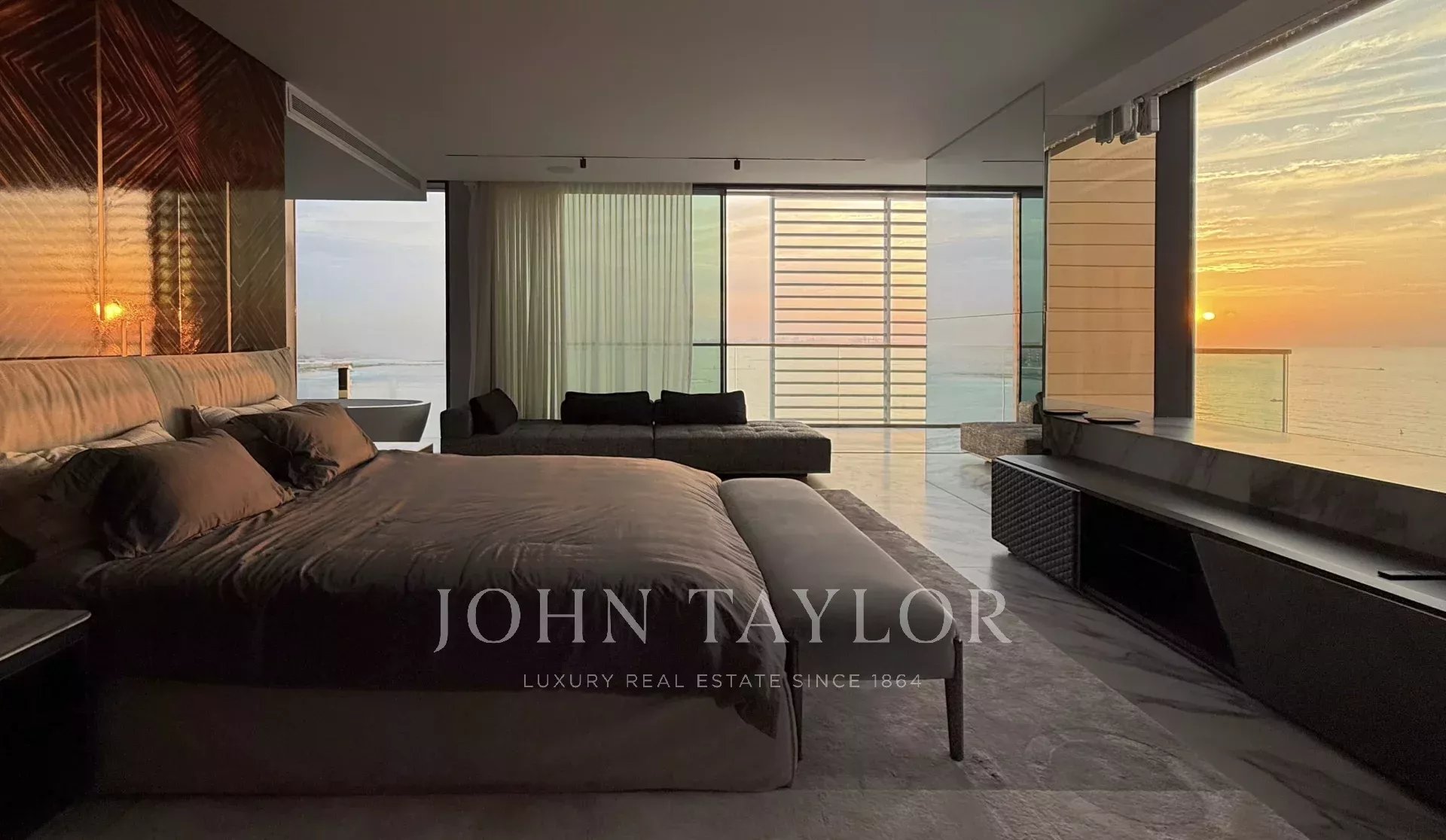 Zweites Hauptschlafzimmer auf der unteren Ebene mit Blick auf den Sonnenuntergang und eigener Terrasse