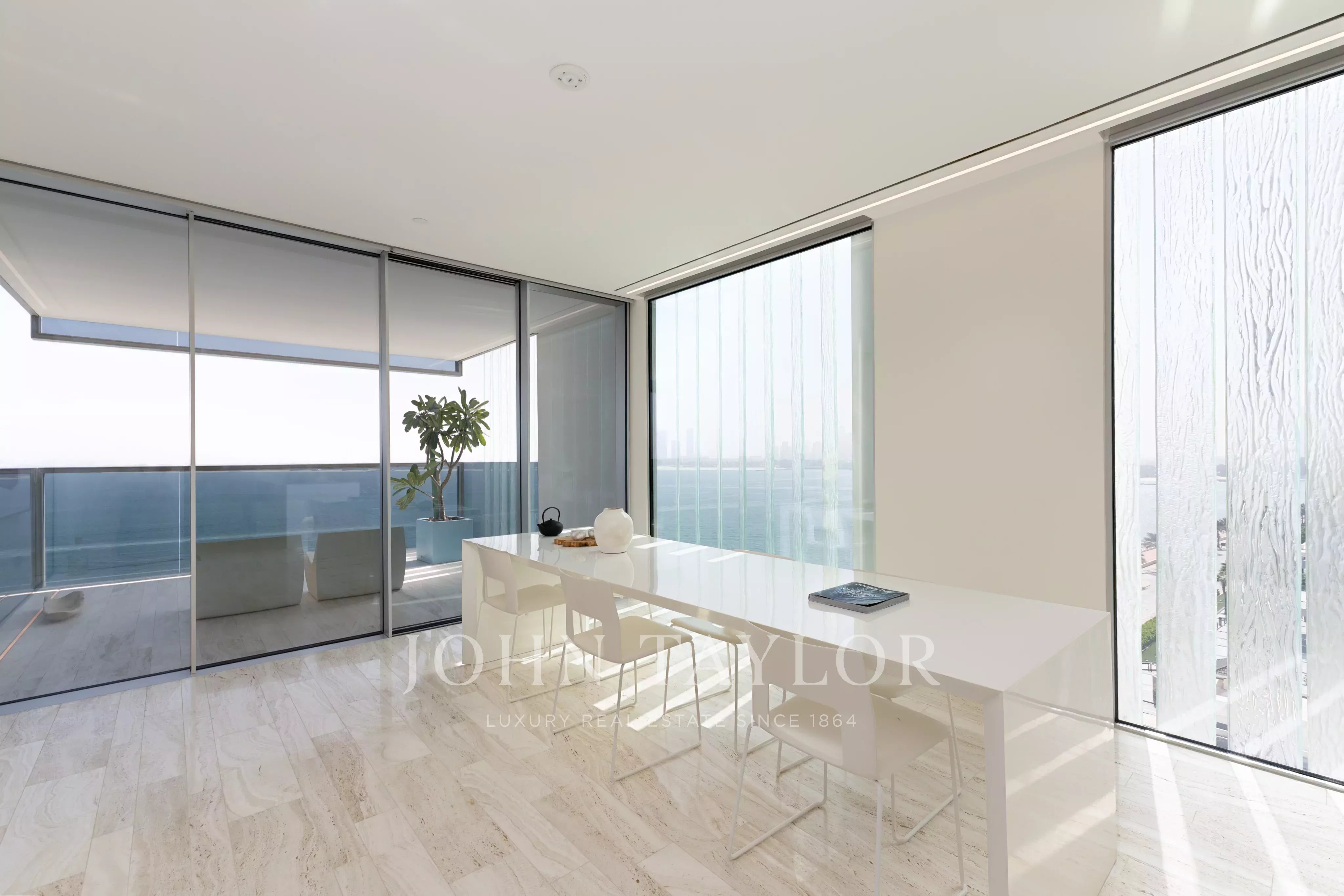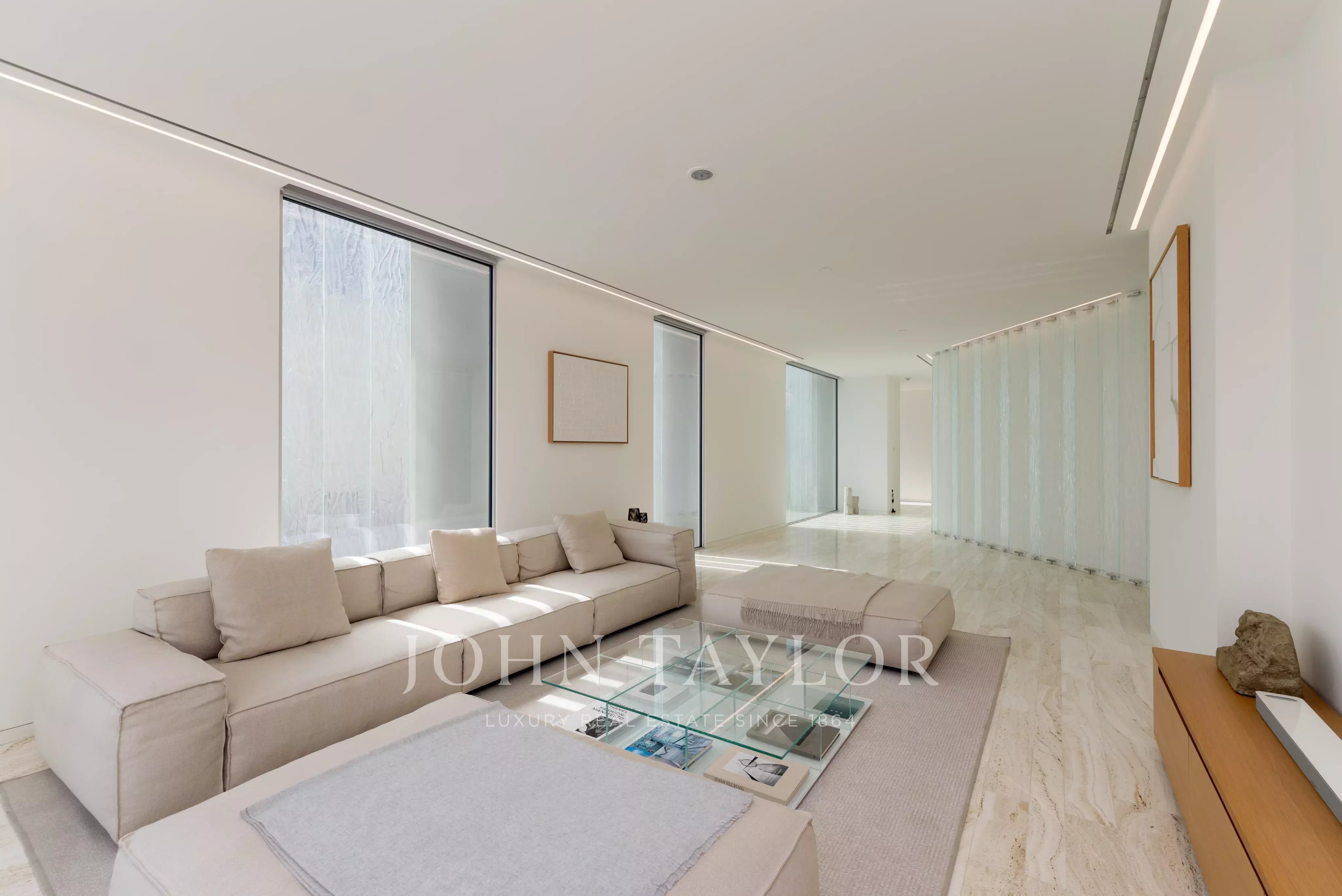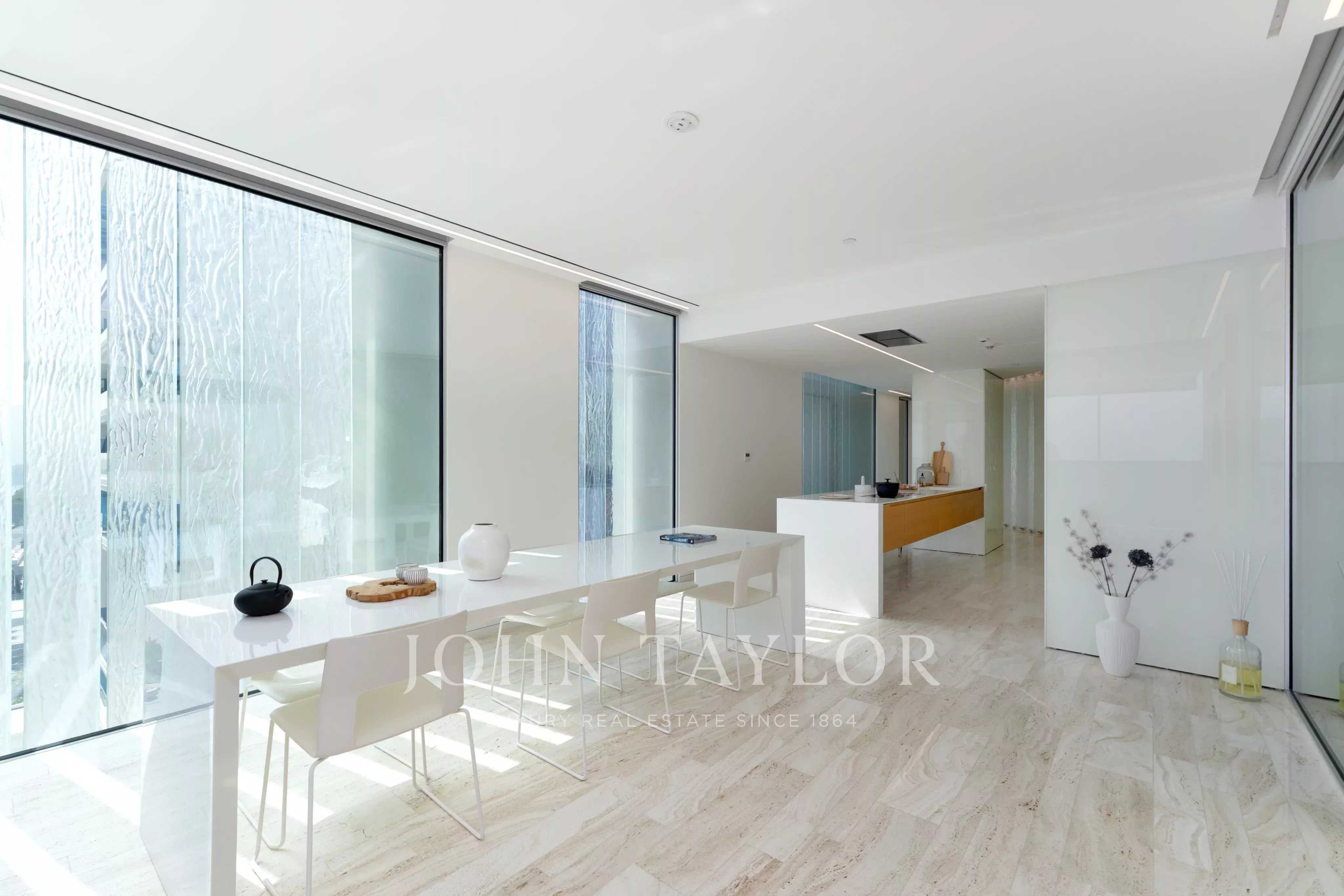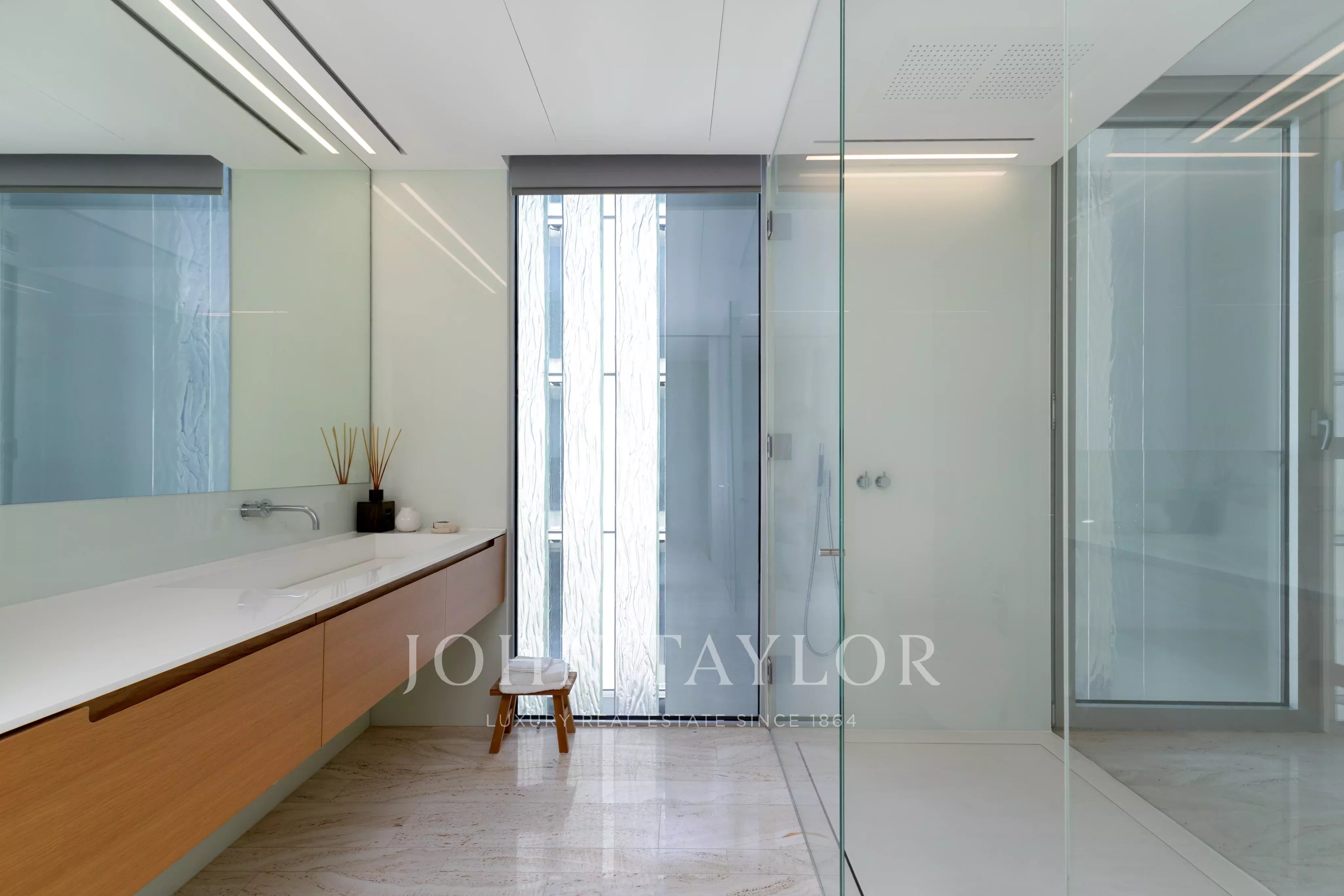 Das Haus ist über einen privaten Aufzug zu erreichen und öffnet sich in einem Eingangsfoyer, das sofort Exklusivität und Diskretion vermittelt. Ein zweites, halbprivates Aufzugspodest ermöglicht einen nahtlosen Zugang für das Personal, so dass die Privatsphäre der Bewohner gewahrt bleibt, ohne dass der Betrieb beeinträchtigt wird. Die Wohnung verfügt über rahmenlose Schiebetüren von Sky-Frame, Touch Control von Geberit, Panzeri-Leuchten, Eisenwaren von d line sowie drahtlose Dimmer und motorisierte Jalousien von Lutron.