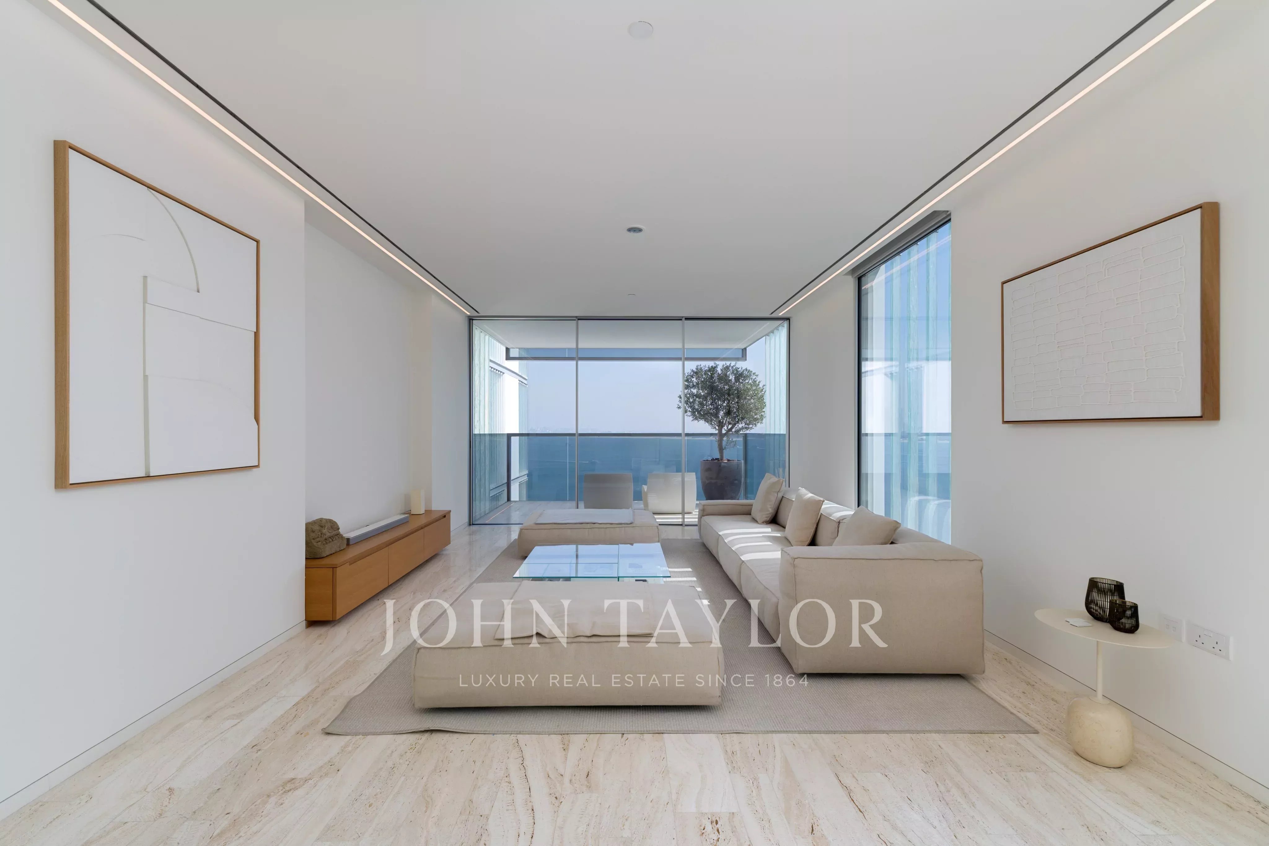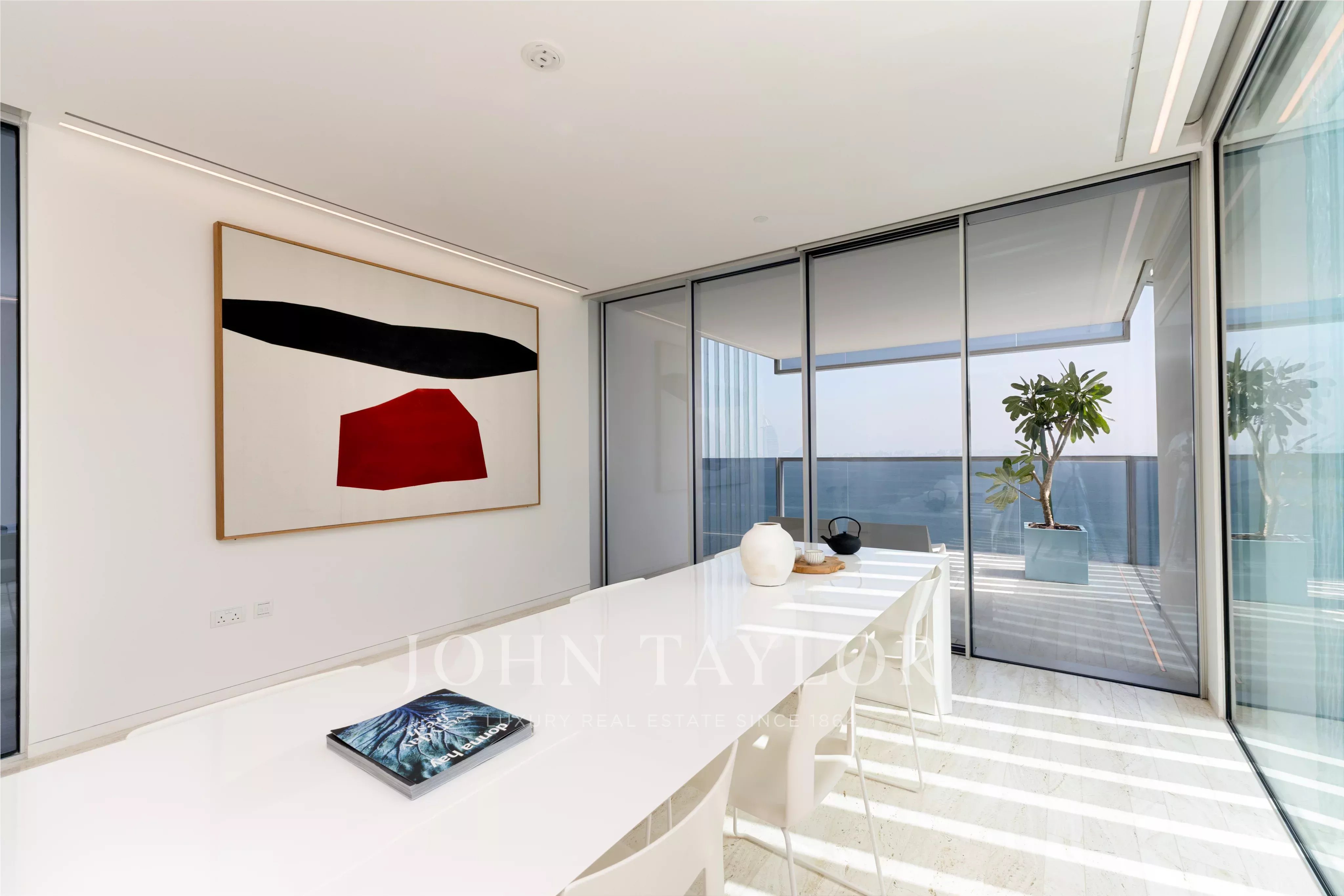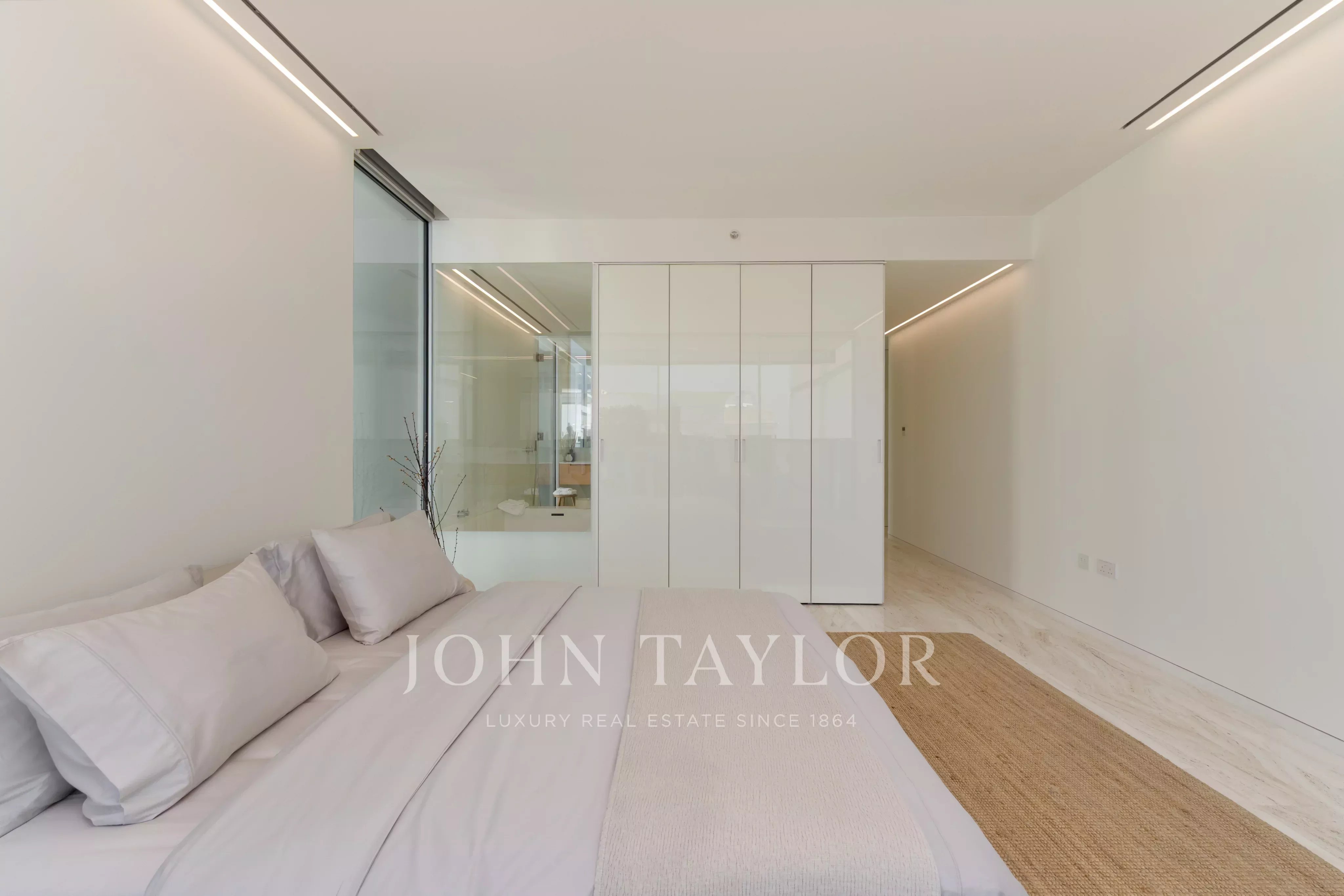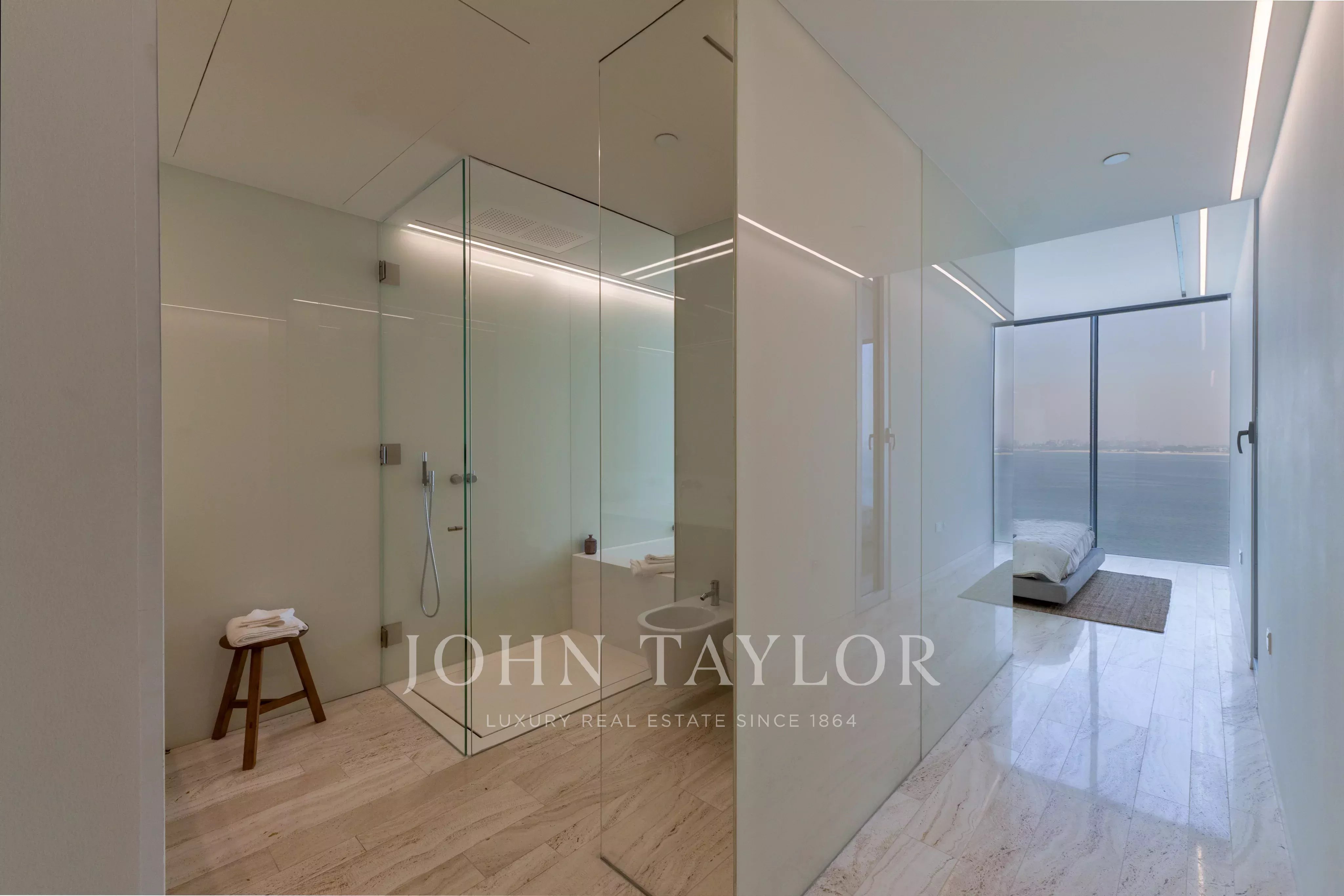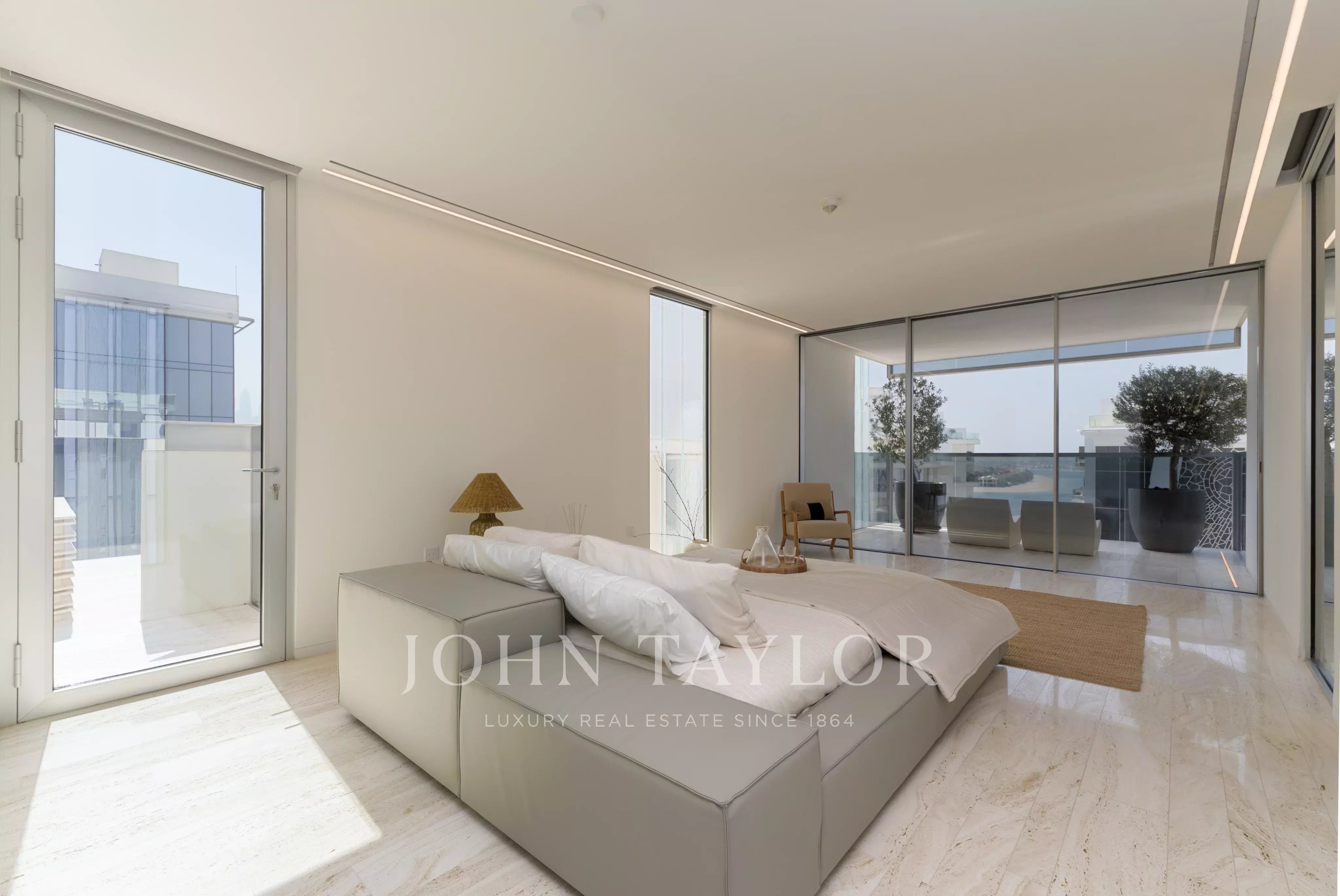 Dieses atemberaubende, möblierte Penthouse in Muraba Dia erstreckt sich über eine bebaute Fläche von 6.656 Quadratmetern und verfügt über fünf Schlafzimmer, die alle in einem modernen Stil eingerichtet sind. Neutrale Töne in der weichen Einrichtung und skandinavische Möbel machen dies zu einem Haus, das die meisten Besitzer ansprechen würde, um einzuziehen und es zu ihrem eigenen zu machen. Die Ost-West-Ausrichtung bietet einen weiten Blick auf das Meer und die sichelförmige Palme und ermöglicht es Ihnen, das Sonnenlicht zu verschiedenen Tageszeiten zu genießen. Der clevere Grundriss schafft den Spagat zwischen Privatsphäre und Offenheit, was zum großen Teil der architektonischen Brillanz des preisgekrönten spanischen Architekturbüros RCR Arquitectes zu verdanken ist, das einen großzügigen und durchdachten Raum geschaffen hat. Ultraflache Schiebetüren und -fenster sorgen für einen einfachen Übergang zwischen Innen- und Außenbereich und verstärken das offene Design und die Verbindung zur Umgebung.