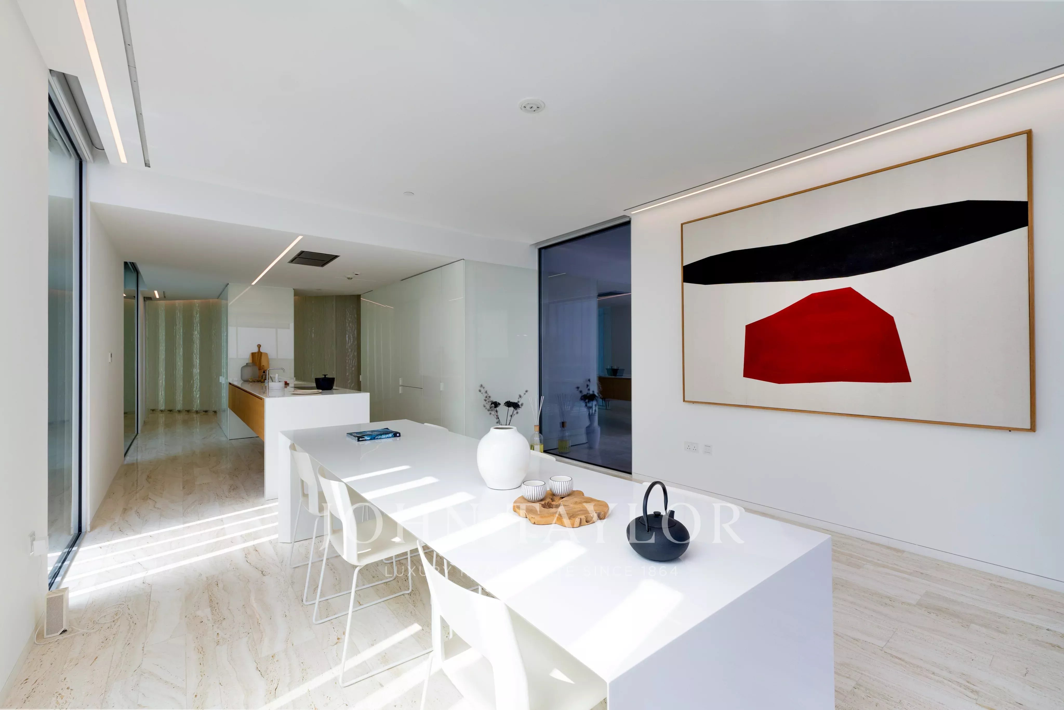Neben dem Wohnbereich befindet sich ein formelles Esszimmer, das sich auf eine eigene Terrasse erstreckt und den nahtlosen Übergang zwischen Innen- und Außenbereich noch verstärkt.