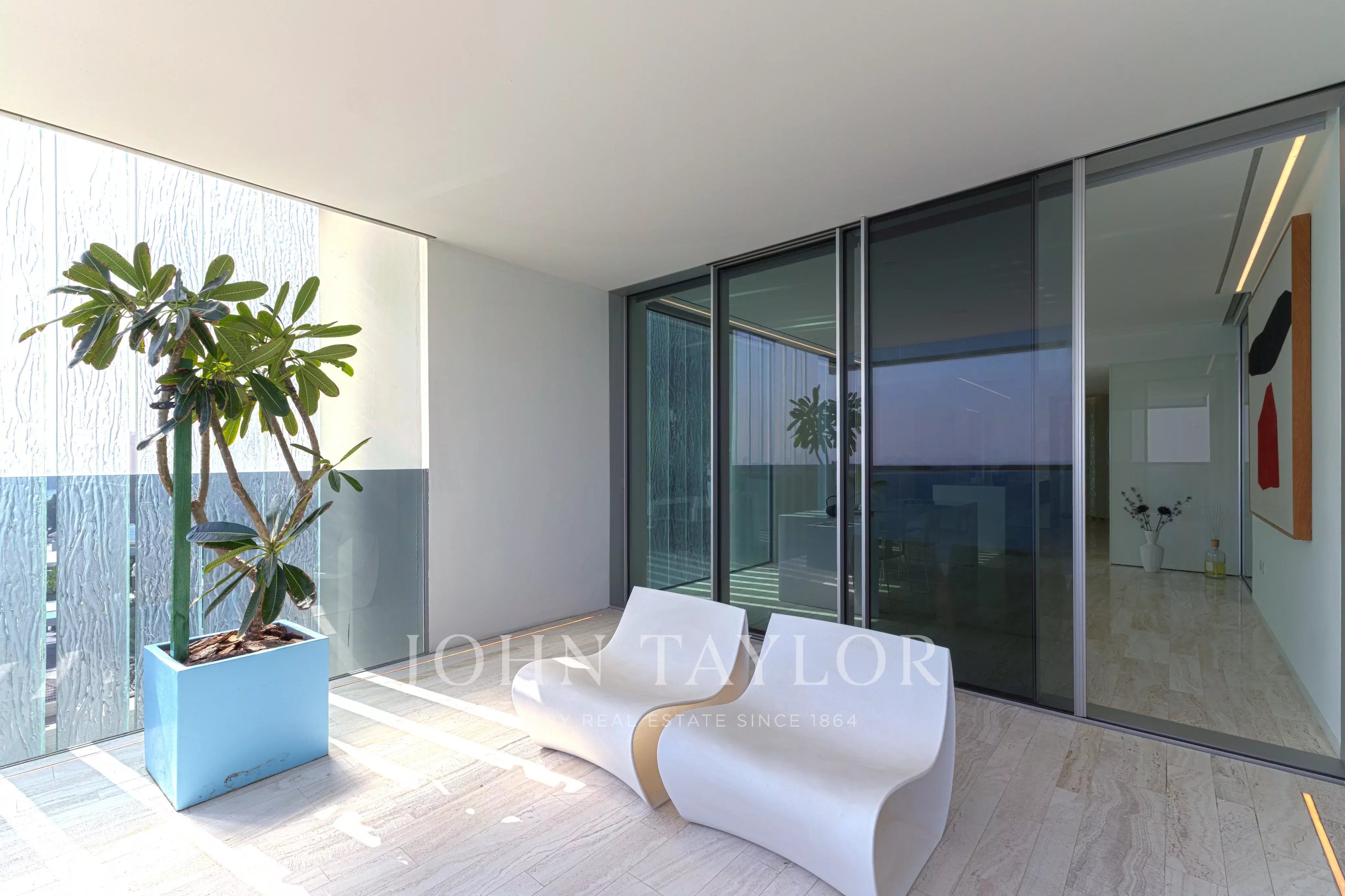 Die bemerkenswerte 29 m lange Terrasse ist ein wesentliches Merkmal des Penthouses und stellt eine natürliche Erweiterung der inneren Wohnräume dar. Sie wurde für Unterhaltung und Entspannung konzipiert und verfügt über einen eigenen Bereich mit Sonnenliegen, von dem aus man einen atemberaubenden Blick auf das Meer und die Sichel der Palme hat.