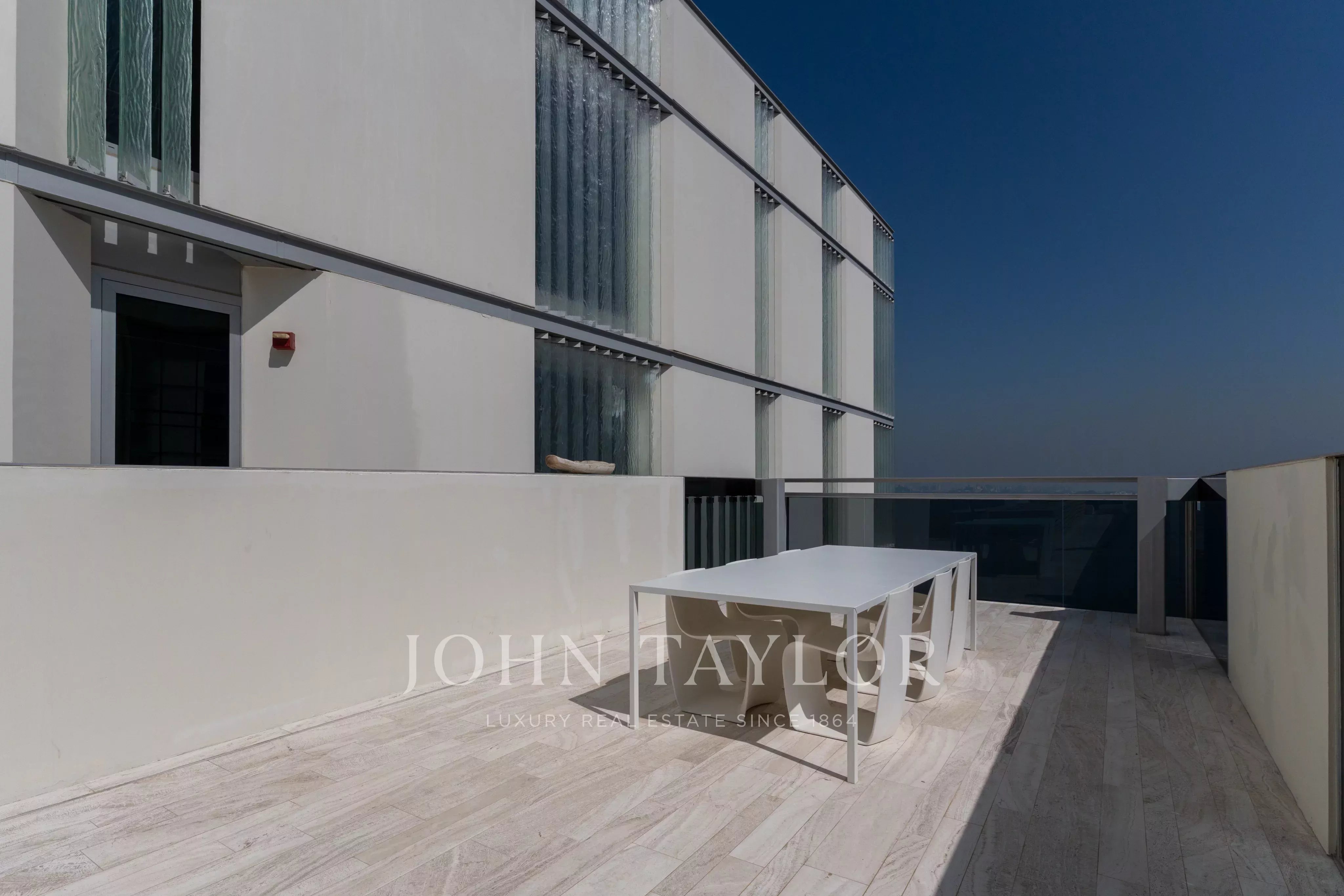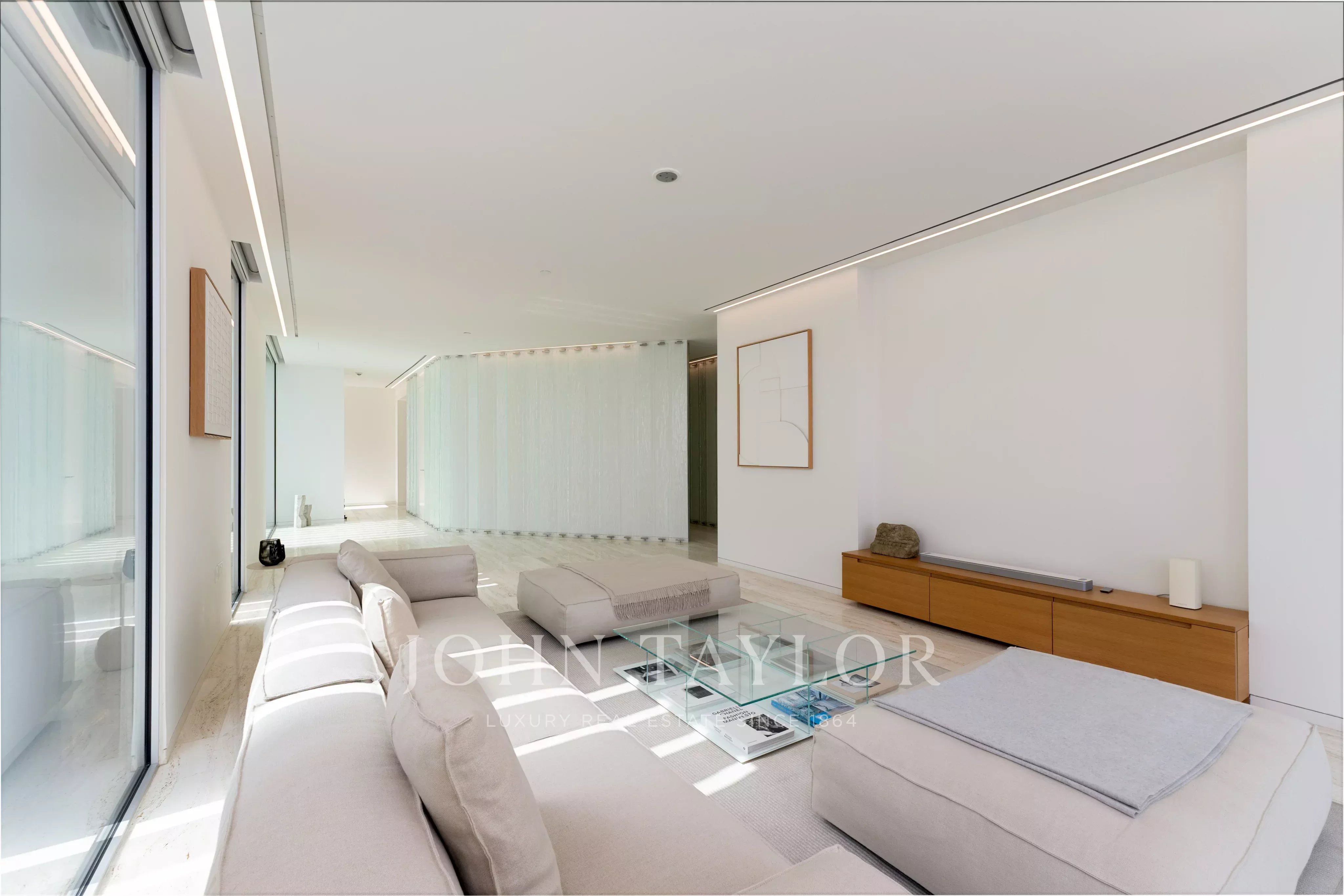 Der Grundriss entfaltet sich zu einem Wohnzimmer, das sich über die gesamte Fassade erstreckt und so gestaltet ist, dass es ein Maximum an Licht und Aussicht bietet, während es direkt mit einer bemerkenswerten 29 m langen Terrasse verbunden ist. Dieser außergewöhnliche Außenbereich fungiert als natürliche Erweiterung des Innenraums und dient als perfekter Raum für Unterhaltung, komplett mit einem Bereich für Sonnenliegen.