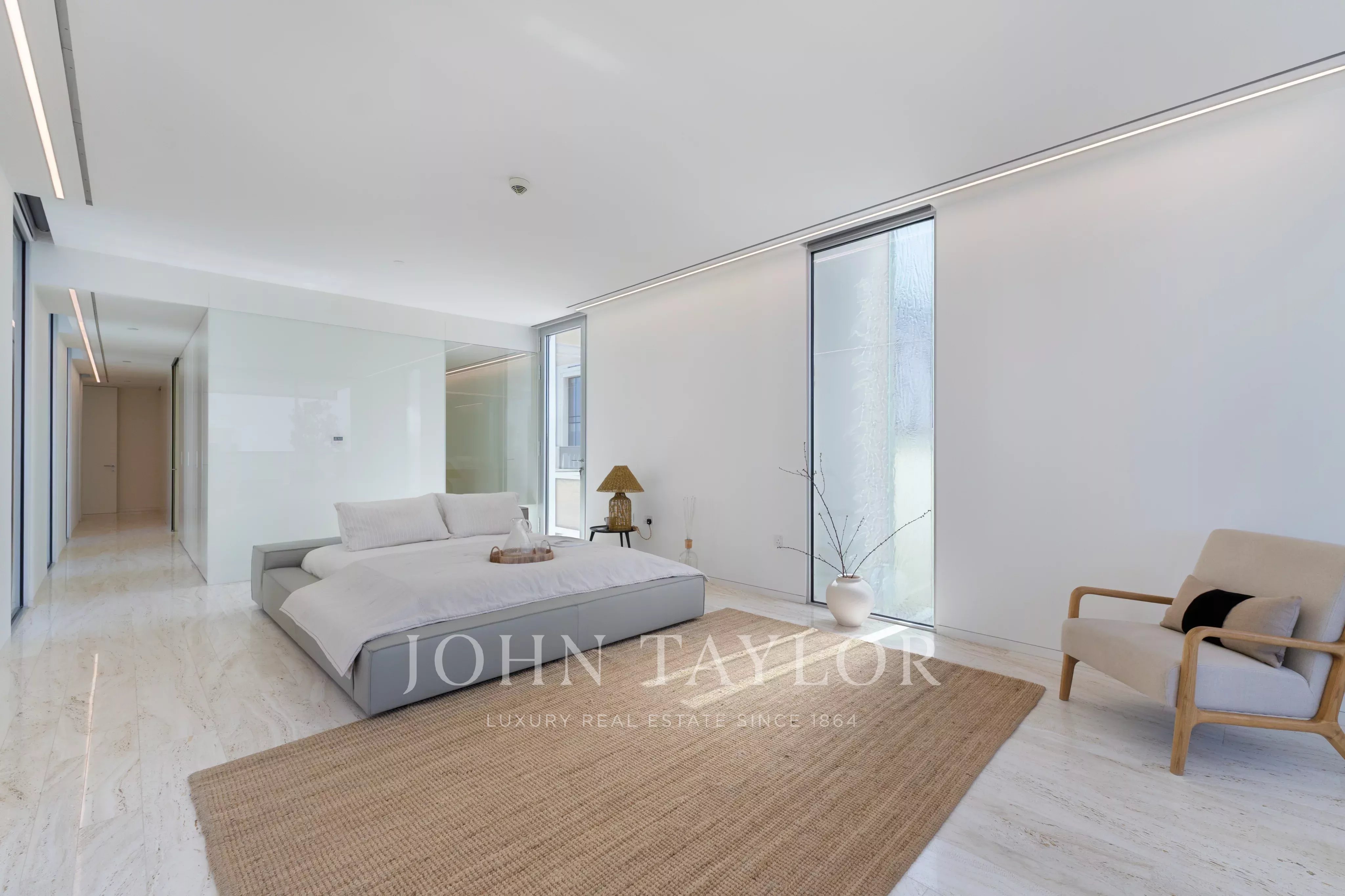 Die Master-Suite ist als privates Refugium konzipiert. Es verfügt über einen geräumigen begehbaren Kleiderschrank und ein luxuriöses eigenes Bad mit Dusche und Badewanne. Der direkte Zugang zu einer Terrasse verstärkt das Gefühl des Rückzugs und der Verbundenheit mit der Natur. Vier weitere Schlafzimmer sind großzügig angelegt, jedes mit eigenem Bad und Zugang zu privaten oder gemeinsamen Terrassen, um Komfort und Privatsphäre für Familie und Gäste gleichermaßen zu gewährleisten. Die Schlafzimmer sind mit Schränken von Rimadesio und Innentüren von L'invisibile ausgestattet. Die Bäder sind mit Vola-Mischern und -Armaturen, Lagares-Badewannen und -Duschwannen sowie Sanitärkeramik von Kartell ausgestattet.