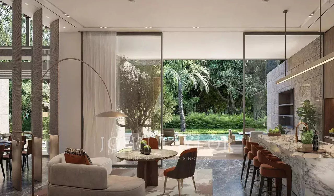* Nahtloses Innen-Außenleben: Vom Boden bis zur Decke reichende Schiebefenster verbinden die luxuriösen Innenräume mit den sorgfältig angelegten Gärten und einem privaten Pool.