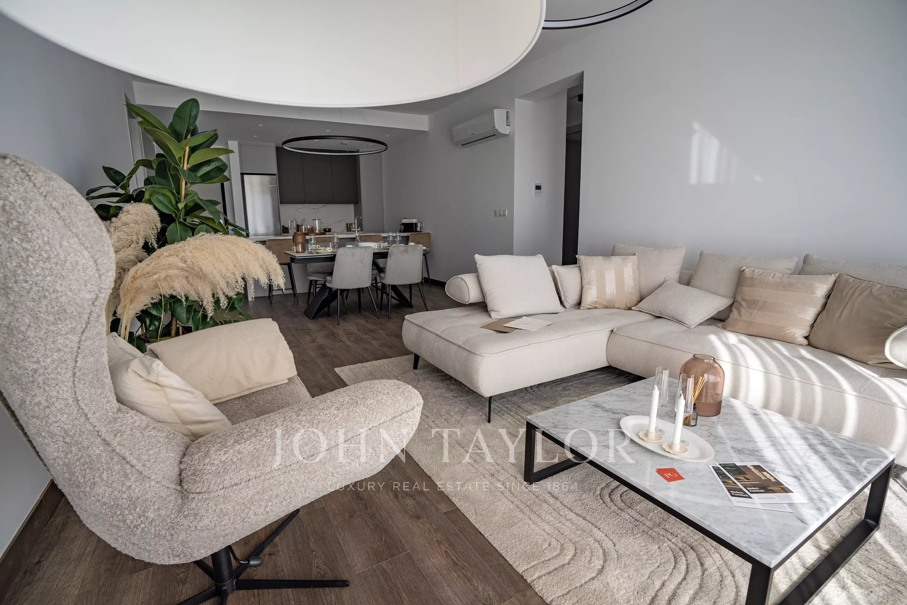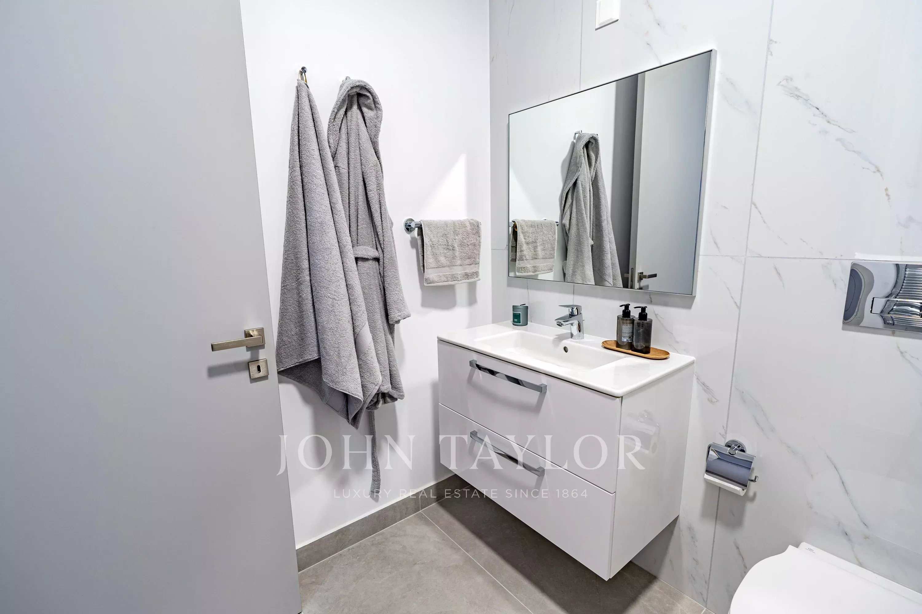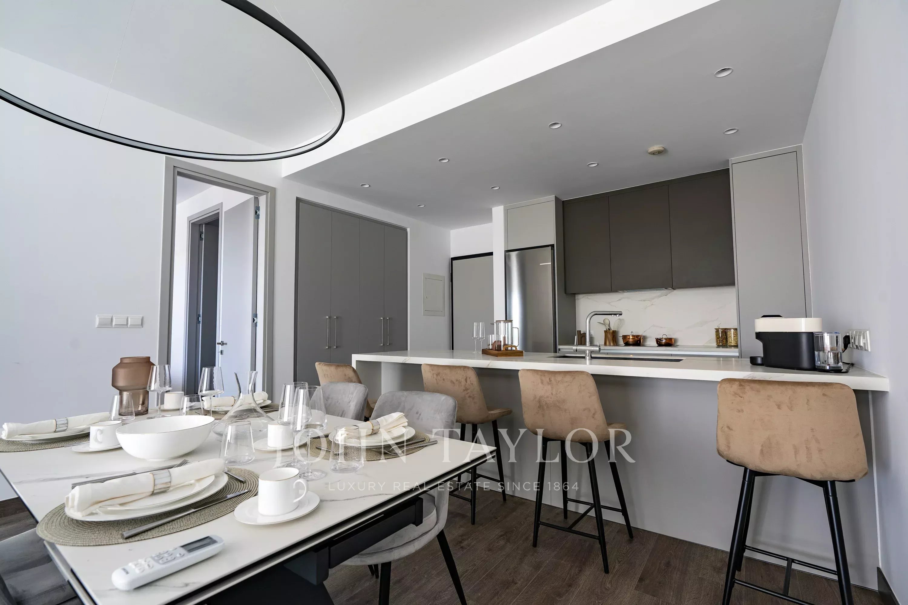 Energieeffizienzklasse A, VRV-Klimaanlage, Fußbodenheizung, thermische Aluminium-Doppelverglasung, hohe Decken (~3,0 m), hochwertige Keramikoberflächen, Einbauschränke und eine moderne Küchengestaltung.