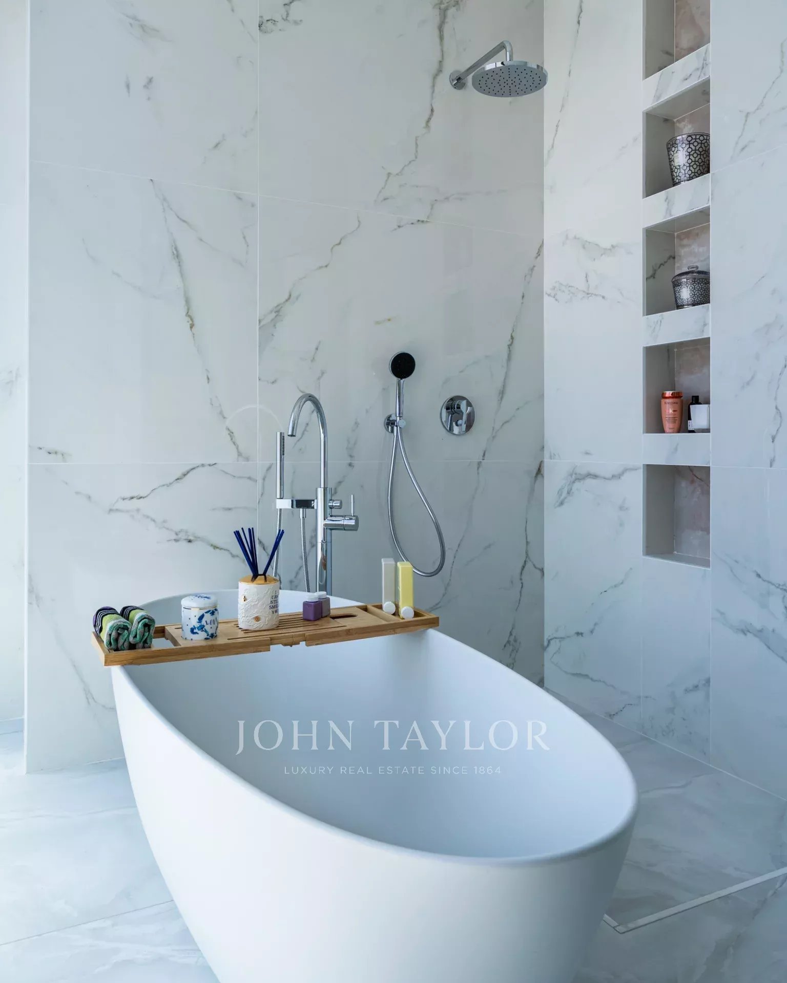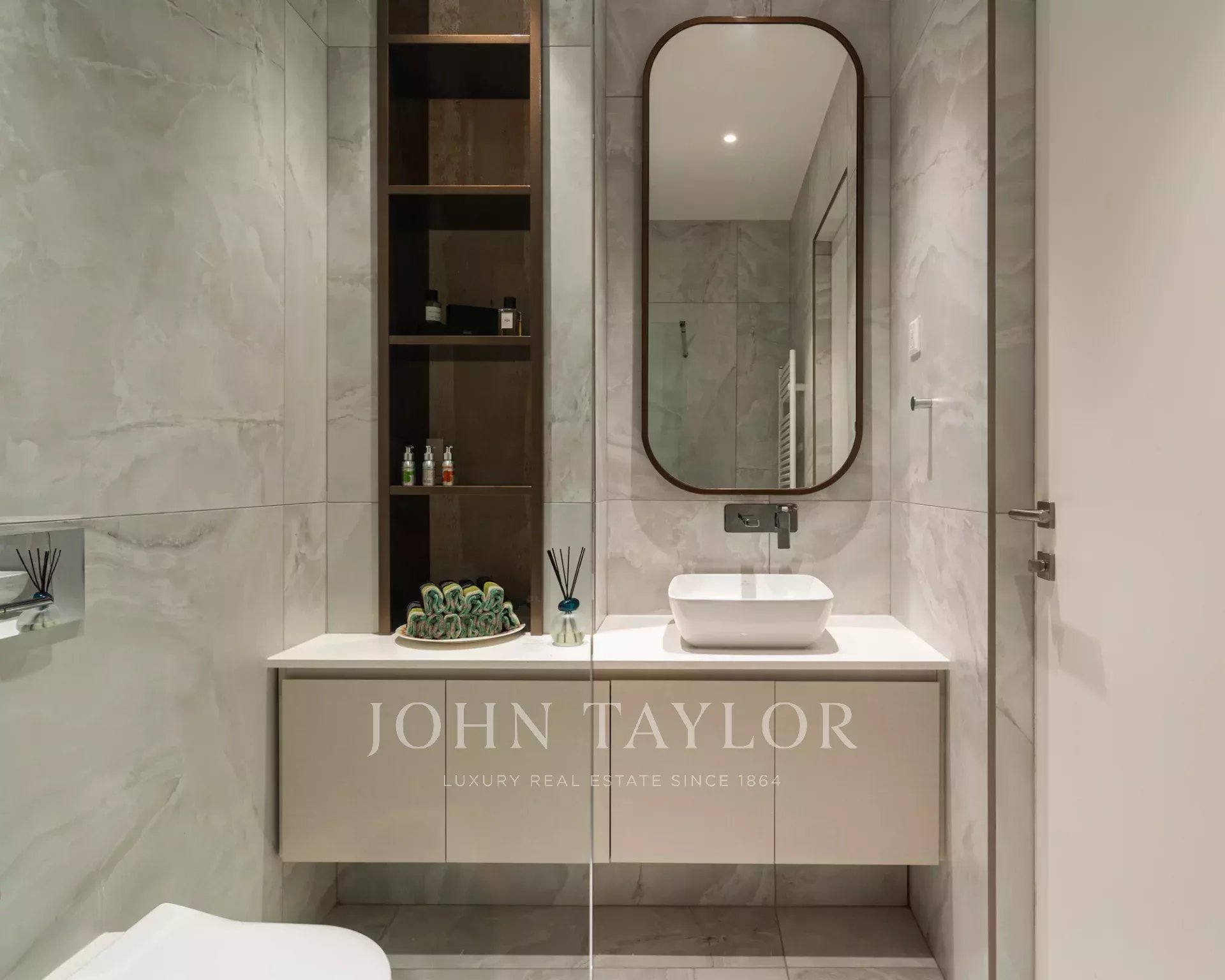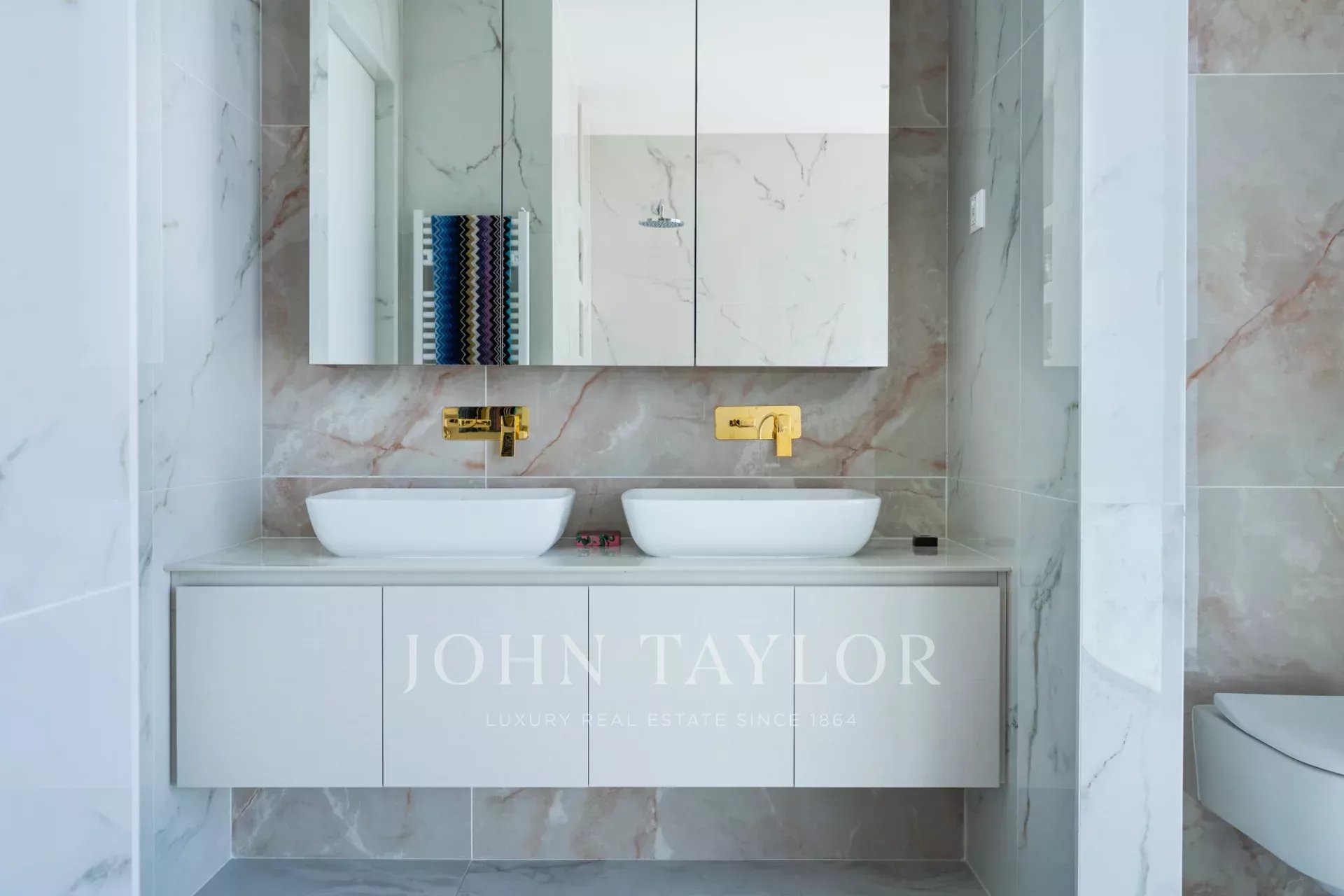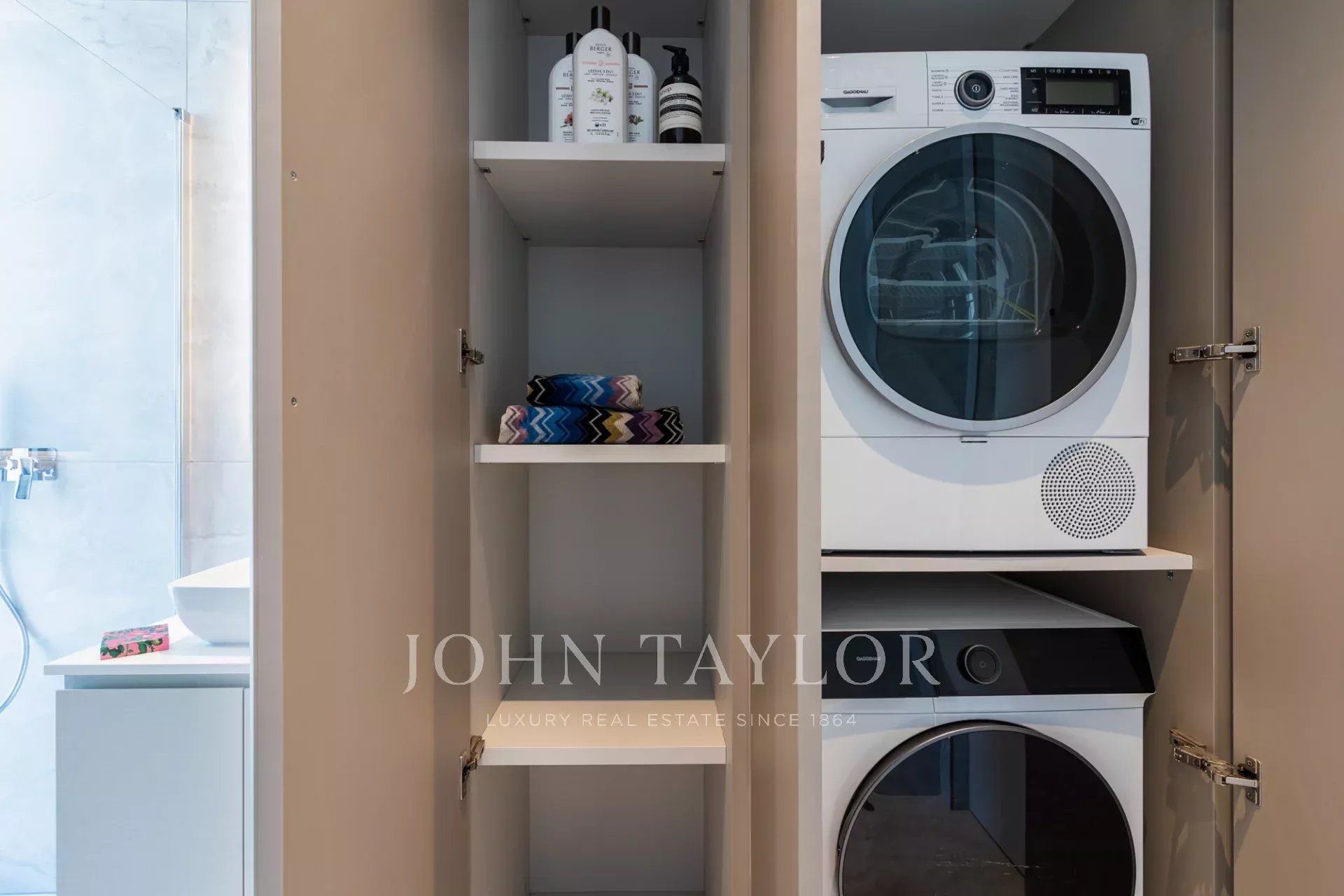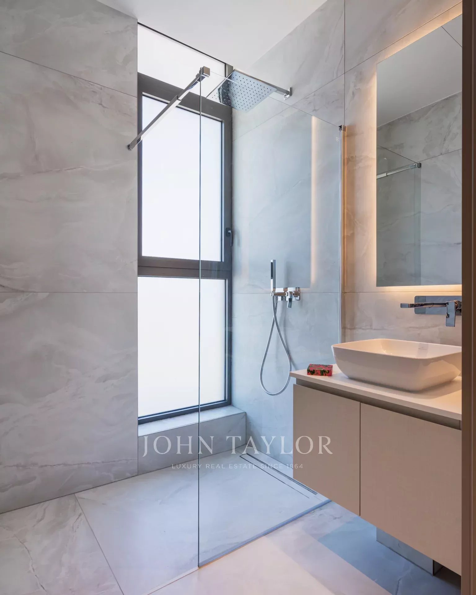 Das Interieur überzeugt durch italienisches Parkett, keramische Oberflächen in Marmoroptik, Fußbodenheizung und ein verdecktes VRV-Klimasystem. Die maßgefertigte italienische Küche ist mit hochwertigen Einbaugeräten und Laminam-Arbeitsplatten ausgestattet. Die Bäder bieten luxuriöse Ausstattung und begehbare Duschen.